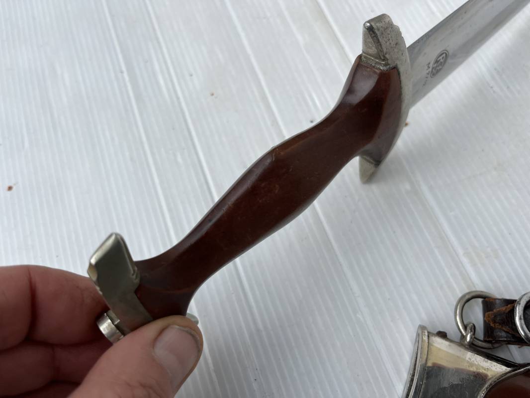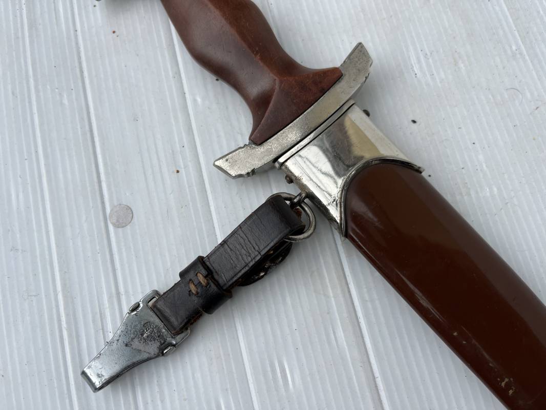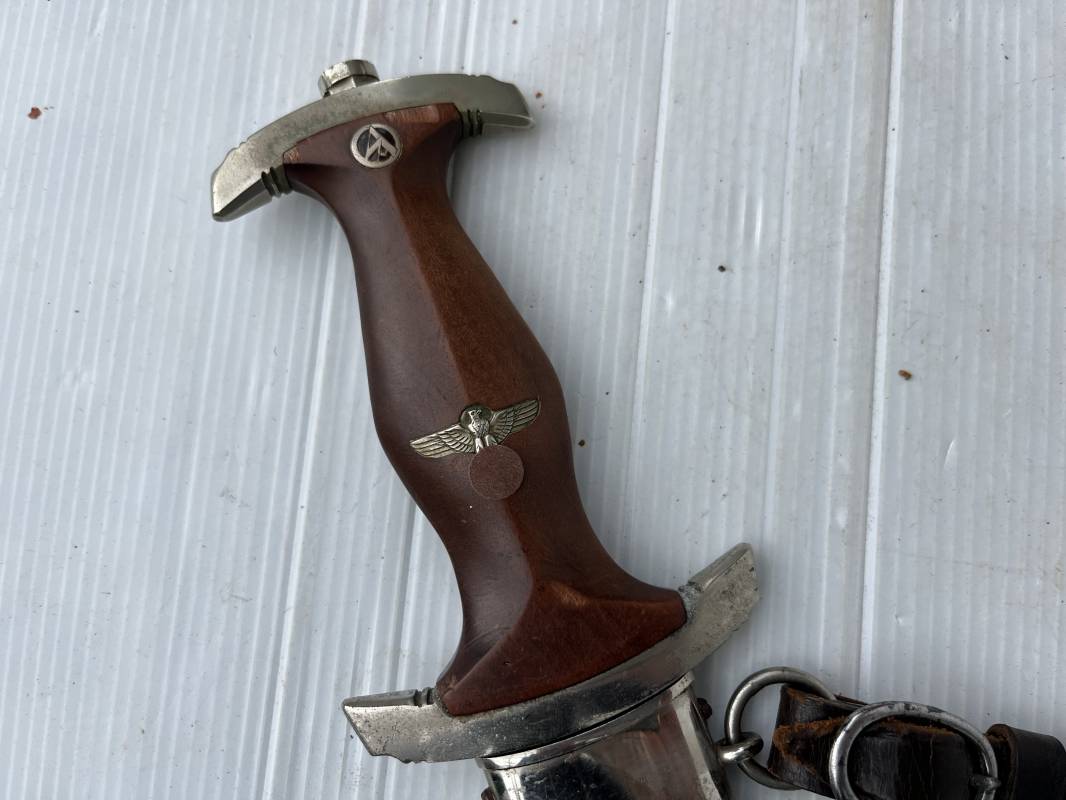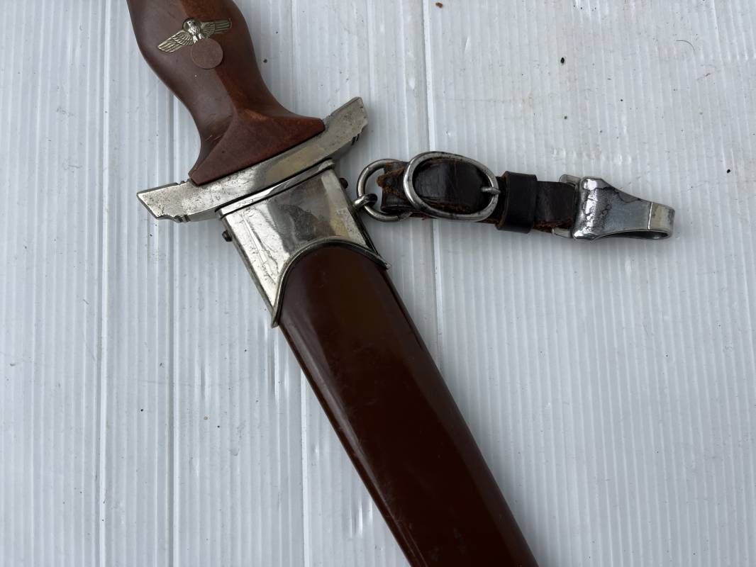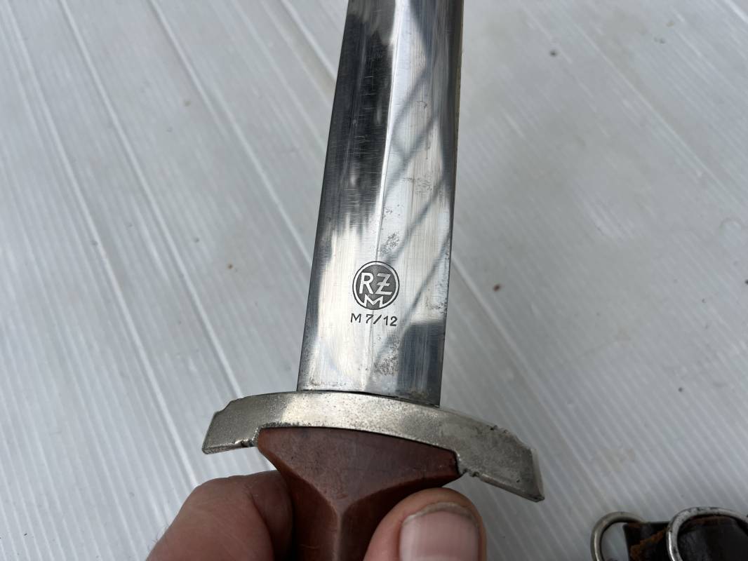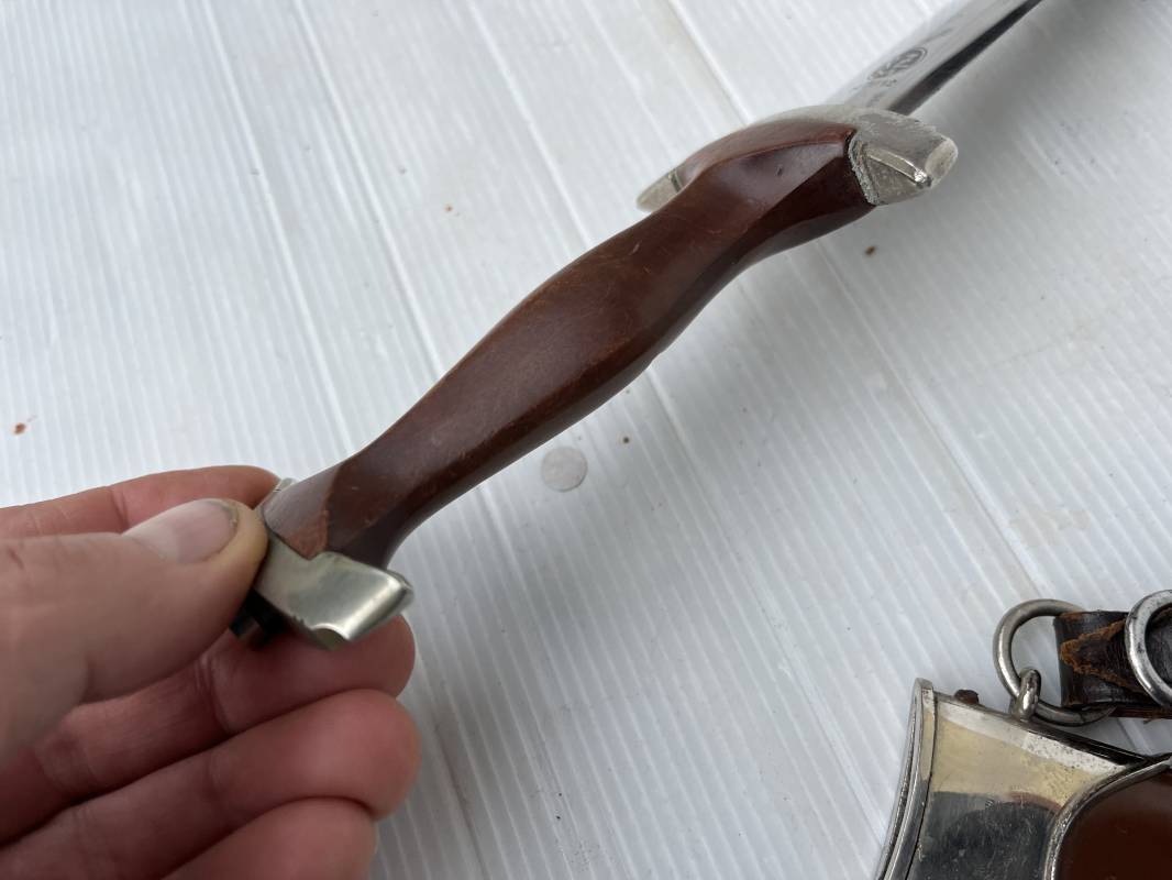 Très belle dague SA modèle 1933 et sa bélière.Modéle dis ' léger' avec garnitures en fer nickelé 1938/45 ; Marquage code fabricant RZM M7/12 (Carl Robert Kaldenbach waffenfabrik Max Weyers Berg Solingen ) ). Poignée en ébène marron ( a noté deux tout petits eclats de bois sur le haut de la poignée voir photos ) . Insigne émaillé SA. Aigle en maillechort . Garnitures de poignée et pommeau en fer nickelé. Belle lame avec devise. Marquage fabricant au dos. Fourreau métallique avec peinture brun/marron d'origine, garnitures en fer nickelé. Bouterole . Toutes les visses sont présentes . Anneau. Bélière en cuir marron. Crochet et boucle à un ardillon. Marquage logo fabricant sur crochet . Bel ensemble homogène en bel état. Très belle dague SA du modèle dit "léger". Fabrication 1938/45. Ref 22133