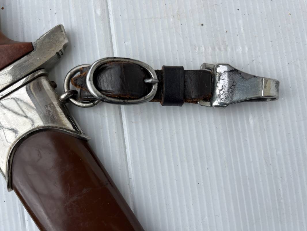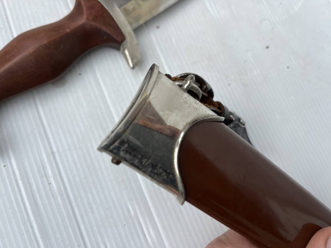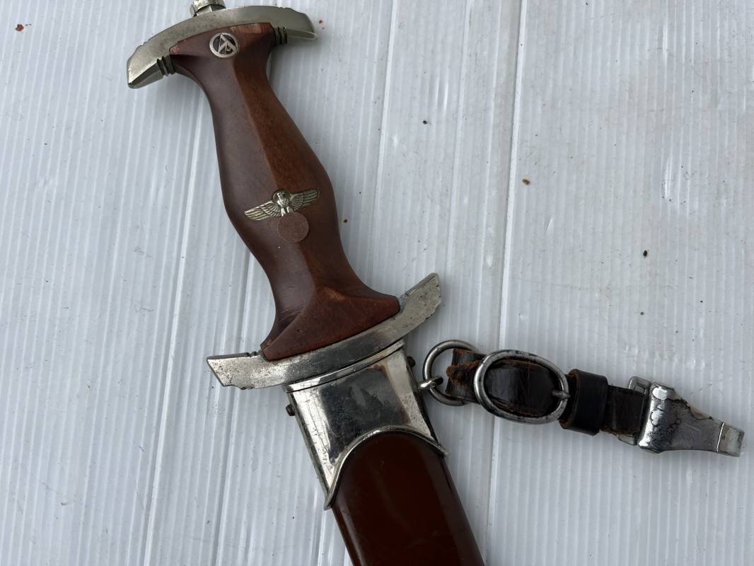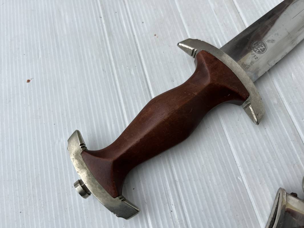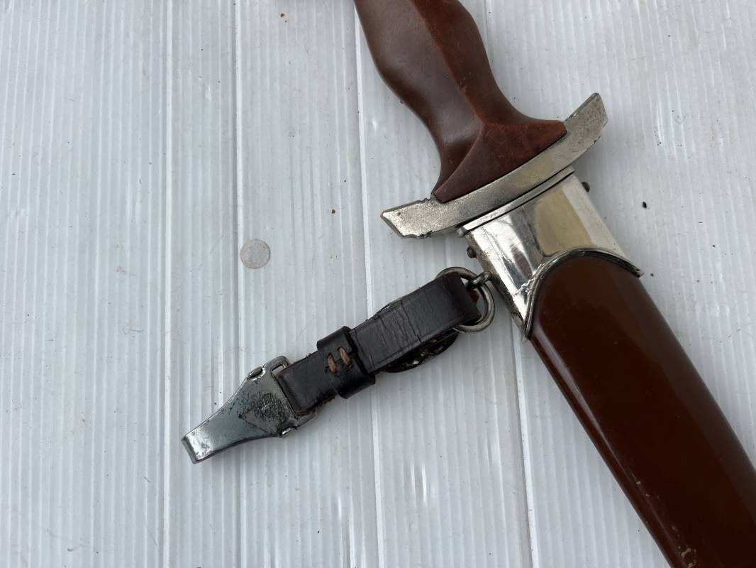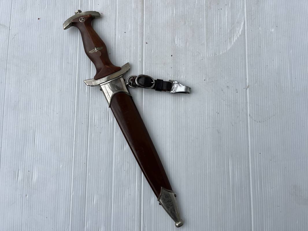 Très belle dague SA modèle 1933 et sa bélière.Modéle dis ' léger' avec garnitures en fer nickelé 1938/45 ; Marquage code fabricant RZM M7/12 (Carl Robert Kaldenbach waffenfabrik Max Weyers Berg Solingen ) ). Poignée en ébène marron ( a noté deux tout petits eclats de bois sur le haut de la poignée voir photos ) . Insigne émaillé SA. Aigle en maillechort . Garnitures de poignée et pommeau en fer nickelé. Belle lame avec devise. Marquage fabricant au dos. Fourreau métallique avec peinture brun/marron d'origine, garnitures en fer nickelé. Bouterole . Toutes les visses sont présentes . Anneau. Bélière en cuir marron. Crochet et boucle à un ardillon. Marquage logo fabricant sur crochet . Bel ensemble homogène en bel état. Très belle dague SA du modèle dit "léger". Fabrication 1938/45. Ref 22133