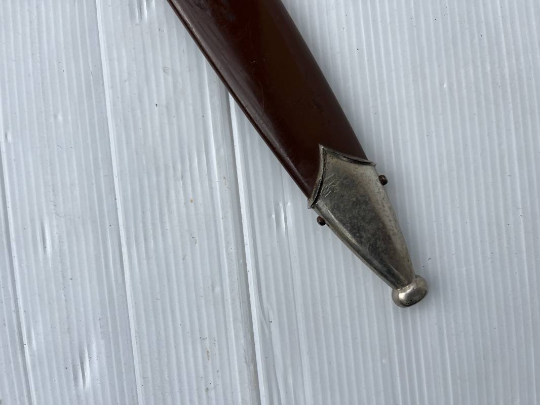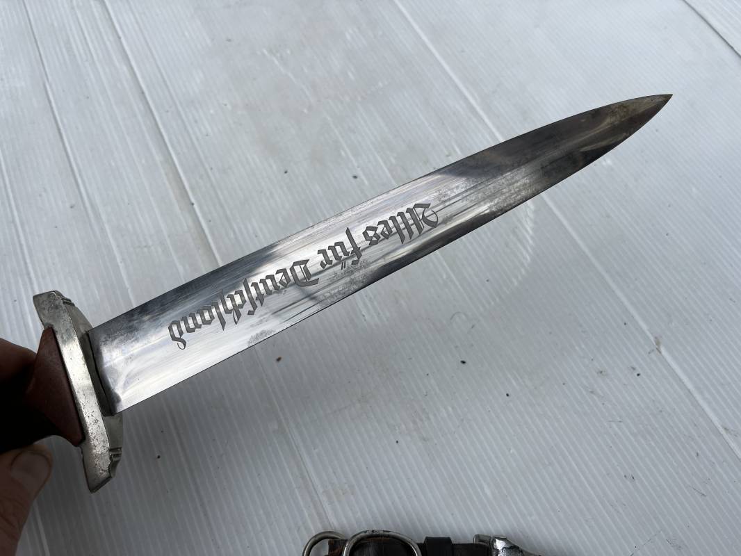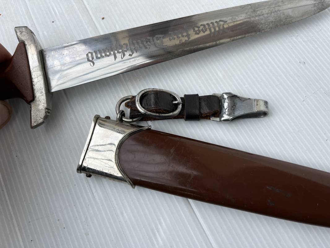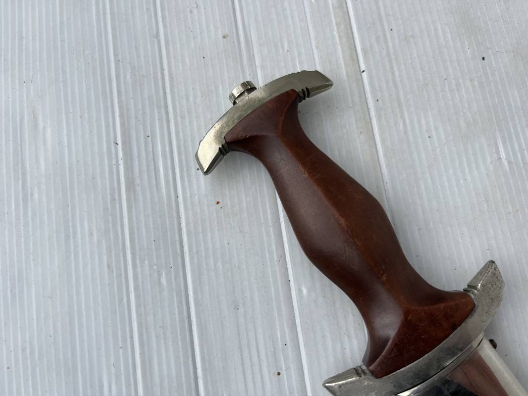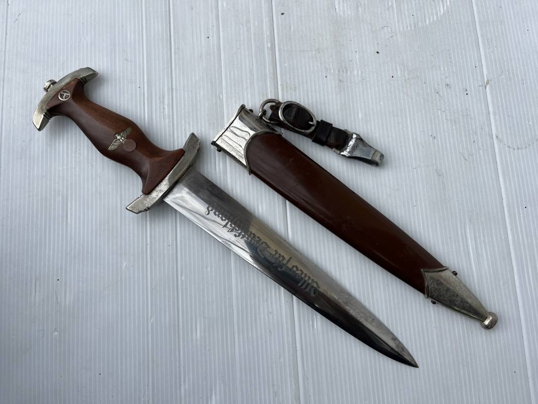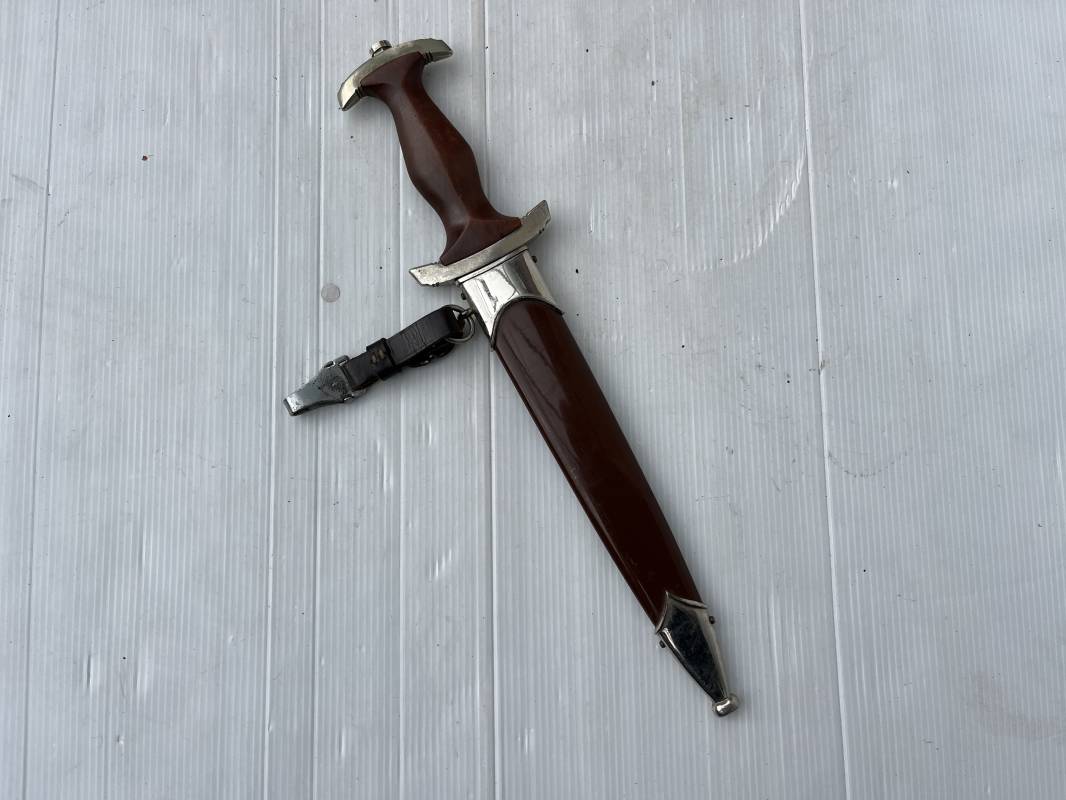 Très belle dague SA modèle 1933 et sa bélière.Modéle dis ' léger' avec garnitures en fer nickelé 1938/45 ; Marquage code fabricant RZM M7/12 (Carl Robert Kaldenbach waffenfabrik Max Weyers Berg Solingen ) ). Poignée en ébène marron ( a noté deux tout petits eclats de bois sur le haut de la poignée voir photos ) . Insigne émaillé SA. Aigle en maillechort . Garnitures de poignée et pommeau en fer nickelé. Belle lame avec devise. Marquage fabricant au dos. Fourreau métallique avec peinture brun/marron d'origine, garnitures en fer nickelé. Bouterole . Toutes les visses sont présentes . Anneau. Bélière en cuir marron. Crochet et boucle à un ardillon. Marquage logo fabricant sur crochet . Bel ensemble homogène en bel état. Très belle dague SA du modèle dit "léger". Fabrication 1938/45. Ref 22133