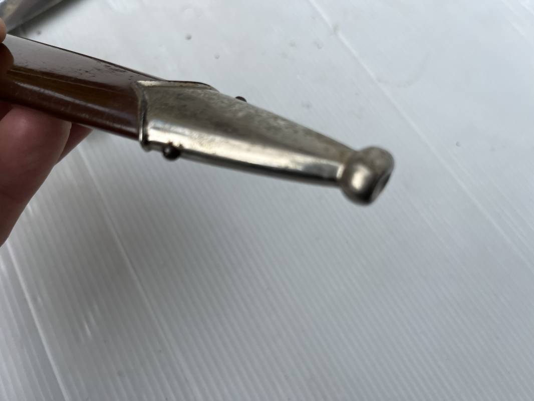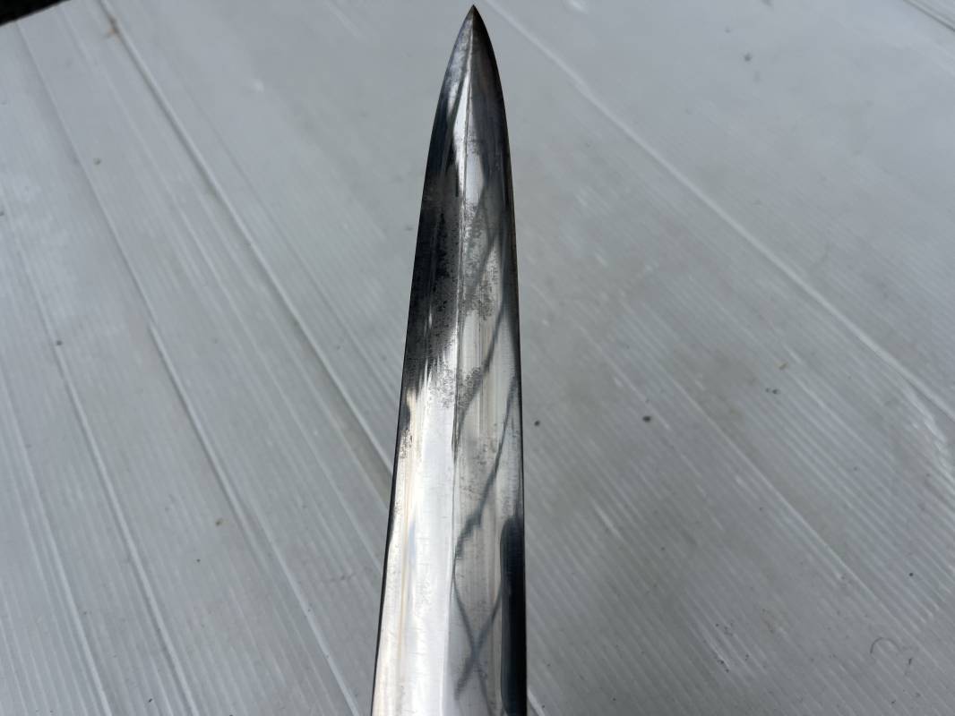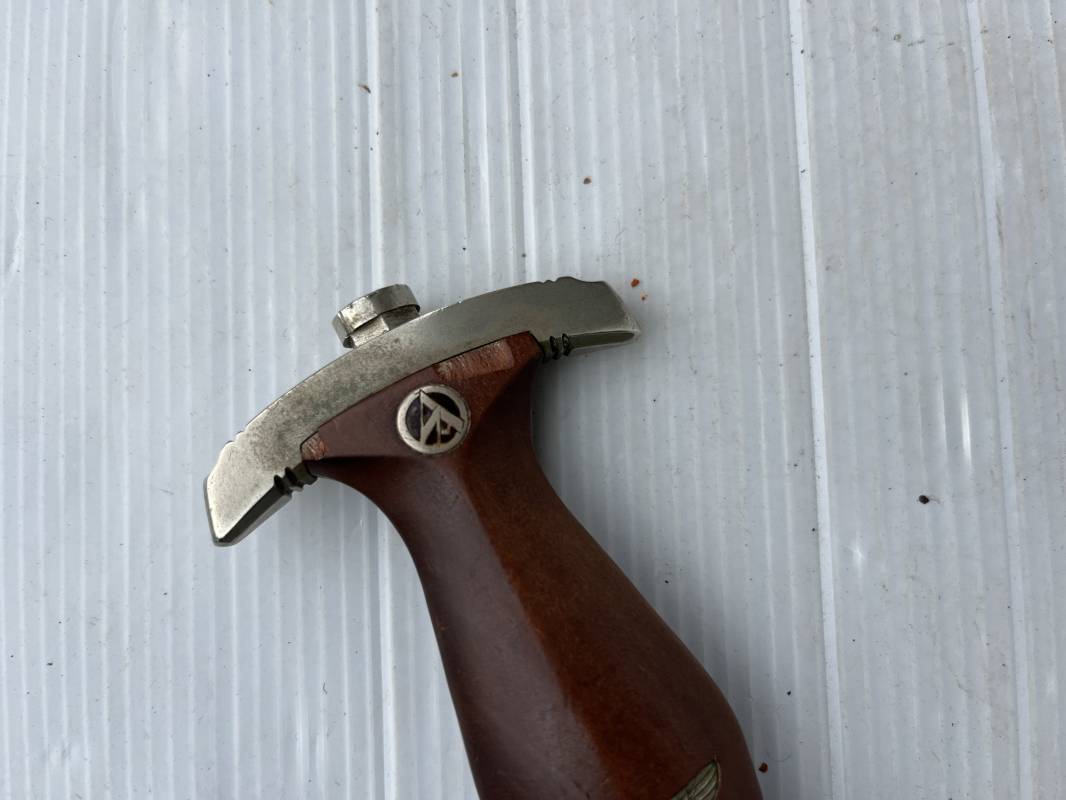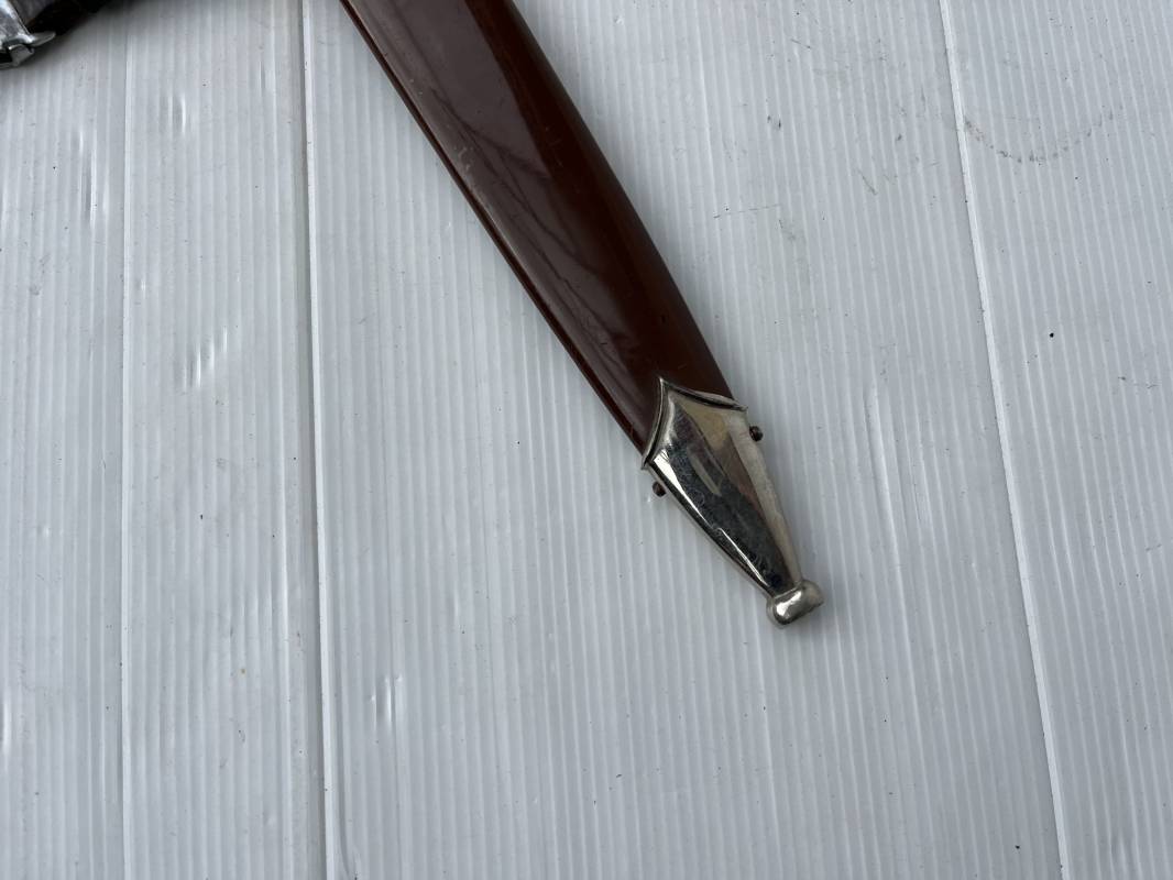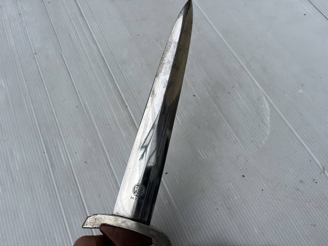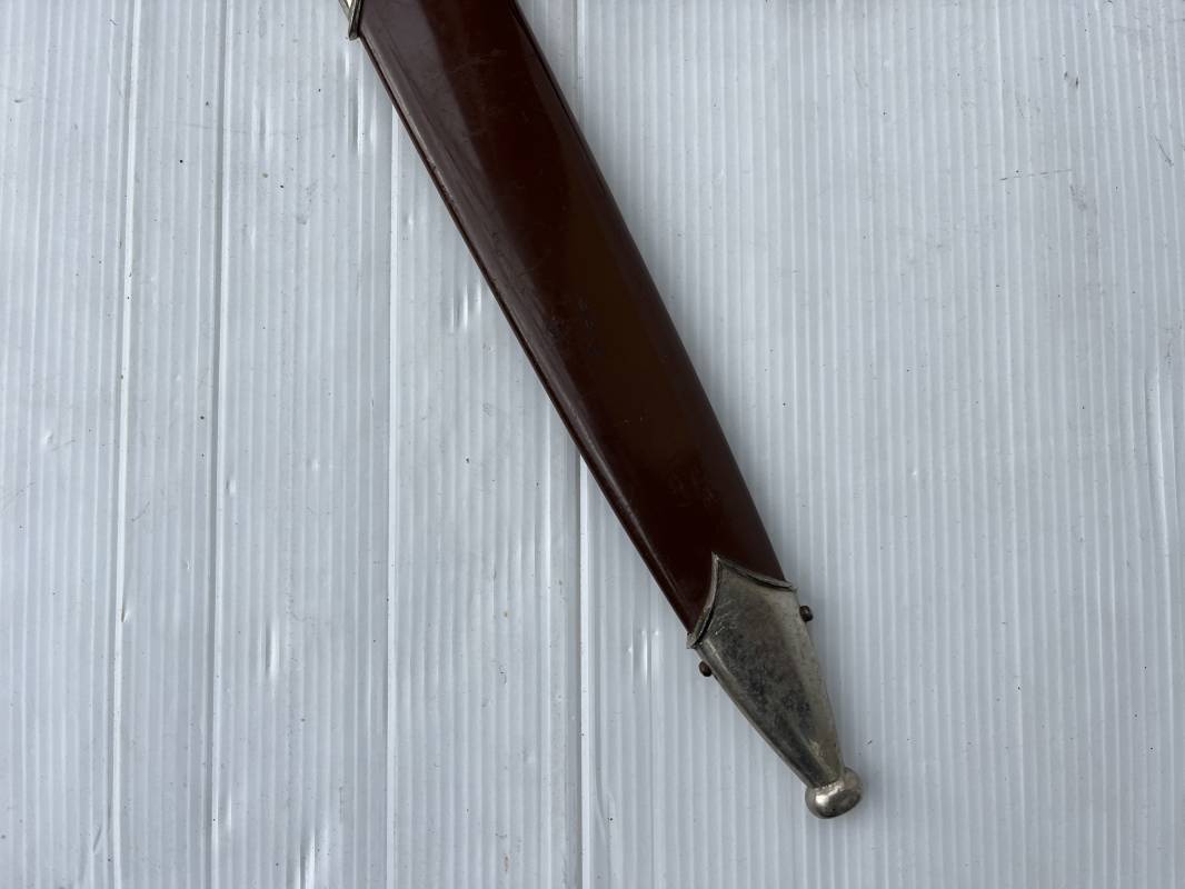 Très belle dague SA modèle 1933 et sa bélière.Modéle dis ' léger' avec garnitures en fer nickelé 1938/45 ; Marquage code fabricant RZM M7/12 (Carl Robert Kaldenbach waffenfabrik Max Weyers Berg Solingen ) ). Poignée en ébène marron ( a noté deux tout petits eclats de bois sur le haut de la poignée voir photos ) . Insigne émaillé SA. Aigle en maillechort . Garnitures de poignée et pommeau en fer nickelé. Belle lame avec devise. Marquage fabricant au dos. Fourreau métallique avec peinture brun/marron d'origine, garnitures en fer nickelé. Bouterole . Toutes les visses sont présentes . Anneau. Bélière en cuir marron. Crochet et boucle à un ardillon. Marquage logo fabricant sur crochet . Bel ensemble homogène en bel état. Très belle dague SA du modèle dit "léger". Fabrication 1938/45. Ref 22133