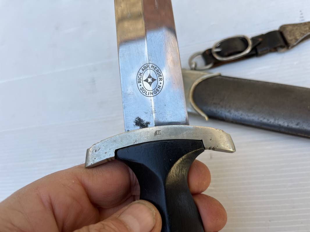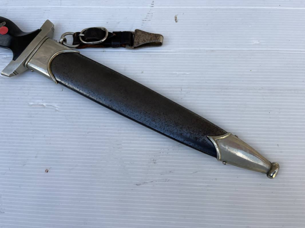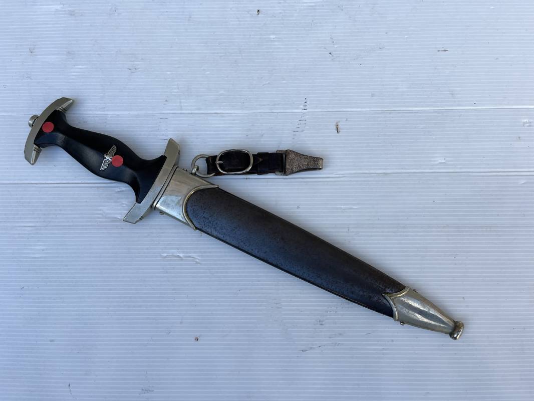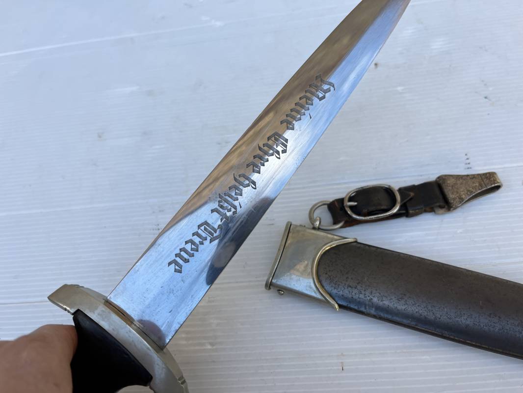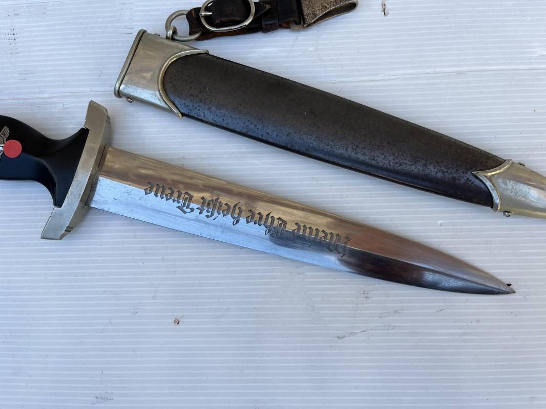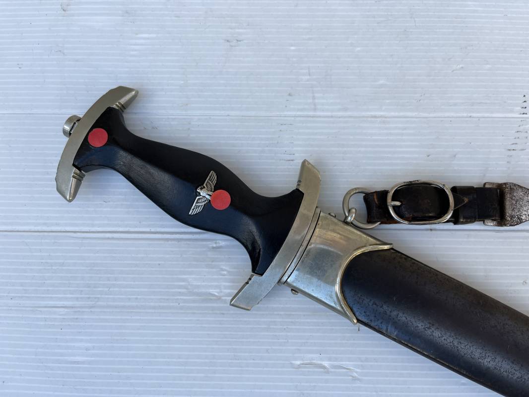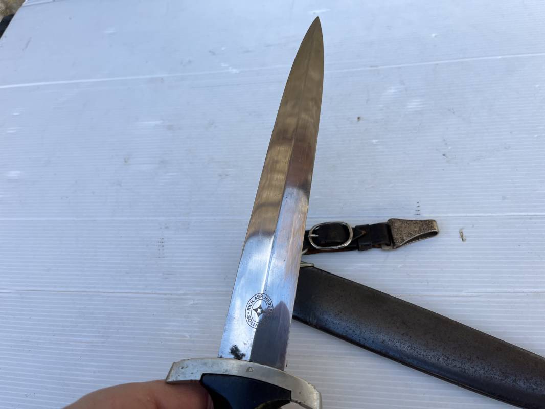 Très belle dague SS modèle 1933 et sa bélière.Dague du modéle dit lourd avec garnitures en maillechort ( fabrication 1933/38) Marquage fabricant Rich Abr Herder Solingen . Poignée en ébène noir . Insigne émaillé SS. Aigle en maillechort . Garnitures de poignée et pommeau en maillechort .Marquage sur le derrière de la Garde ' III' ( SS gruppe SPREE) Belle lame avec devise 'Meine Ehre Heisst Treue' ( mon honneur s'appelle fidelité ) . Marquage fabricant au dos. Fourreau métallique parkérisé noir d'origine, garnitures en maillechort . Bouterole en bel état .Toutes les visses sont présentes . Anneau. Bélière en cuir noir . Crochet et boucle à un ardillon. Marquage sur crochet RZM M5/71 OLC et marquage sur cuir RZM L2 /441/3 . Bel ensemble homogène en trés bel état. Très belle dague SS du modèle dit "Lourd". Fabrication 1933/38.Une trés belle dague , définitive en collection Ref 19603