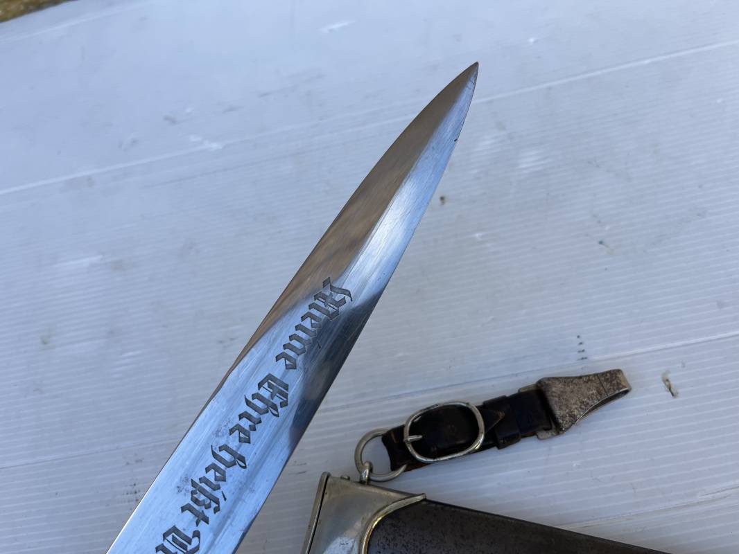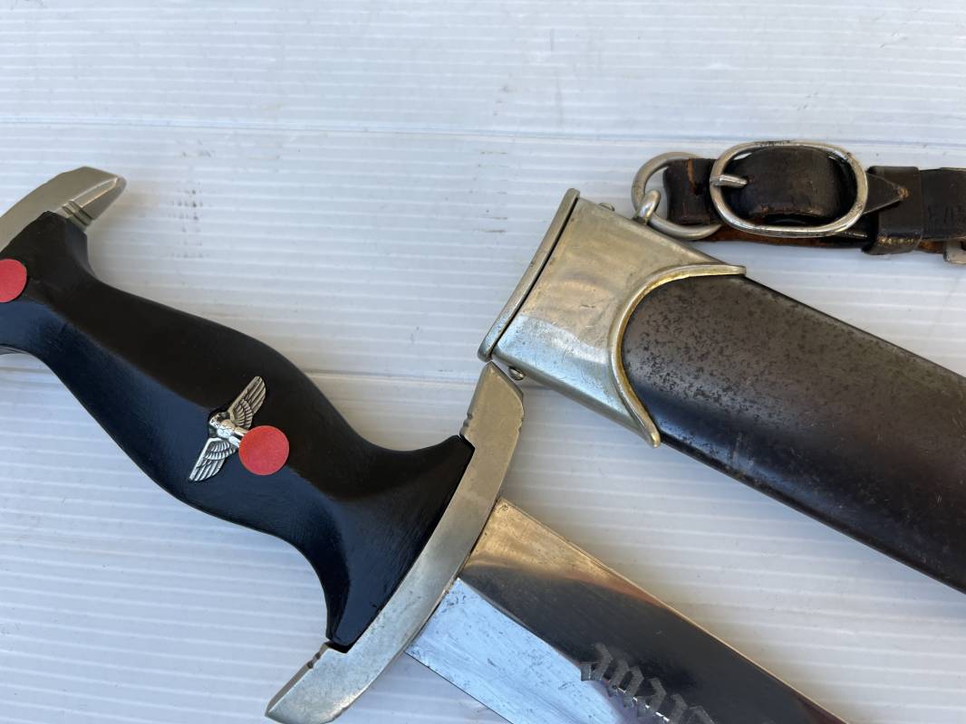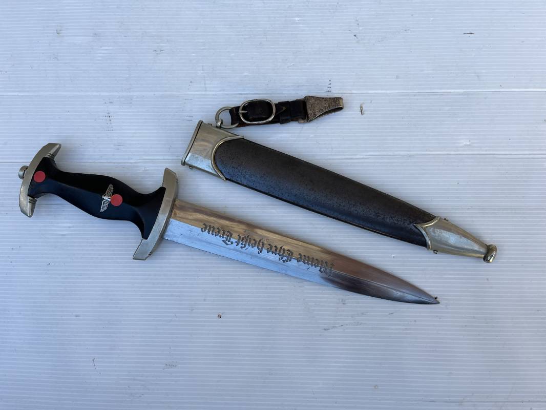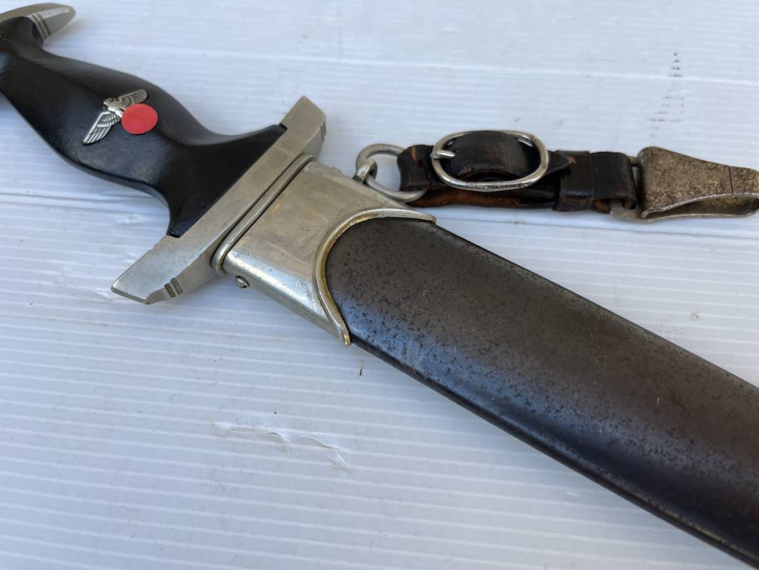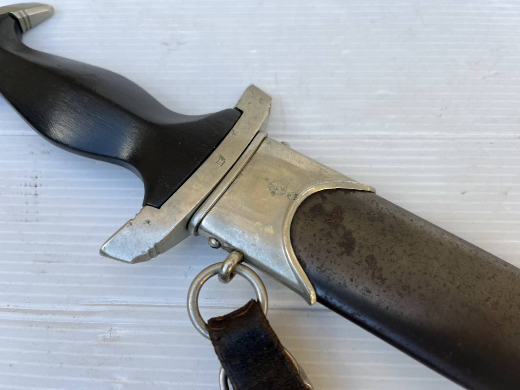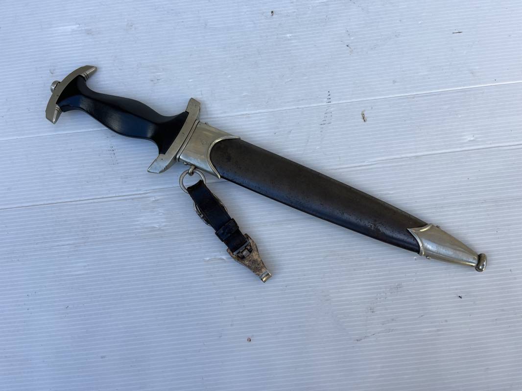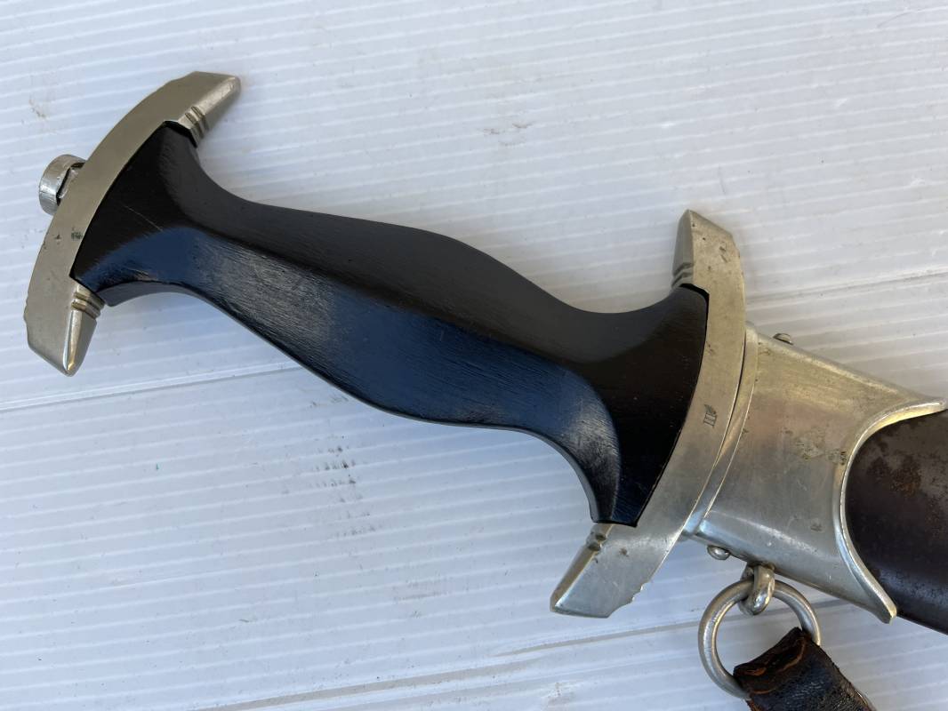 Très belle dague SS modèle 1933 et sa bélière.Dague du modéle dit lourd avec garnitures en maillechort ( fabrication 1933/38) Marquage fabricant Rich Abr Herder Solingen . Poignée en ébène noir . Insigne émaillé SS. Aigle en maillechort . Garnitures de poignée et pommeau en maillechort .Marquage sur le derrière de la Garde ' III' ( SS gruppe SPREE) Belle lame avec devise 'Meine Ehre Heisst Treue' ( mon honneur s'appelle fidelité ) . Marquage fabricant au dos. Fourreau métallique parkérisé noir d'origine, garnitures en maillechort . Bouterole en bel état .Toutes les visses sont présentes . Anneau. Bélière en cuir noir . Crochet et boucle à un ardillon. Marquage sur crochet RZM M5/71 OLC et marquage sur cuir RZM L2 /441/3 . Bel ensemble homogène en trés bel état. Très belle dague SS du modèle dit "Lourd". Fabrication 1933/38.Une trés belle dague , définitive en collection Ref 19603