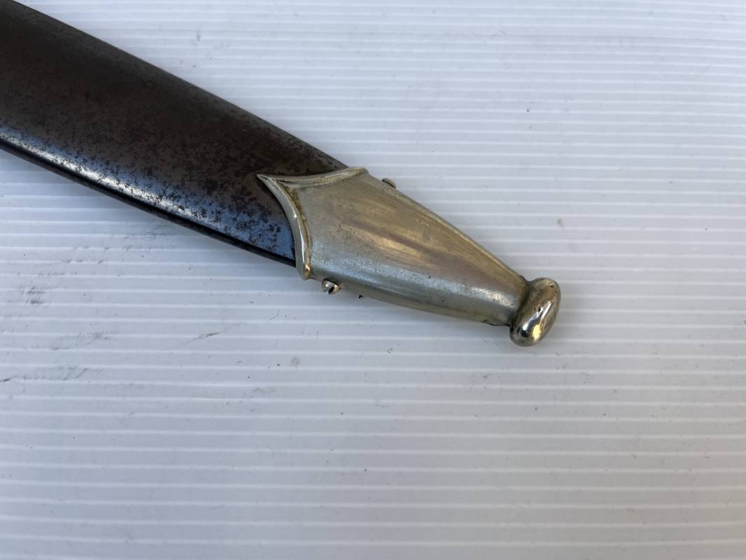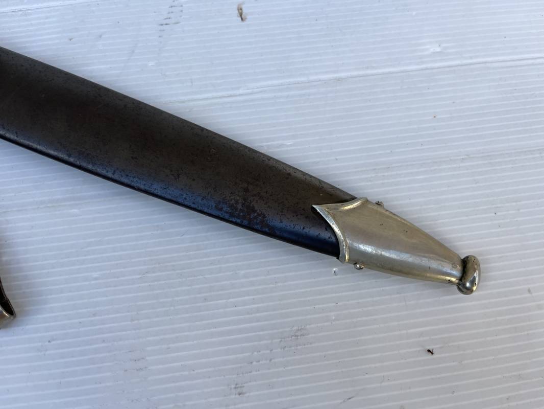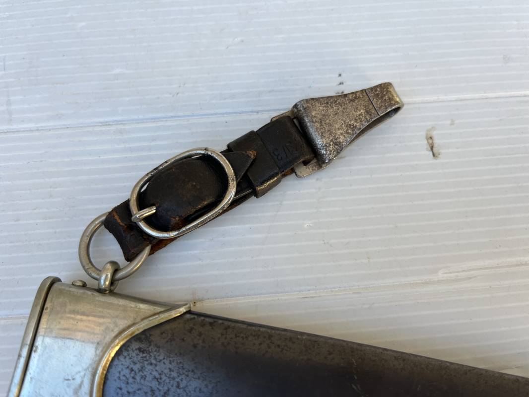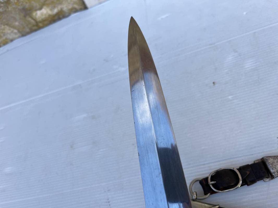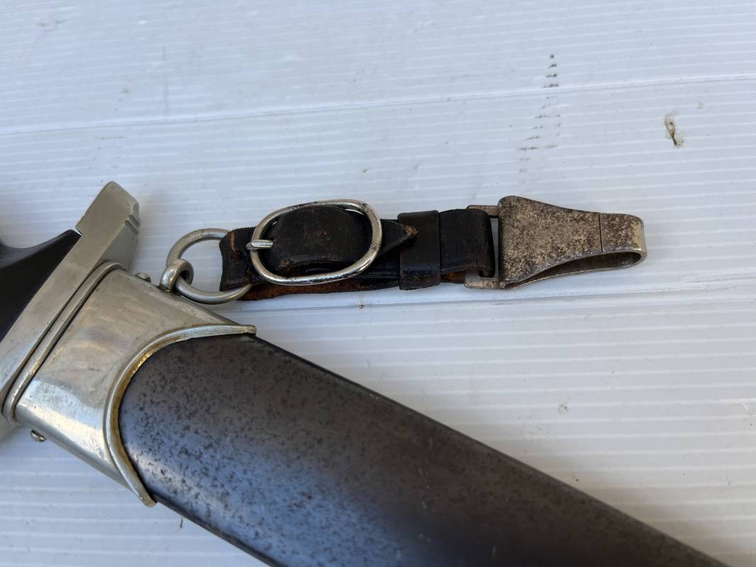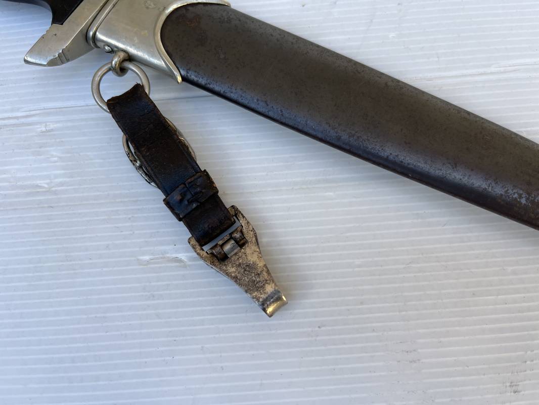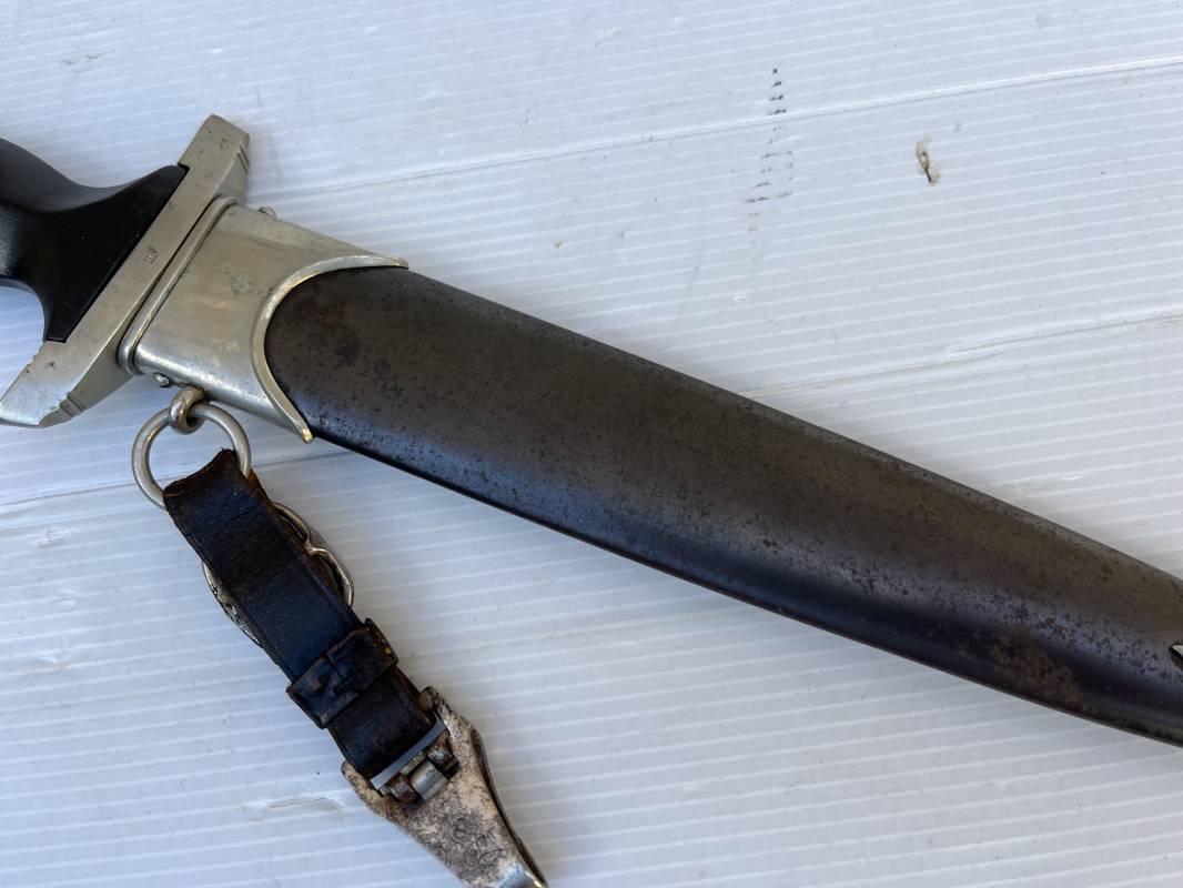 Très belle dague SS modèle 1933 et sa bélière.Dague du modéle dit lourd avec garnitures en maillechort ( fabrication 1933/38) Marquage fabricant Rich Abr Herder Solingen . Poignée en ébène noir . Insigne émaillé SS. Aigle en maillechort . Garnitures de poignée et pommeau en maillechort .Marquage sur le derrière de la Garde ' III' ( SS gruppe SPREE) Belle lame avec devise 'Meine Ehre Heisst Treue' ( mon honneur s'appelle fidelité ) . Marquage fabricant au dos. Fourreau métallique parkérisé noir d'origine, garnitures en maillechort . Bouterole en bel état .Toutes les visses sont présentes . Anneau. Bélière en cuir noir . Crochet et boucle à un ardillon. Marquage sur crochet RZM M5/71 OLC et marquage sur cuir RZM L2 /441/3 . Bel ensemble homogène en trés bel état. Très belle dague SS du modèle dit "Lourd". Fabrication 1933/38.Une trés belle dague , définitive en collection Ref 19603