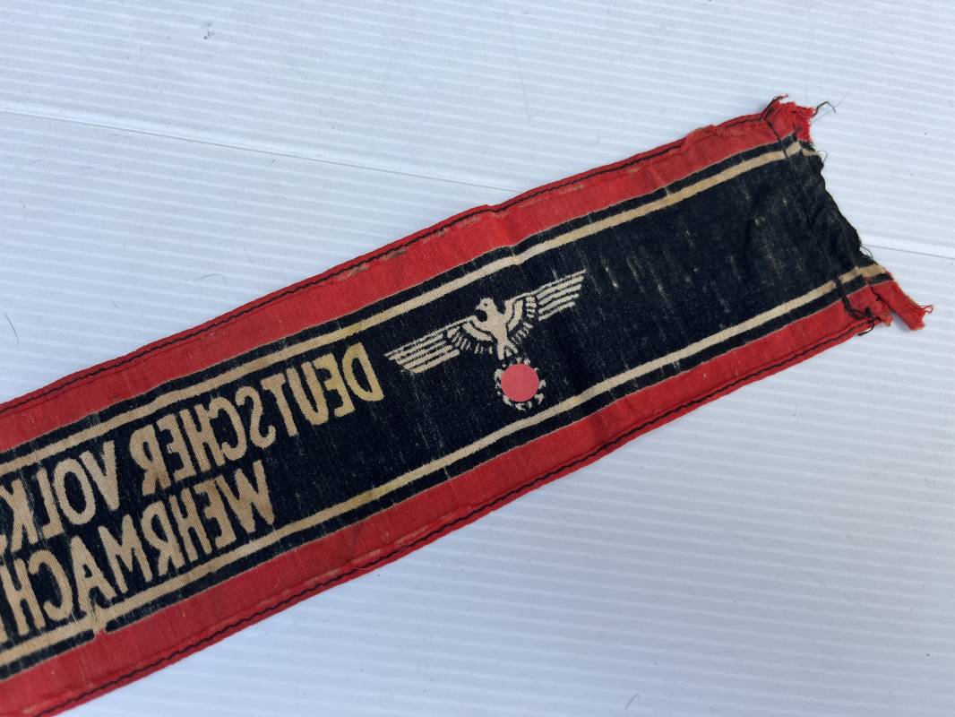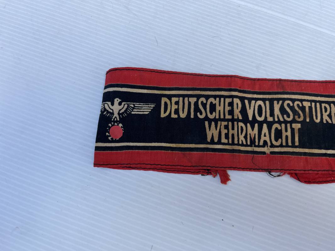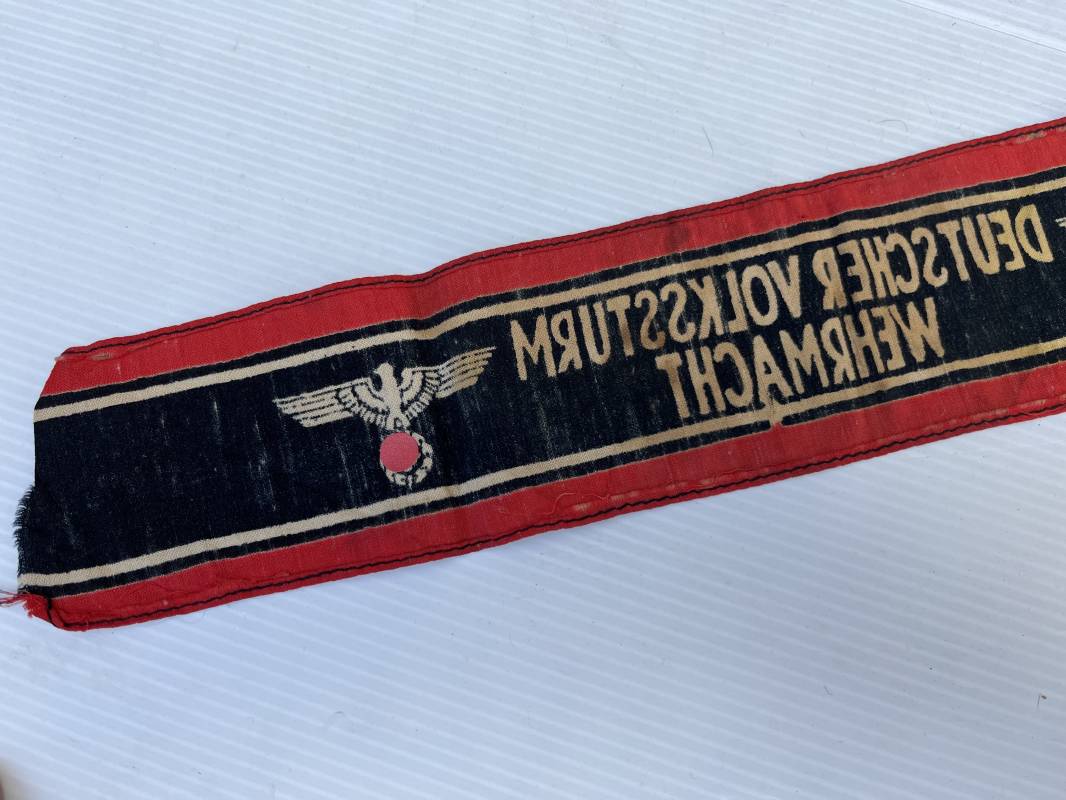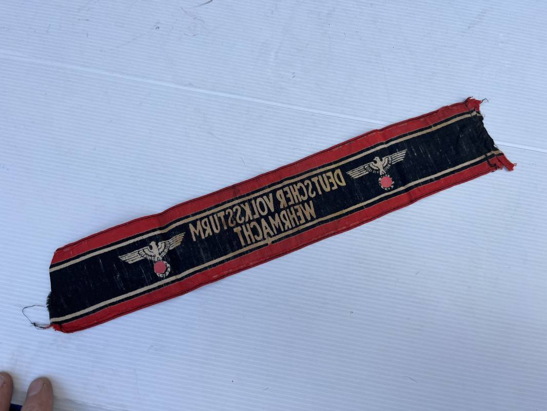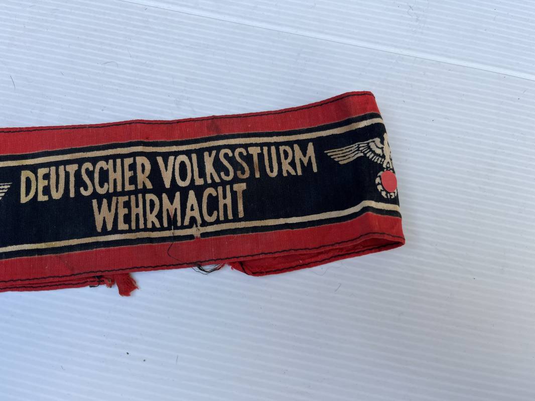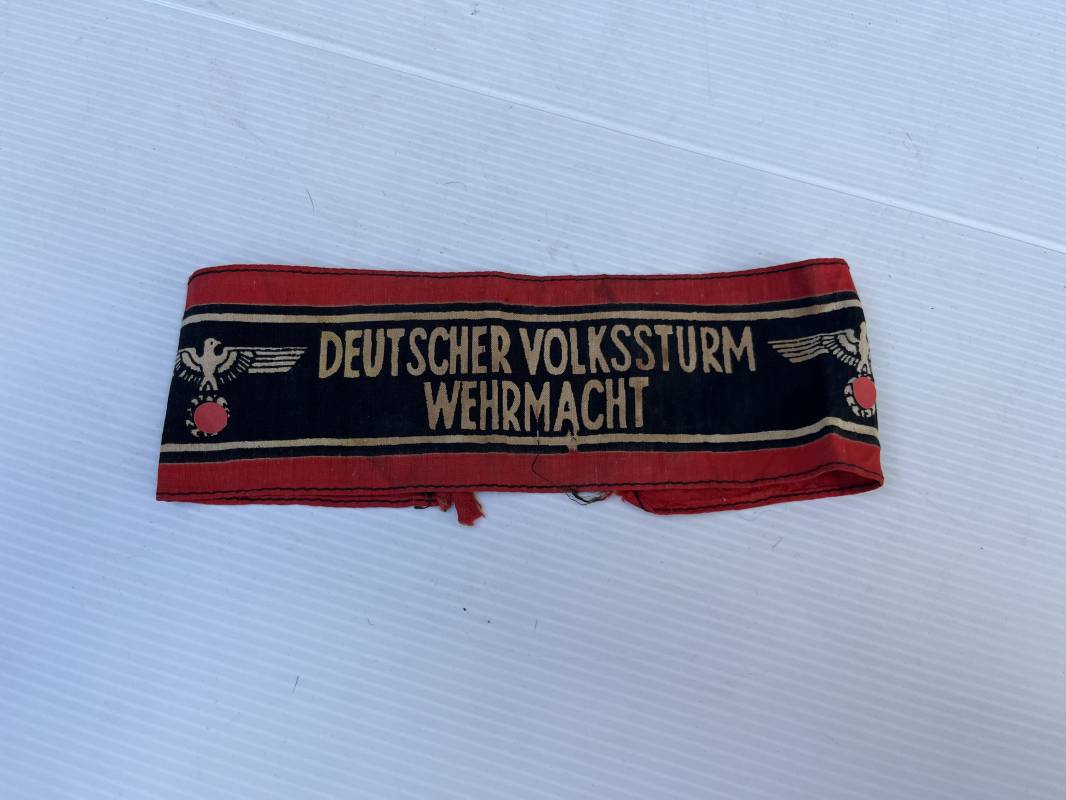 Rare brassard Volksturm ( armée du peuple) 1945 . Ce brassard a été ramené d Allemagne par un vétéran francais de la 1ére Armée . Provenance succession familiale . Bande en coton imprimé Dimensions 210X75 mm . Légèrement portée en parfait état 1945 Trés belle patine générale . Piéce historique des derniers combattants du 3éme Reich Ref 19806