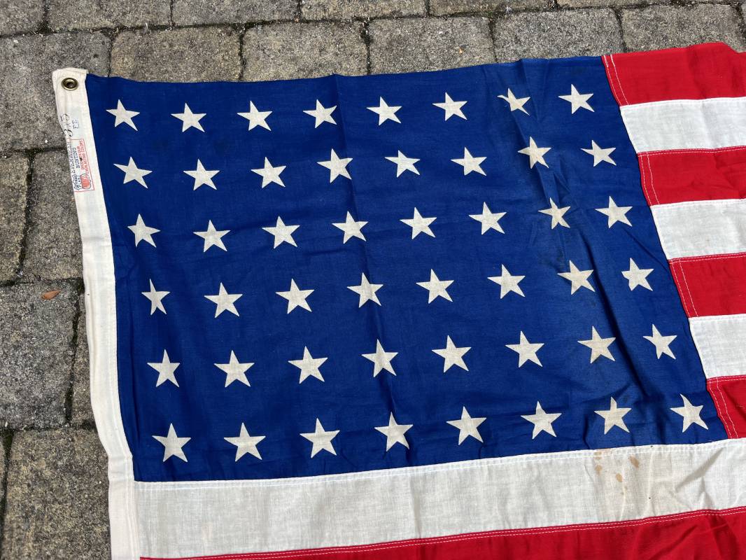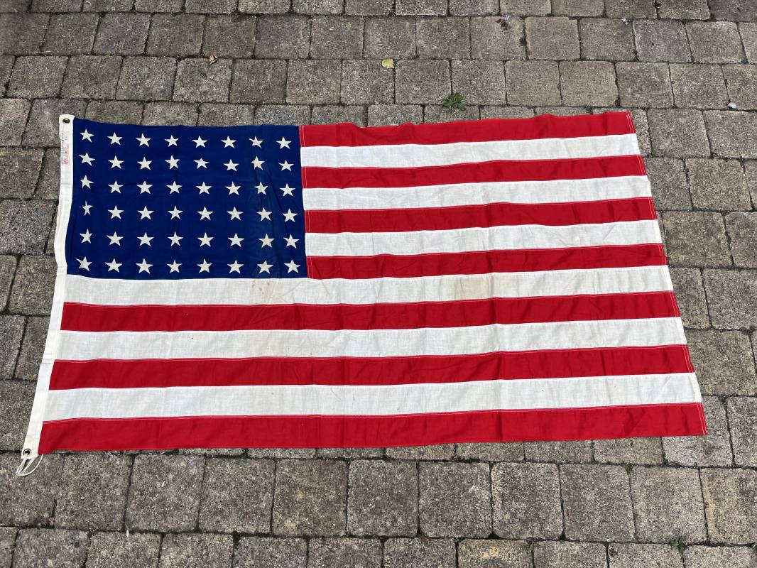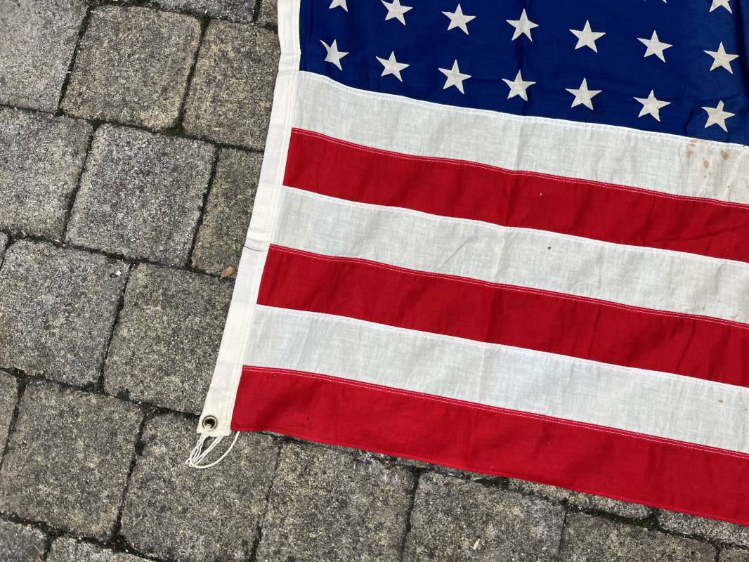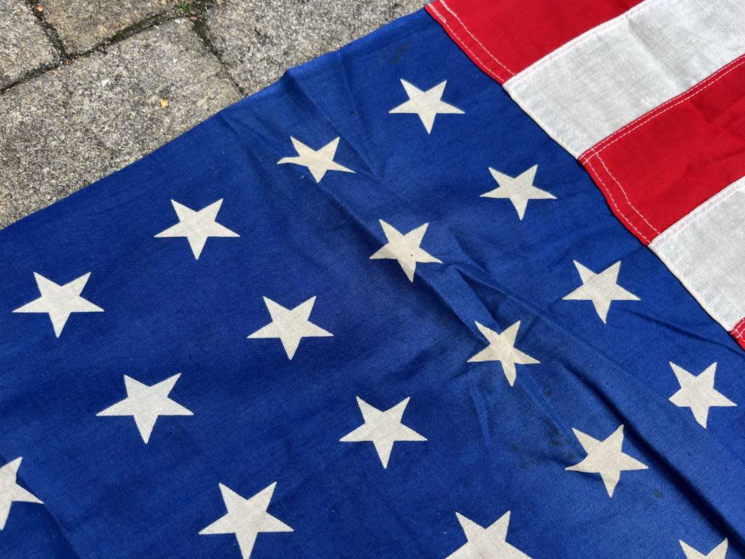 Beau drapeau américain 48 étoiles et 13 Bandes . Confection en coton . Montage en en plusieurs coupons . Etoiles soie blanches imprimées Dimensions 90 X 168 cm Bande de renfort en coton blanc . Oeillets laiton et cordon en coton de fixation . Marquage encre fabricant DETTRAS Flag Products . Tampon encre dimensions 3X5 FT . Drapeau en trés bel état . Tres Belles couleurs . Tres Beau drapeau de la libération 1942/45 Ref 19208