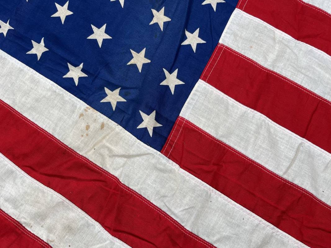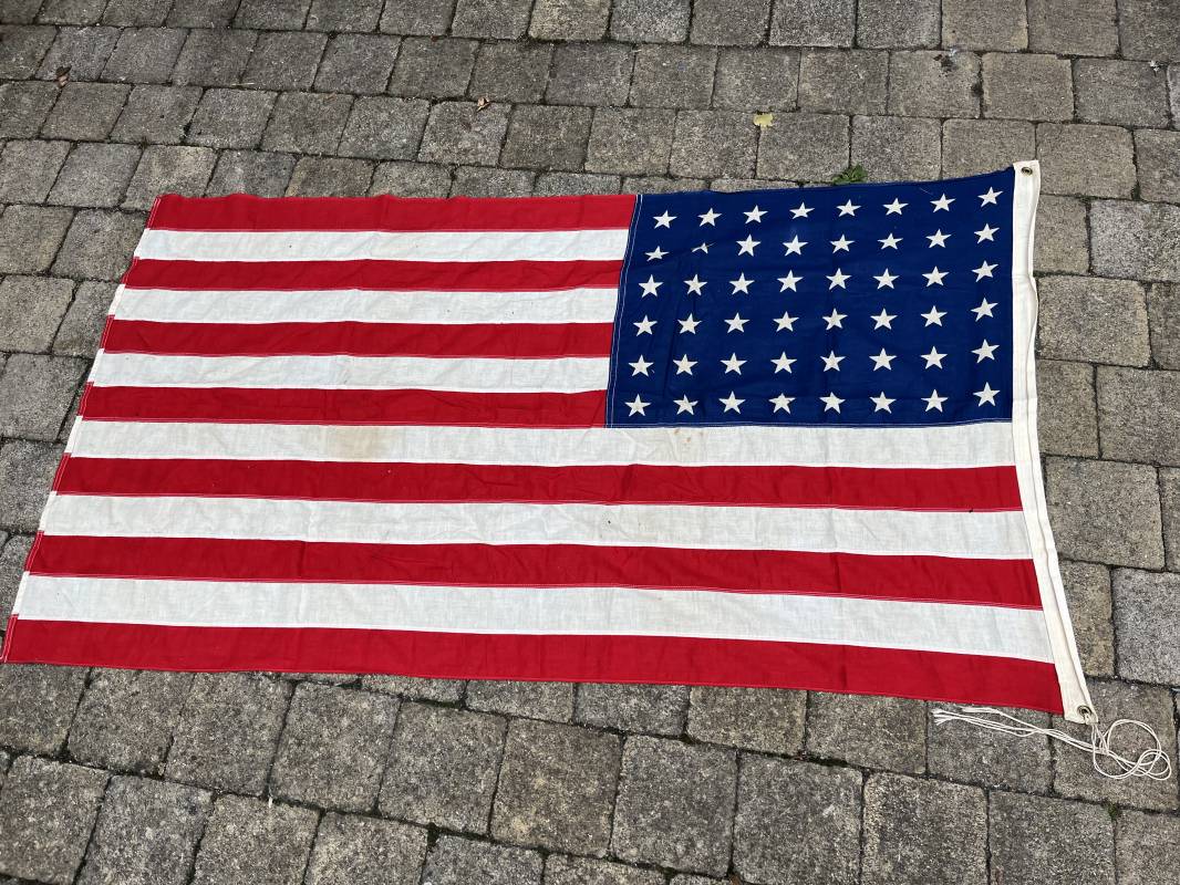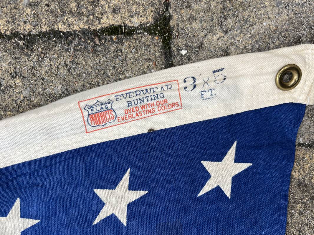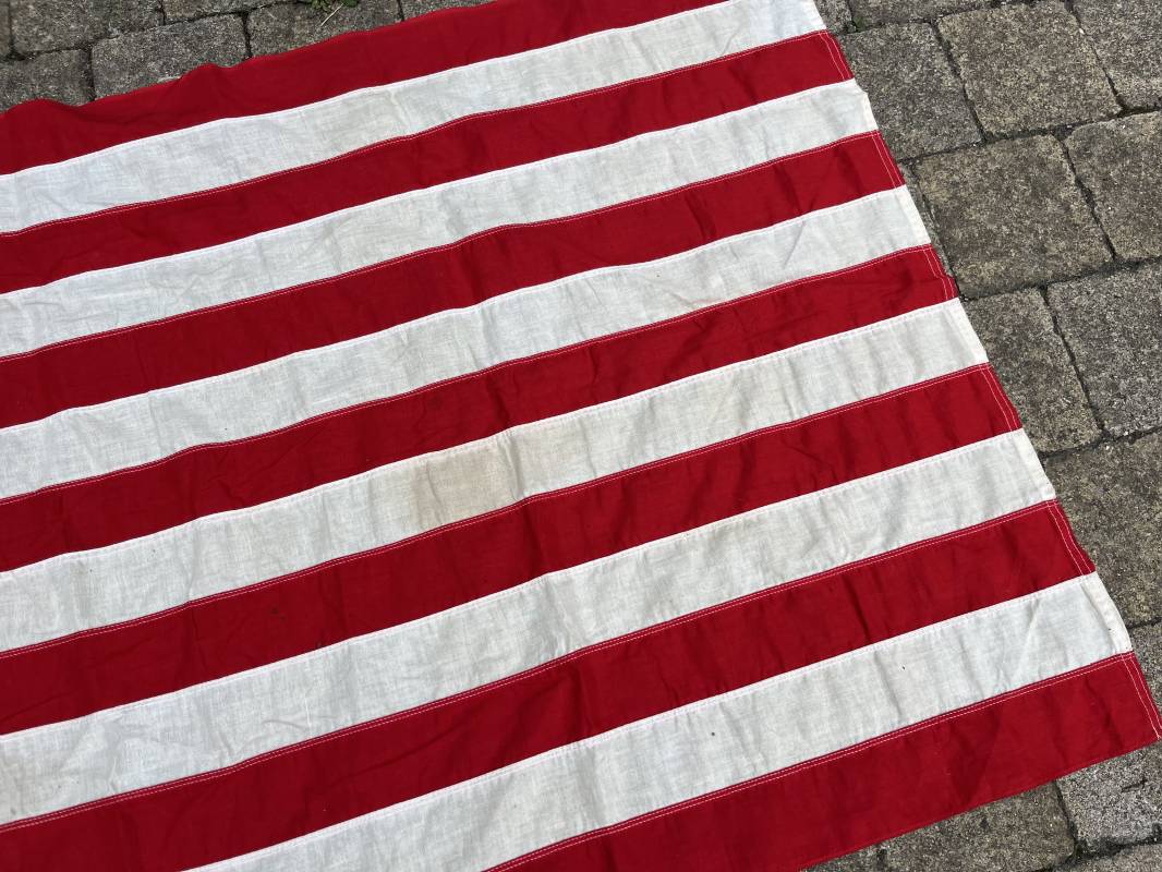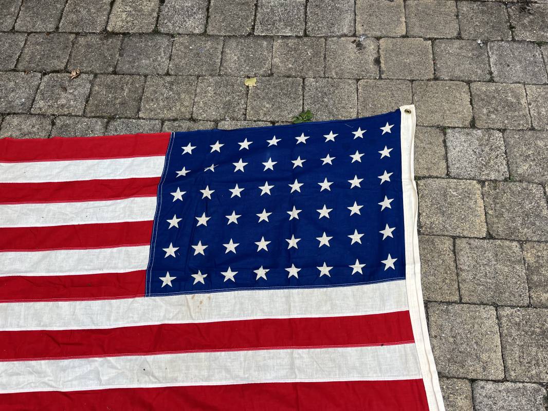 Beau drapeau américain 48 étoiles et 13 Bandes . Confection en coton . Montage en en plusieurs coupons . Etoiles soie blanches imprimées Dimensions 90 X 168 cm Bande de renfort en coton blanc . Oeillets laiton et cordon en coton de fixation . Marquage encre fabricant DETTRAS Flag Products . Tampon encre dimensions 3X5 FT . Drapeau en trés bel état . Tres Belles couleurs . Tres Beau drapeau de la libération 1942/45 Ref 19208