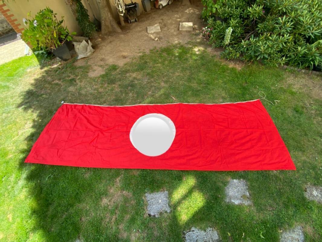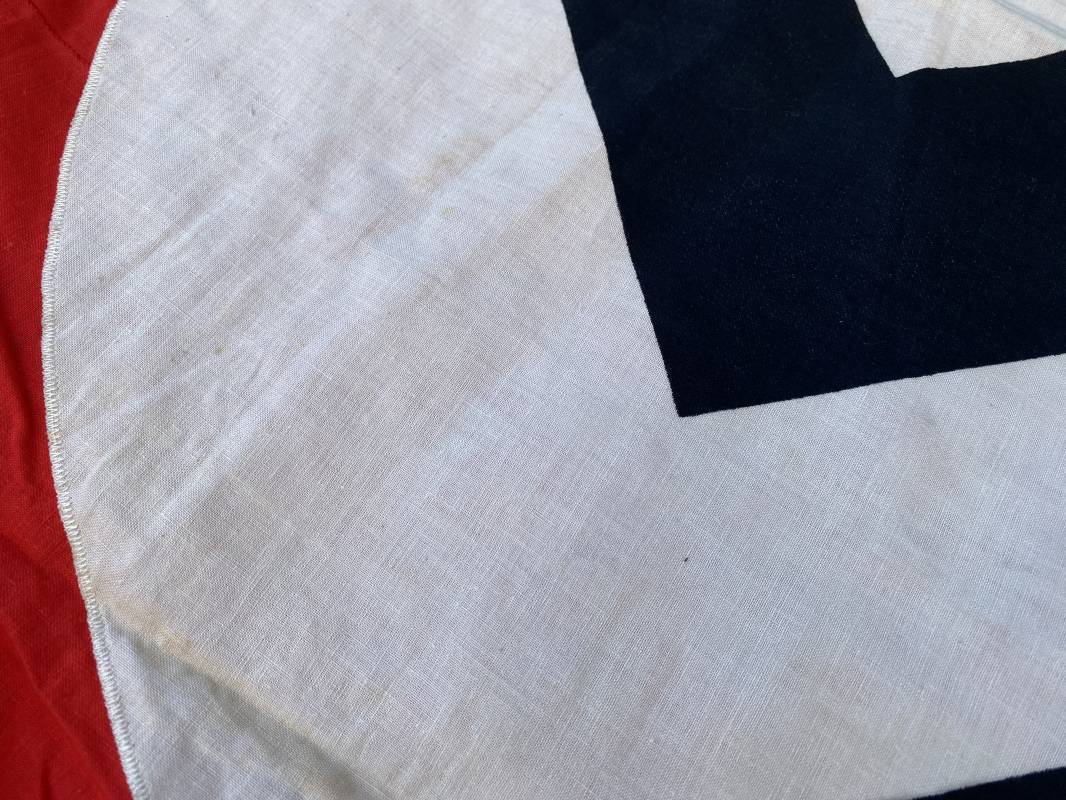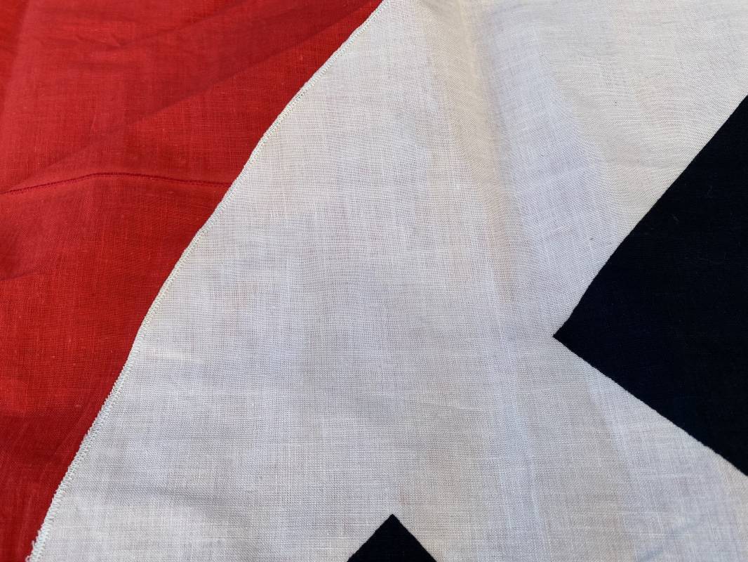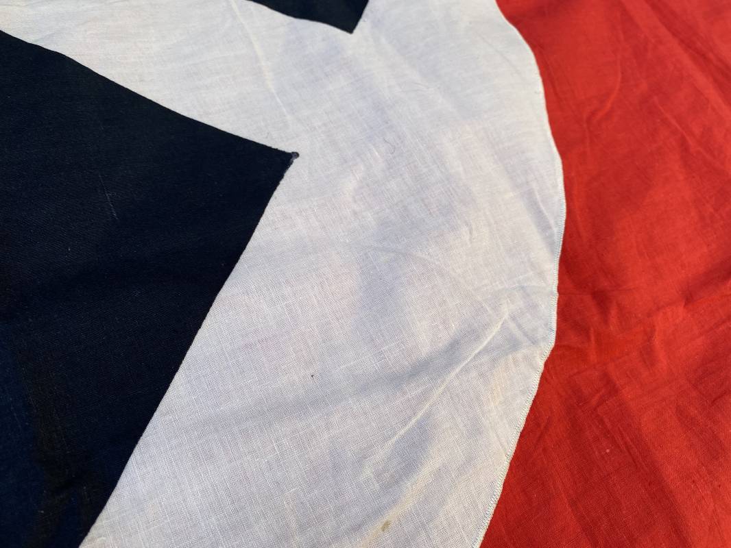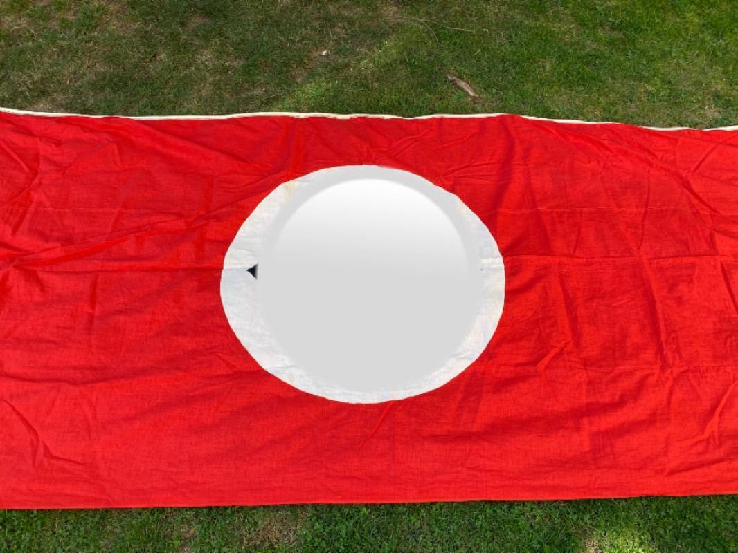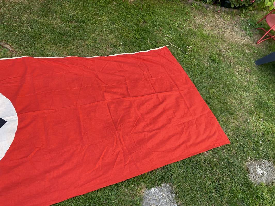 Très beau drapeau d'Etat du 3ème Reich trouvé en succession familiale. Ce drapeau a été récuperé en Allemagne par un vétéran de la 1er Armée Française. Drapeau double faces . Dimensions : 120x380 cm , fixation horizontale avec renfort coton et cordelette sur la longueur. Crochet en fer nickelé. Drapeau en coton rouge, croix imprimée sur rond blanc cousu. Légèrement utilisé en parfait état 1935/45. Ref 15773