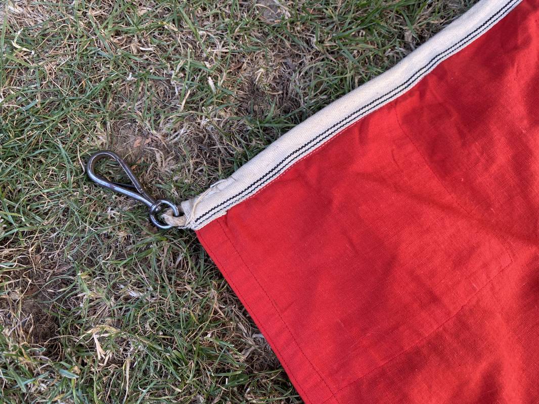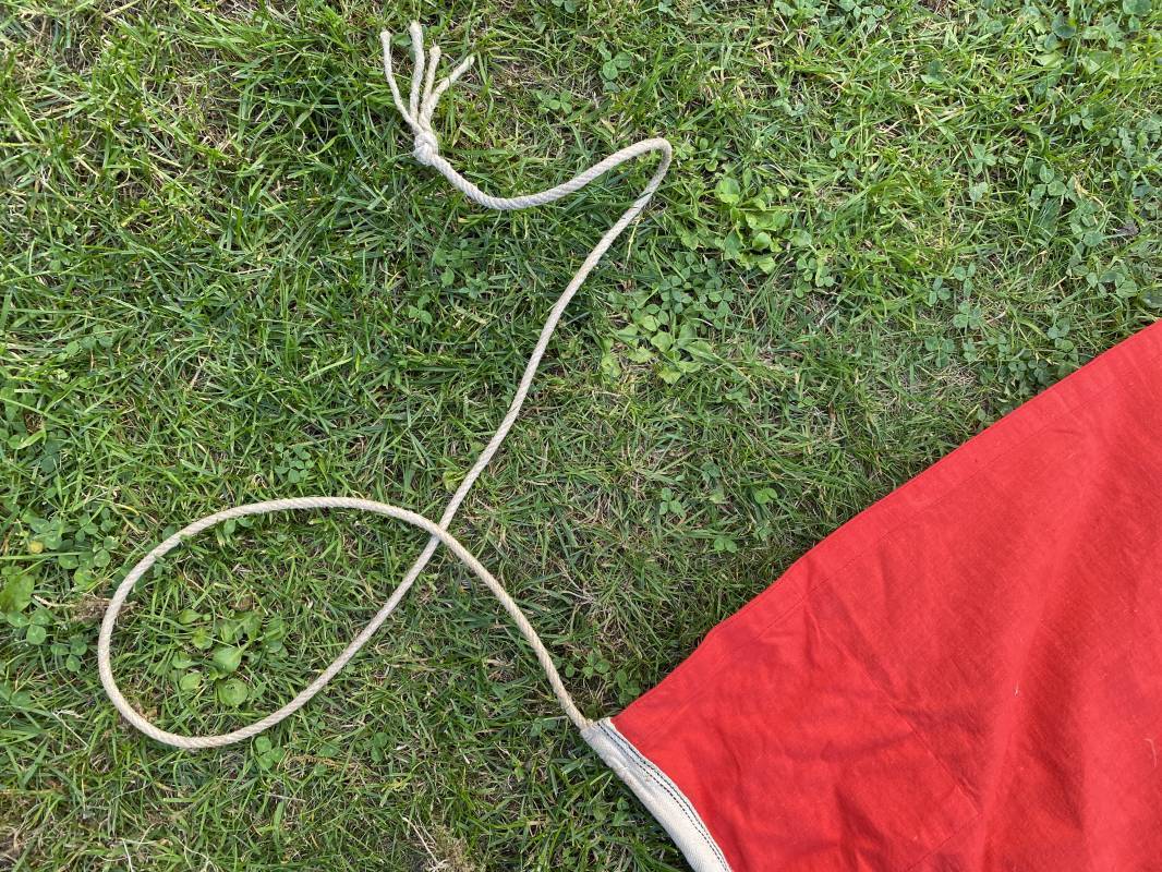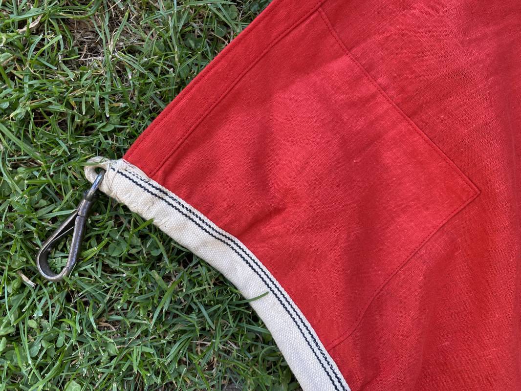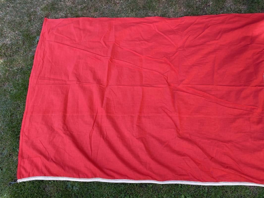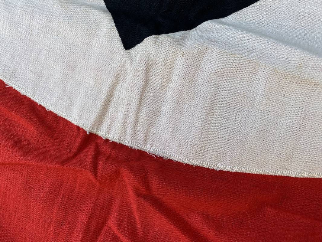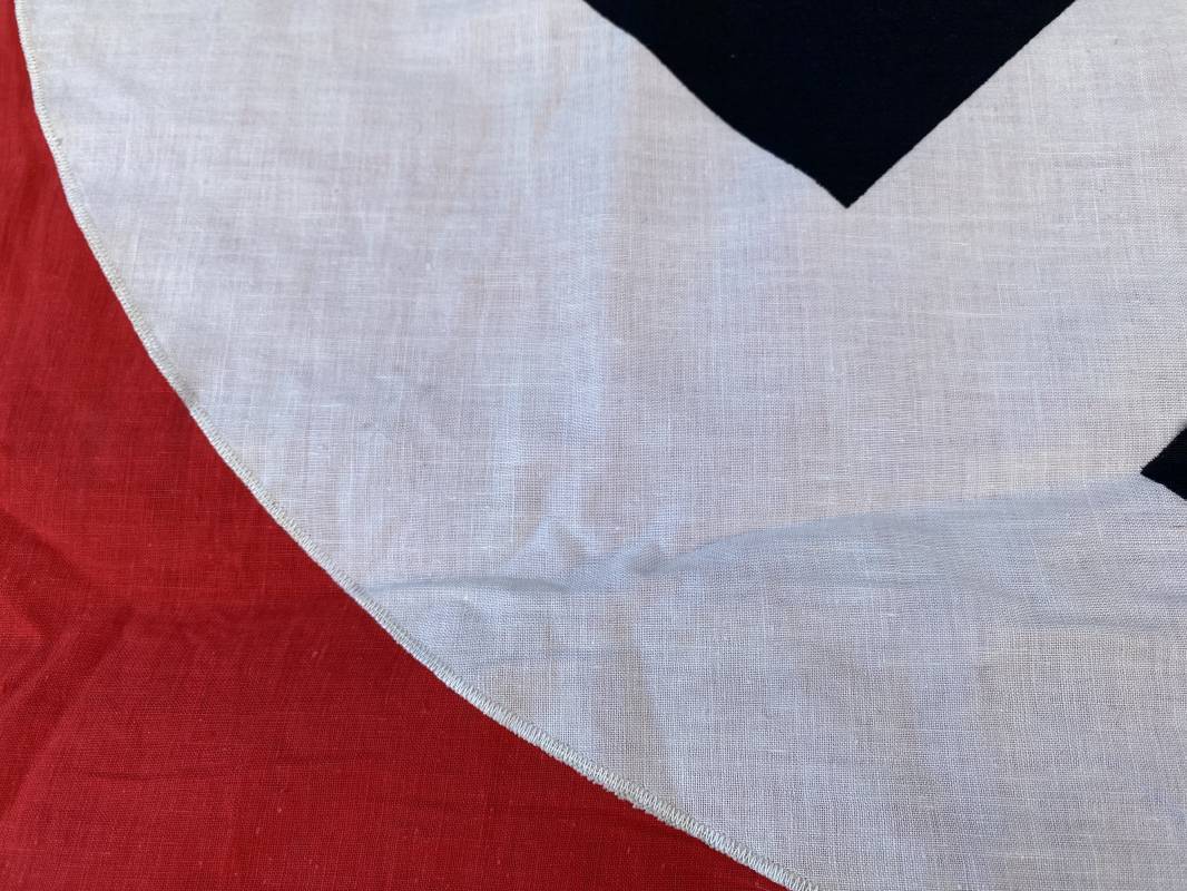 Très beau drapeau d'Etat du 3ème Reich trouvé en succession familiale. Ce drapeau a été récuperé en Allemagne par un vétéran de la 1er Armée Française. Drapeau double faces . Dimensions : 120x380 cm , fixation horizontale avec renfort coton et cordelette sur la longueur. Crochet en fer nickelé. Drapeau en coton rouge, croix imprimée sur rond blanc cousu. Légèrement utilisé en parfait état 1935/45. Ref 15773