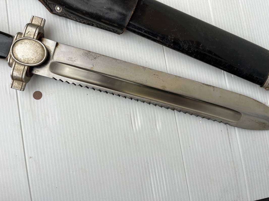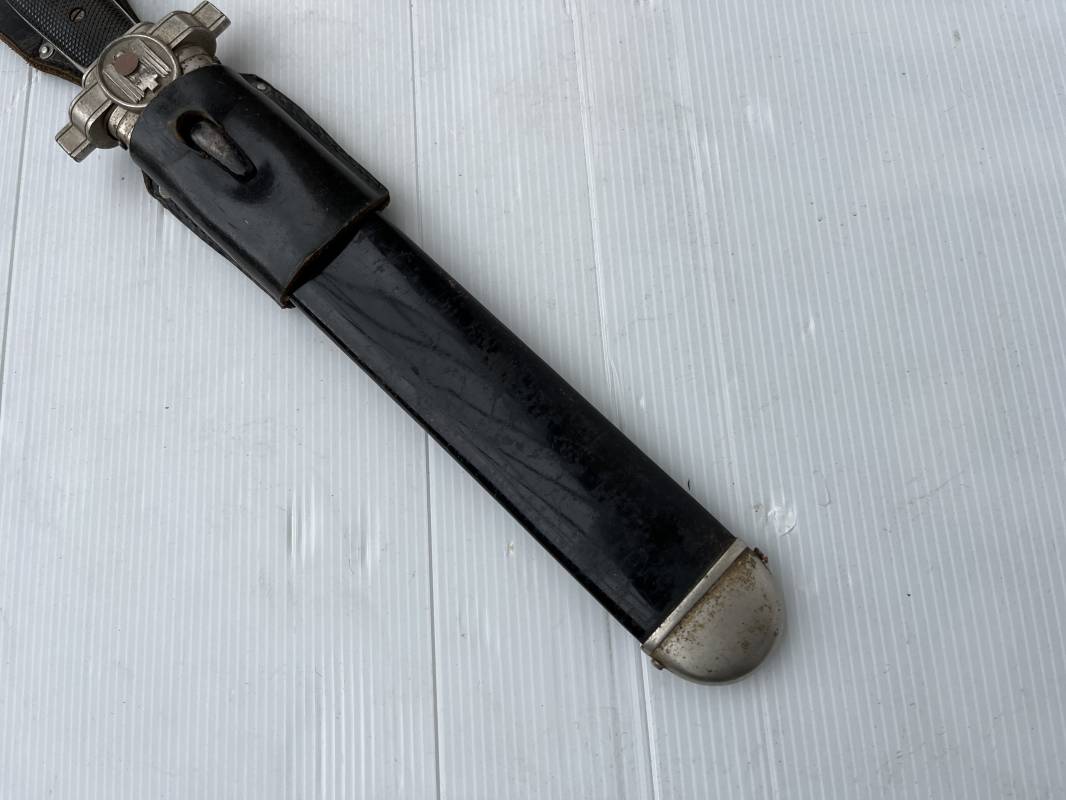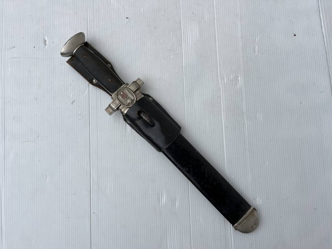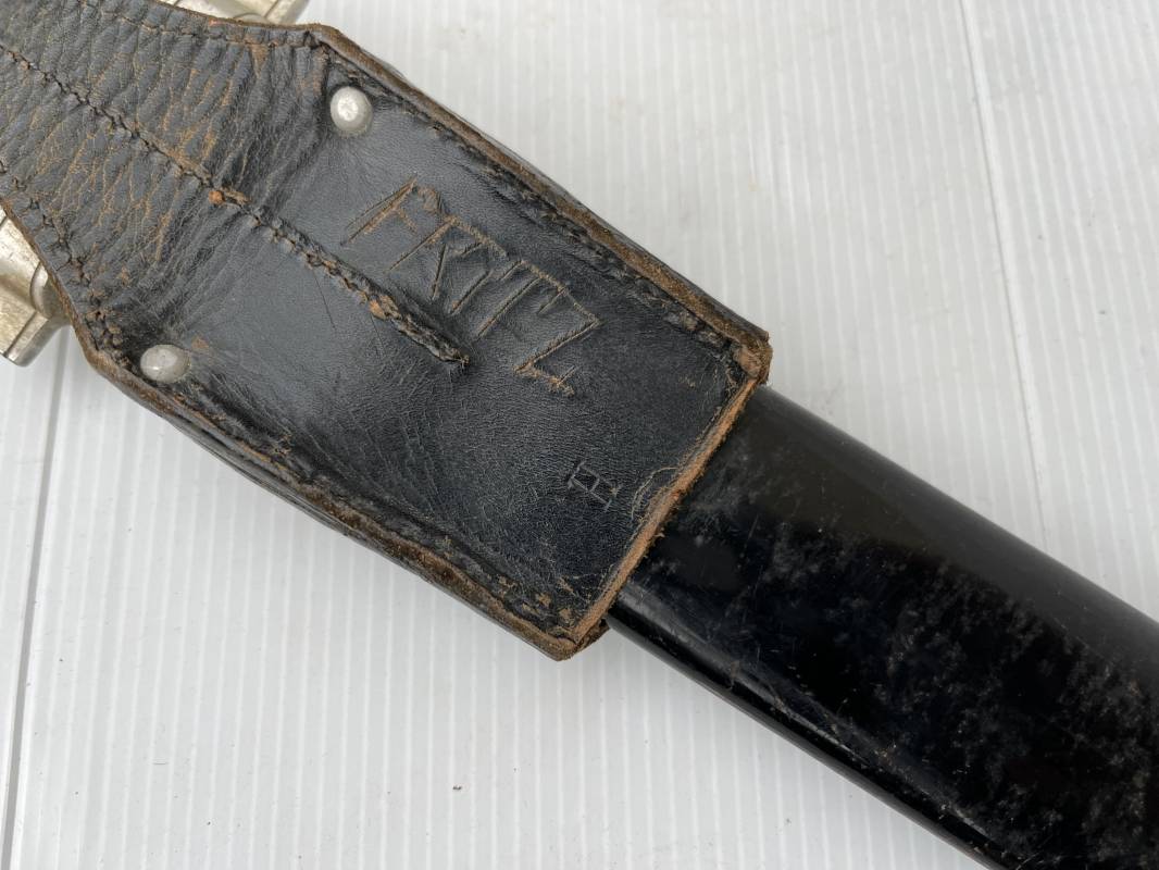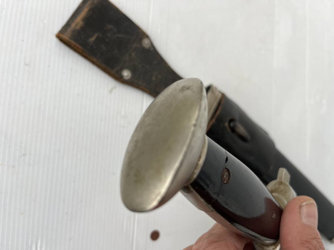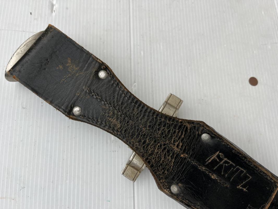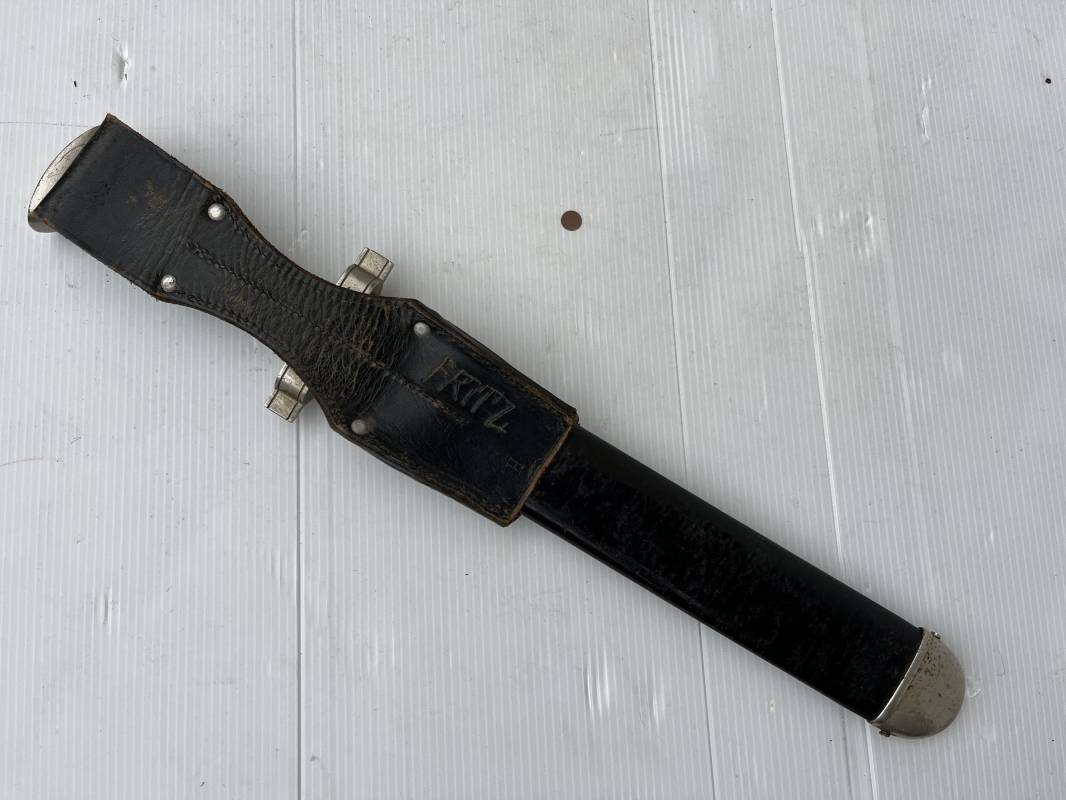 Fendoir troupe modéle 1938 du Deutsche Rotes Kreuz et son gousset en cuir noir de dotation . Pommeau oval , plaquettes en plastique noir quadrillé sur le devant et lisse sur l'arrière retenu par deux visses , anoté plaquette fendue sur l'arrière ( voir photo ) . Garde avec écusson du DRK . Garnitures enmétal nickelé et maté . Large lame a gorge avec dents sur un coté pour menus travaux , pointe en forme droite pour utilisation en tourne visse ; marquage sur la lame au dos de la garde ' Ges Geschutz ' Fourreau en metal peint en noir d'origine , pontet pour fixation au gousset cuir . Chape et bouterolle avec visses d 'origines . Gousset en cuir lisse noir du modéle de dotation , rivets en alu , passant de ceinturon , marquage ' H ' et nom Fritz manuscrit . Beau fendoir 100 % dans son jus et totalement intouché . Trouvé en succession familiale ce fendoir n'a jamais ete en collection Ref 19528 .