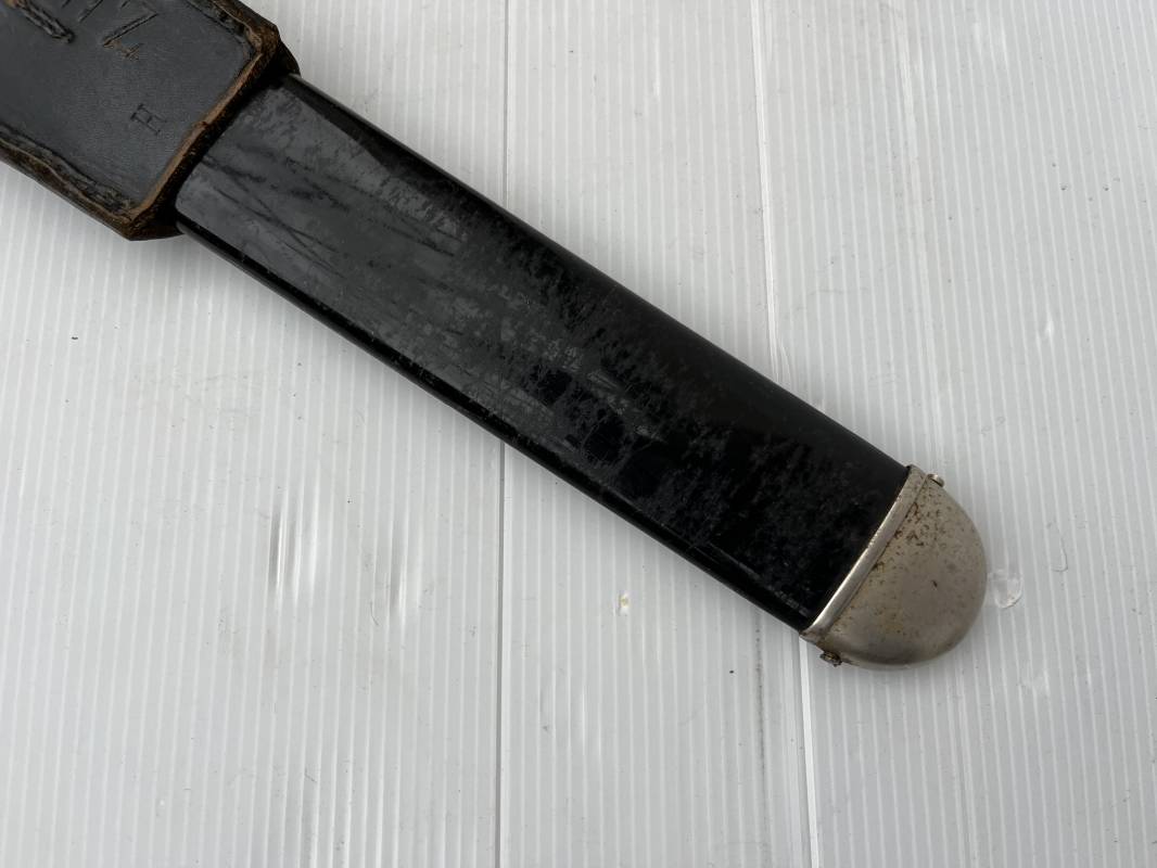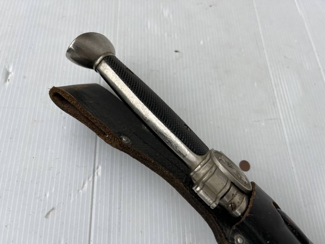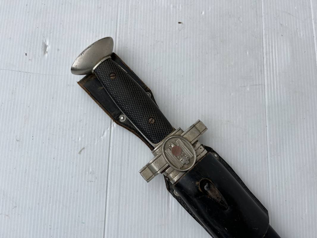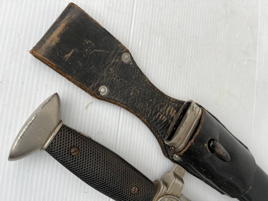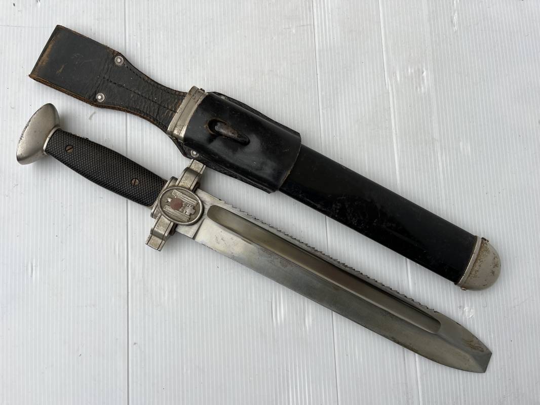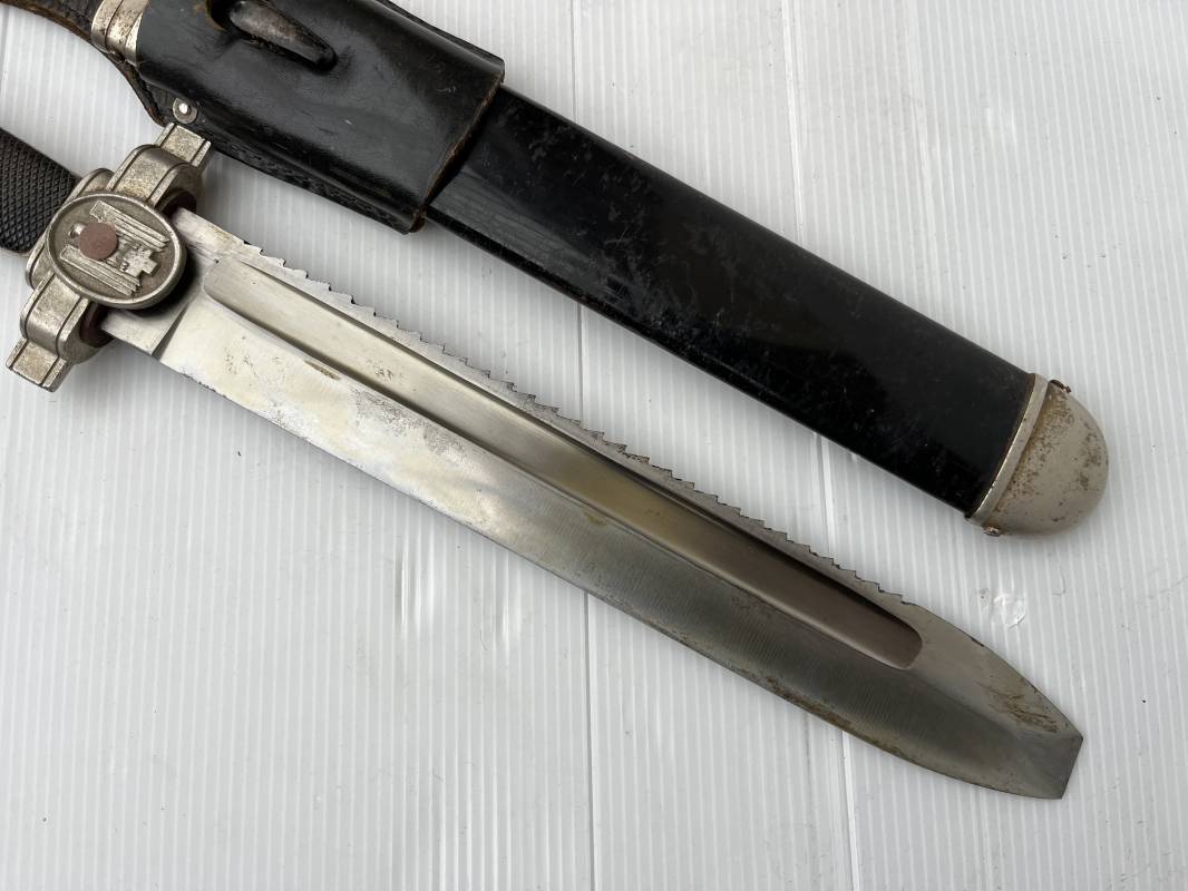 Fendoir troupe modéle 1938 du Deutsche Rotes Kreuz et son gousset en cuir noir de dotation . Pommeau oval , plaquettes en plastique noir quadrillé sur le devant et lisse sur l'arrière retenu par deux visses , anoté plaquette fendue sur l'arrière ( voir photo ) . Garde avec écusson du DRK . Garnitures enmétal nickelé et maté . Large lame a gorge avec dents sur un coté pour menus travaux , pointe en forme droite pour utilisation en tourne visse ; marquage sur la lame au dos de la garde ' Ges Geschutz ' Fourreau en metal peint en noir d'origine , pontet pour fixation au gousset cuir . Chape et bouterolle avec visses d 'origines . Gousset en cuir lisse noir du modéle de dotation , rivets en alu , passant de ceinturon , marquage ' H ' et nom Fritz manuscrit . Beau fendoir 100 % dans son jus et totalement intouché . Trouvé en succession familiale ce fendoir n'a jamais ete en collection Ref 19528 .