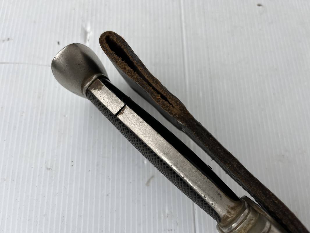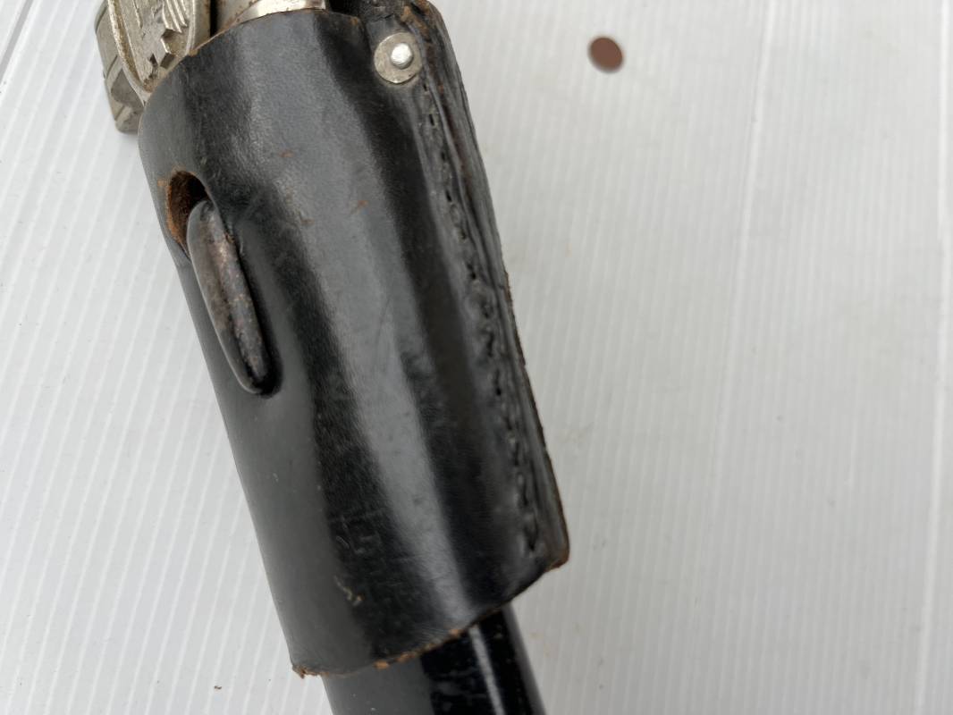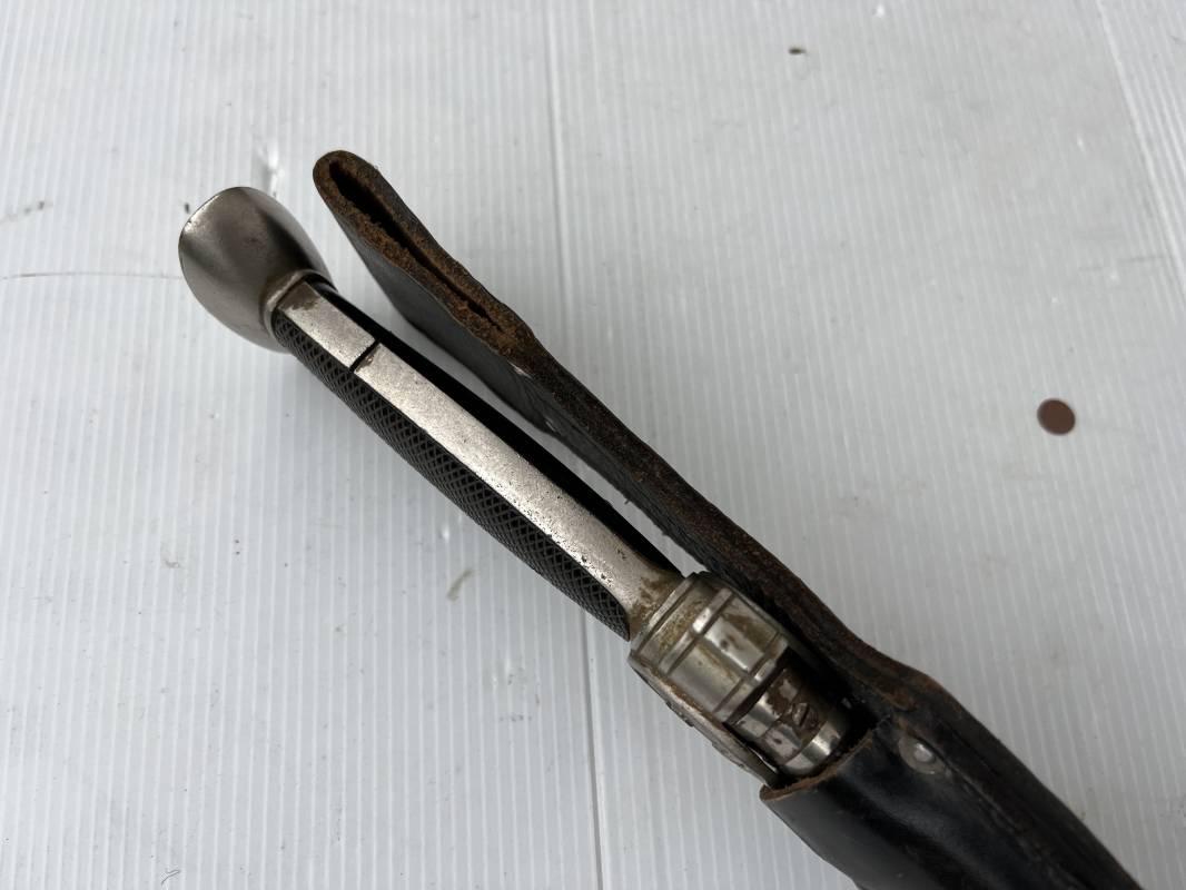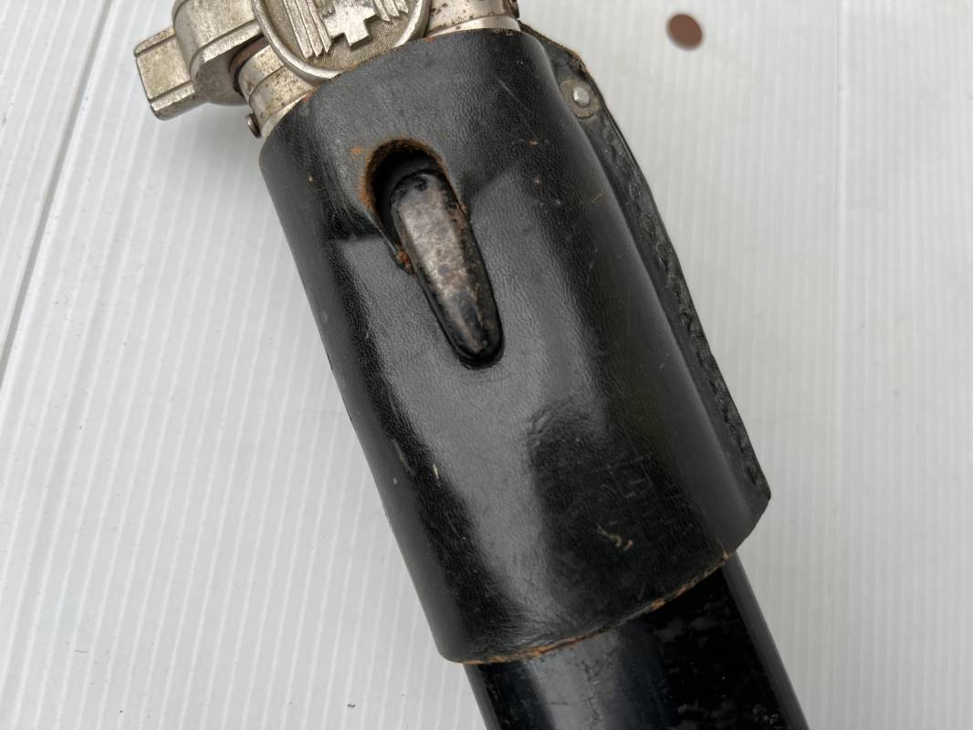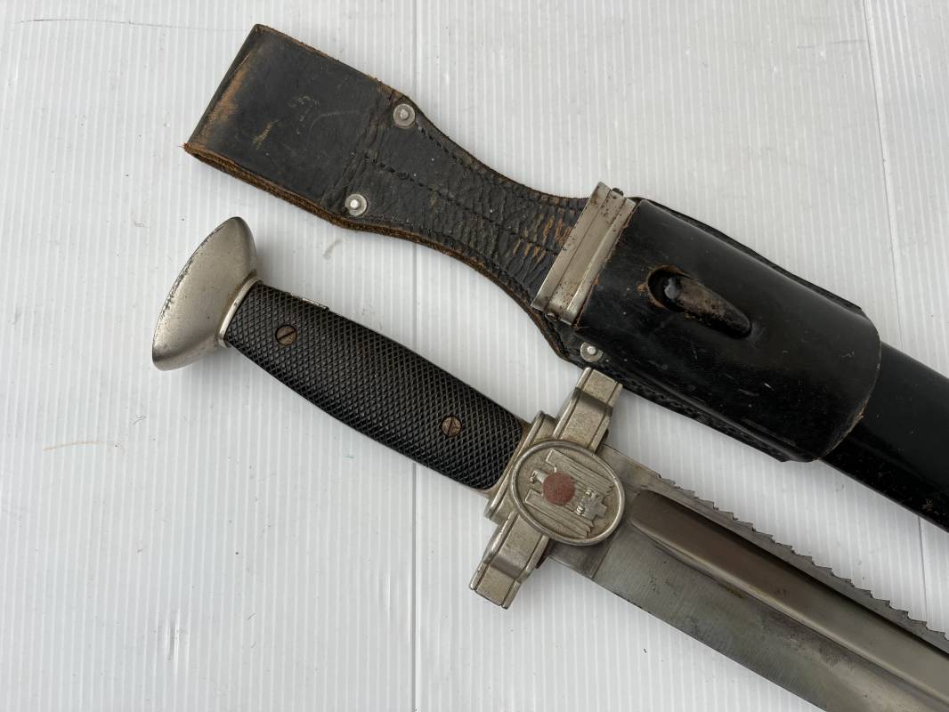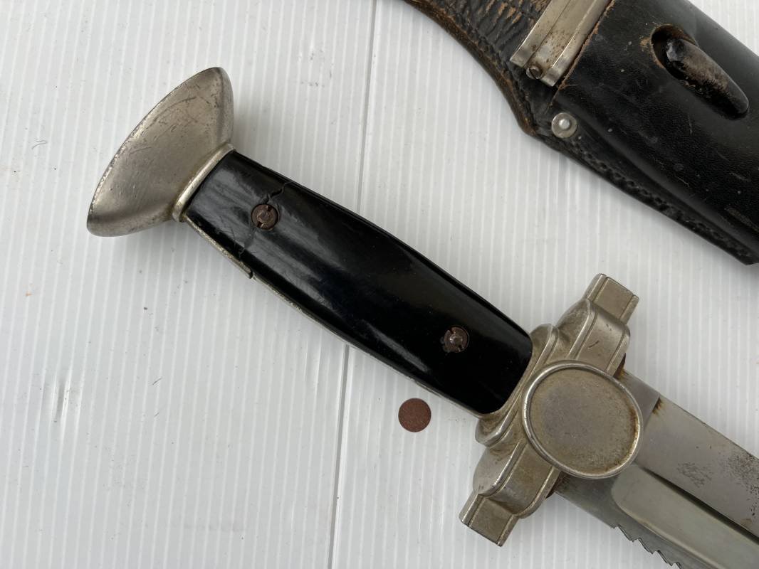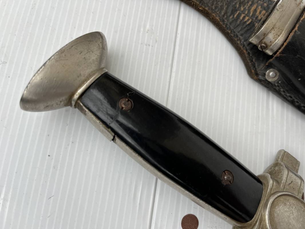 Fendoir troupe modéle 1938 du Deutsche Rotes Kreuz et son gousset en cuir noir de dotation . Pommeau oval , plaquettes en plastique noir quadrillé sur le devant et lisse sur l'arrière retenu par deux visses , anoté plaquette fendue sur l'arrière ( voir photo ) . Garde avec écusson du DRK . Garnitures enmétal nickelé et maté . Large lame a gorge avec dents sur un coté pour menus travaux , pointe en forme droite pour utilisation en tourne visse ; marquage sur la lame au dos de la garde ' Ges Geschutz ' Fourreau en metal peint en noir d'origine , pontet pour fixation au gousset cuir . Chape et bouterolle avec visses d 'origines . Gousset en cuir lisse noir du modéle de dotation , rivets en alu , passant de ceinturon , marquage ' H ' et nom Fritz manuscrit . Beau fendoir 100 % dans son jus et totalement intouché . Trouvé en succession familiale ce fendoir n'a jamais ete en collection Ref 19528 .