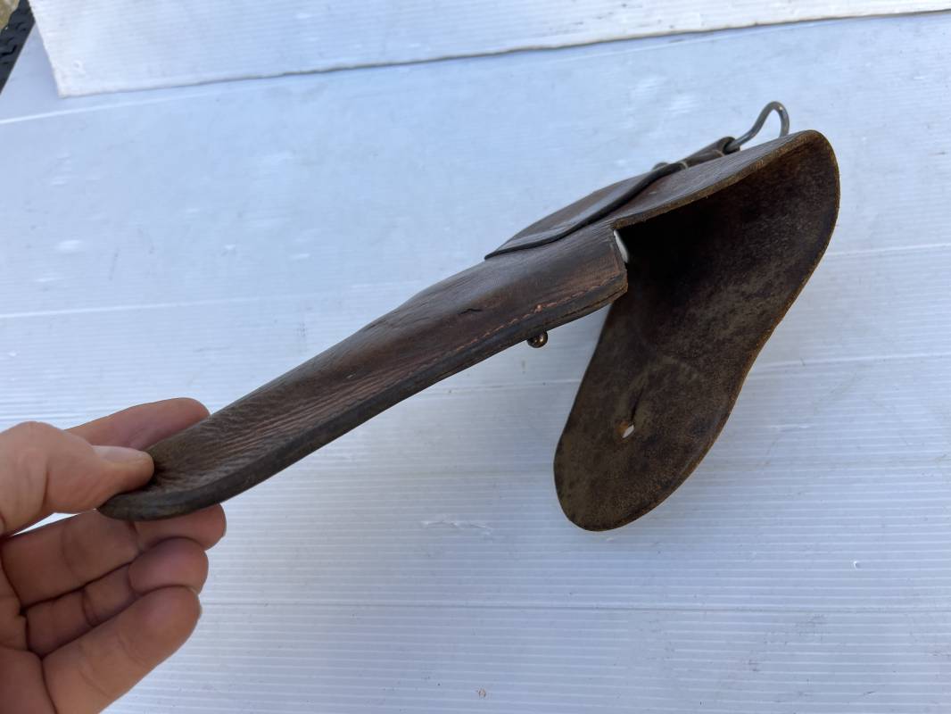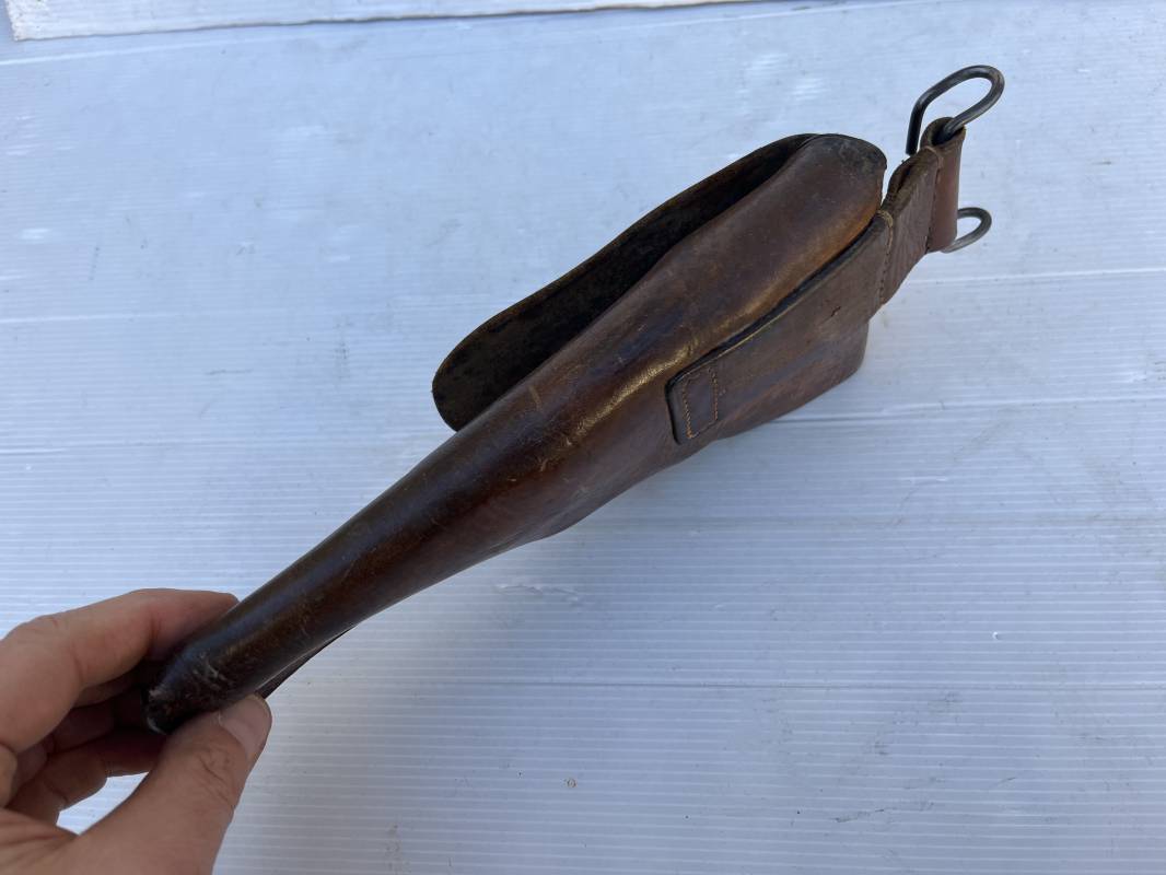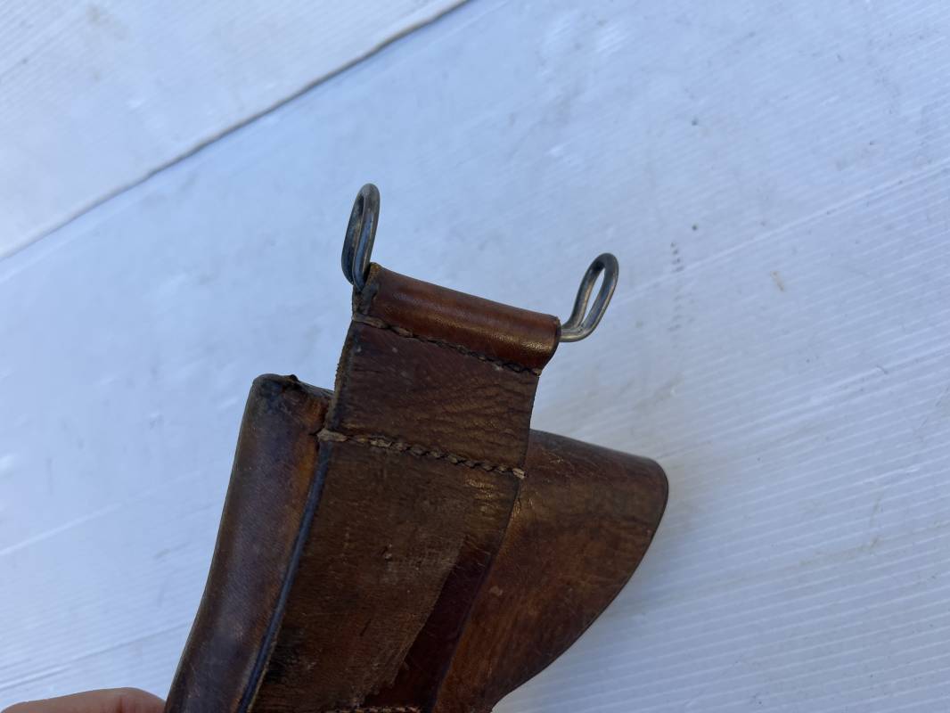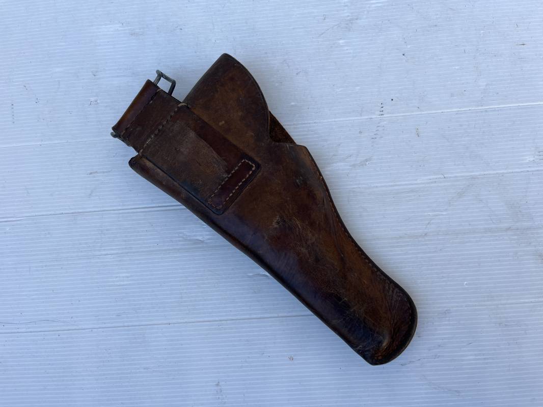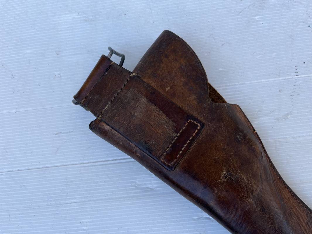 Rare étui colt 45 en cuir fauve. Fabrication française. Crochet métallique de fixation. Passant cuir de ceinturon. Rabat avec téton en laiton. Légèrement porté en bel état 1945/55. Ref 21174