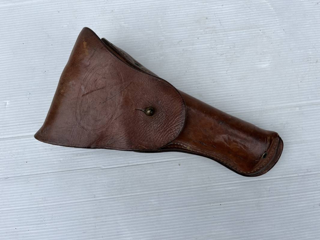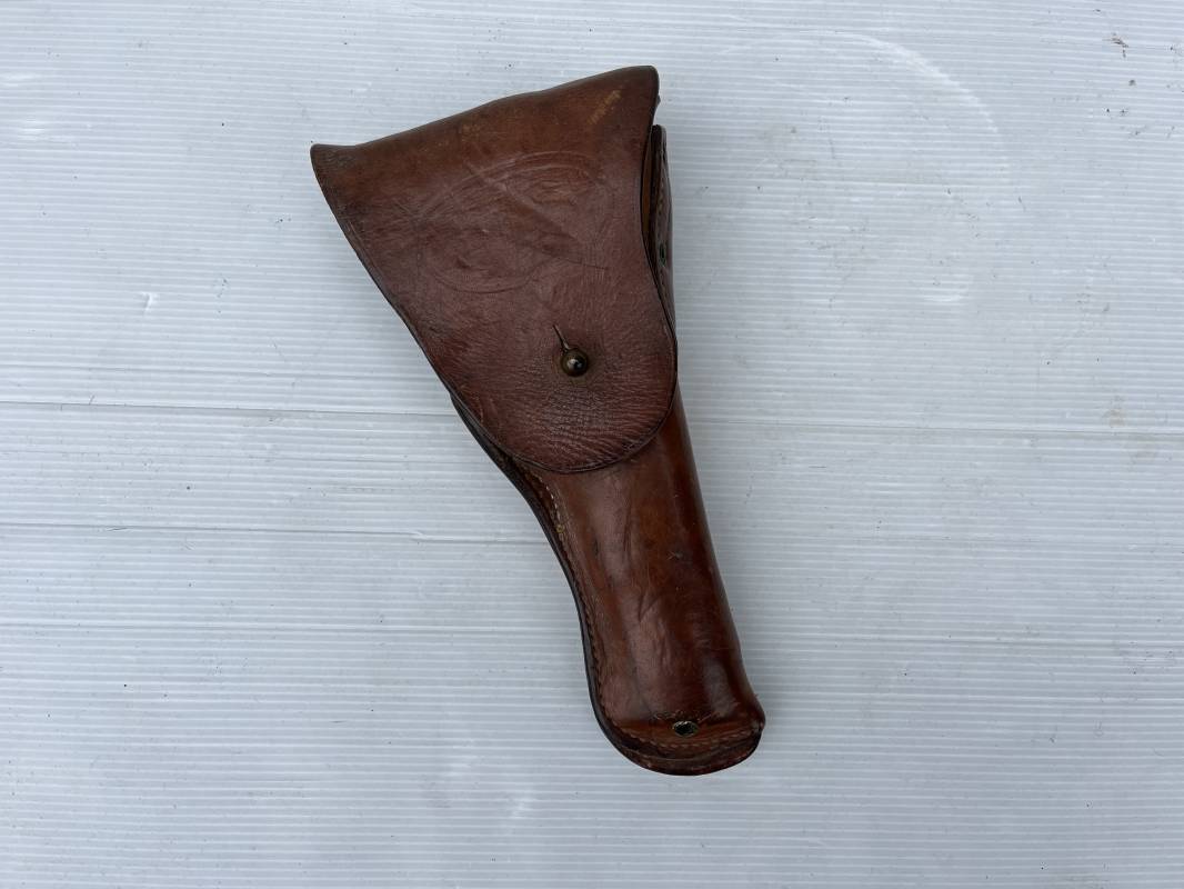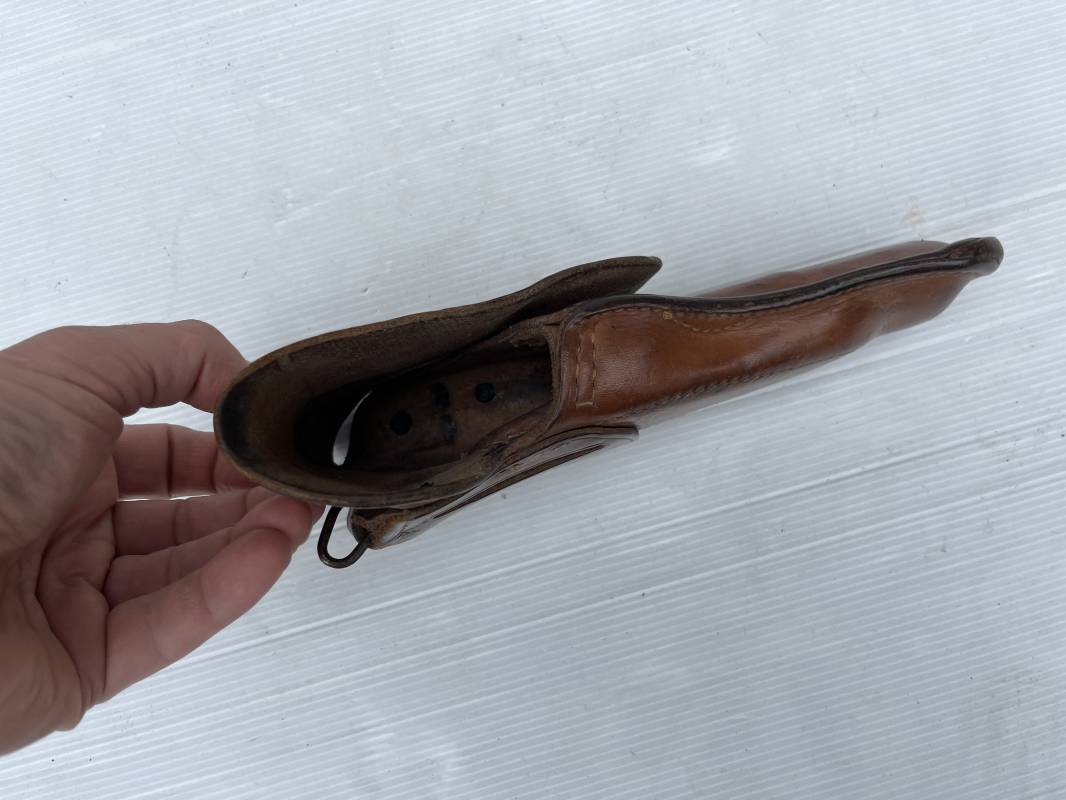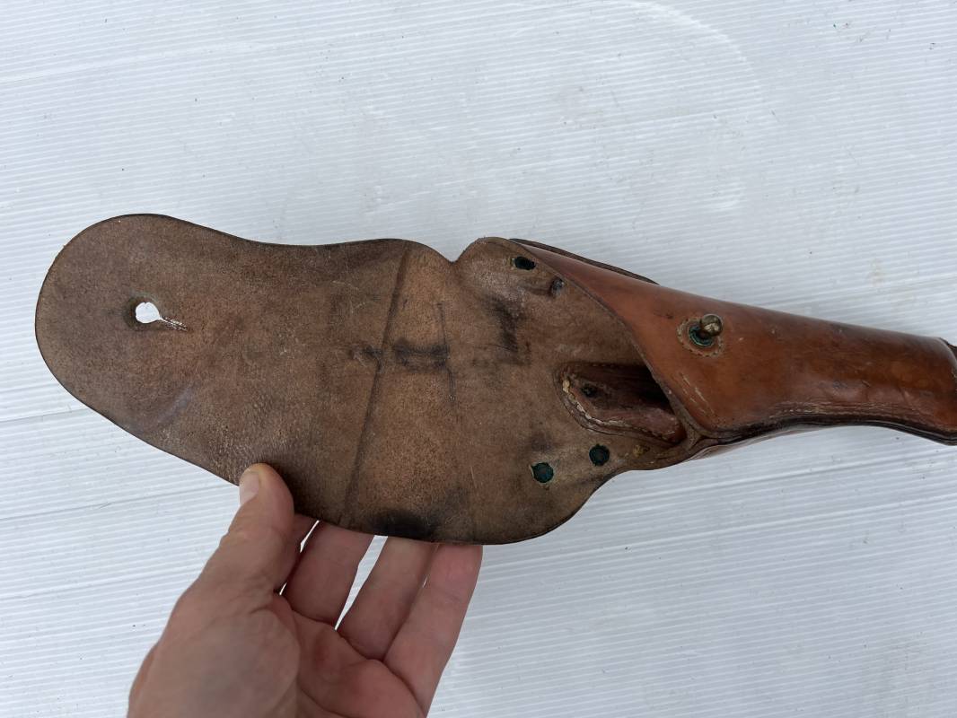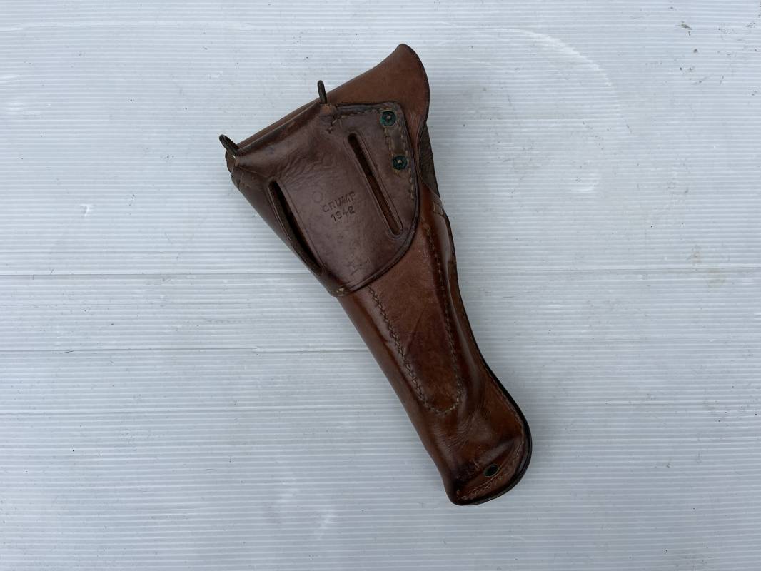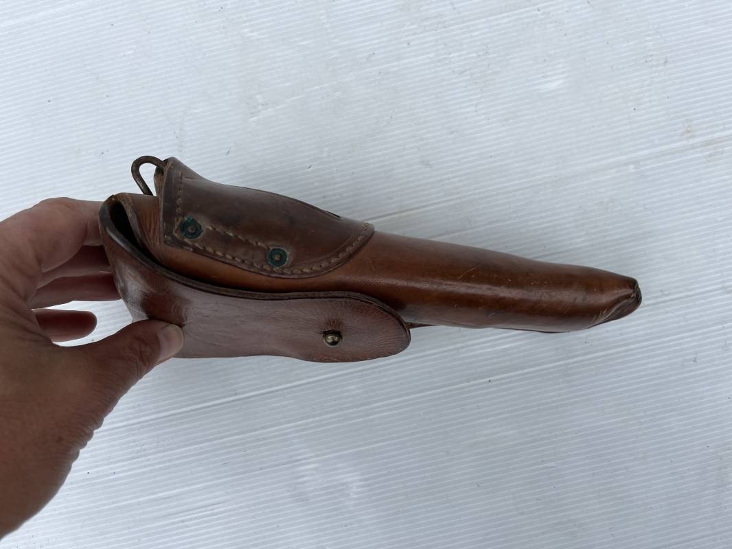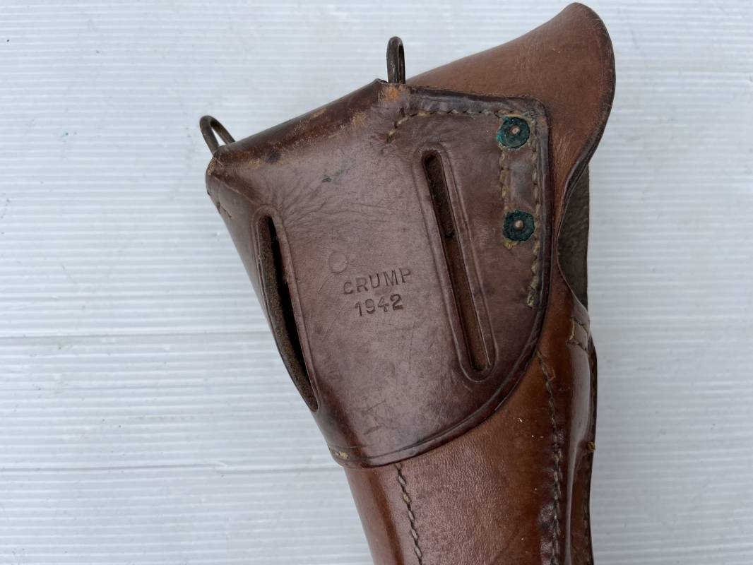 Très bel étui modèle 1916 en cuir fauve pour le colt 45 (pistolet modèle 1911) Holster en cuir fauve. Crochet métallique de fixation. Rabat avec pontet, marquage US. Fabricant GRUMP 1942 . Cuir souple, légèrement porté en parfait état . Ref 22107