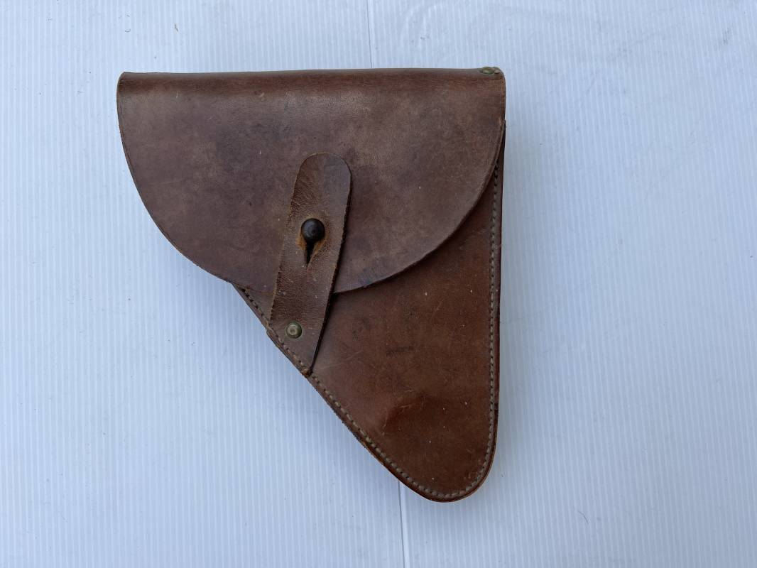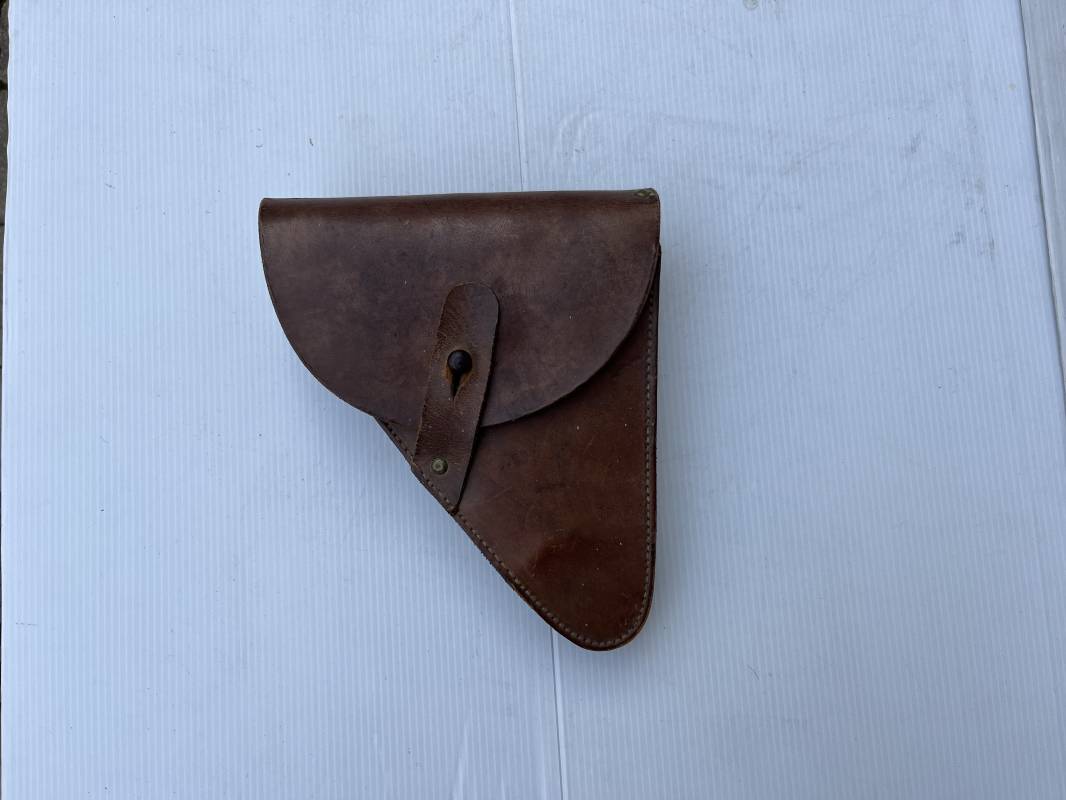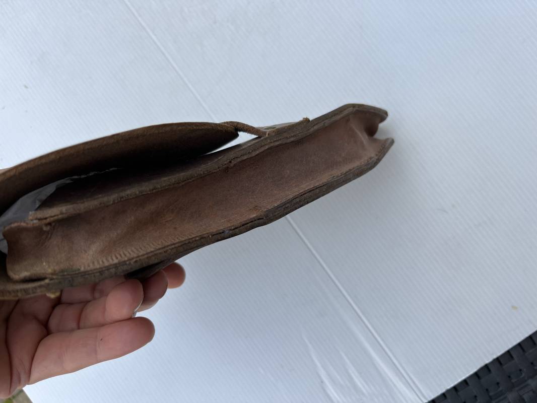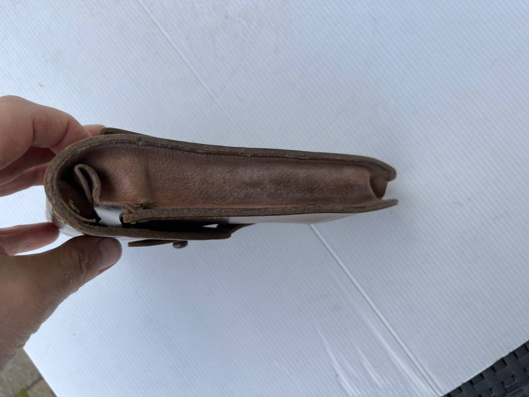 Trés bel étui d'un pistolet Ruby modèle 1916 en cuir marron.Fabrication rivets laiton Passant cuir de ceinturon. Les trois rivets de fixation hauts du passant de ceinturon ont ete remplacés et reparés d origine par un fort fil de coton ( voir photos ) Emplacement intérieur pour deux chargeurs, cuir souple . Tampon encre de fabricant sous le rabat mais illisible . Légérement porté en parfait état 1935/40 Ref 19817