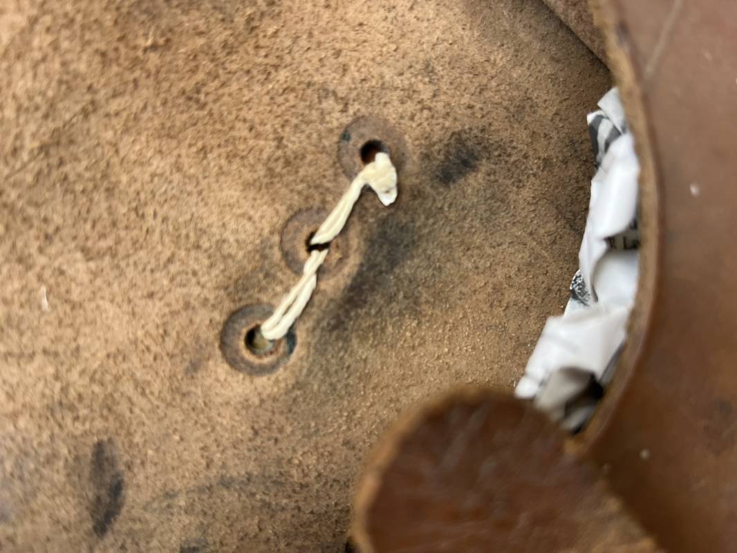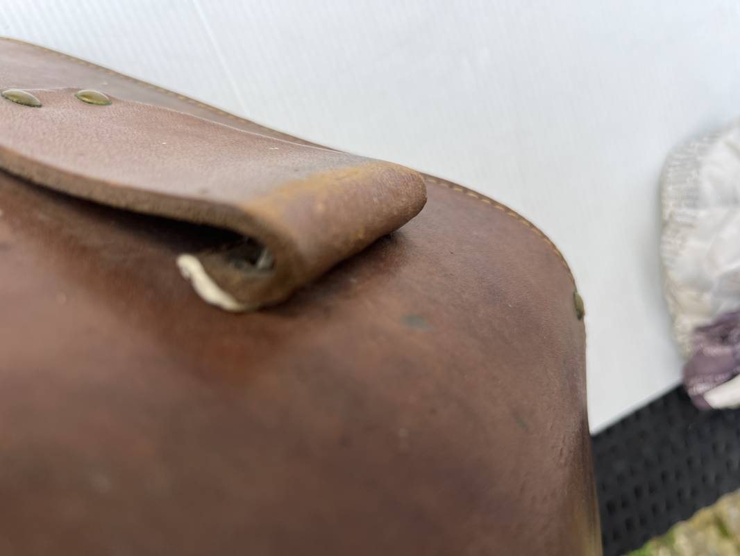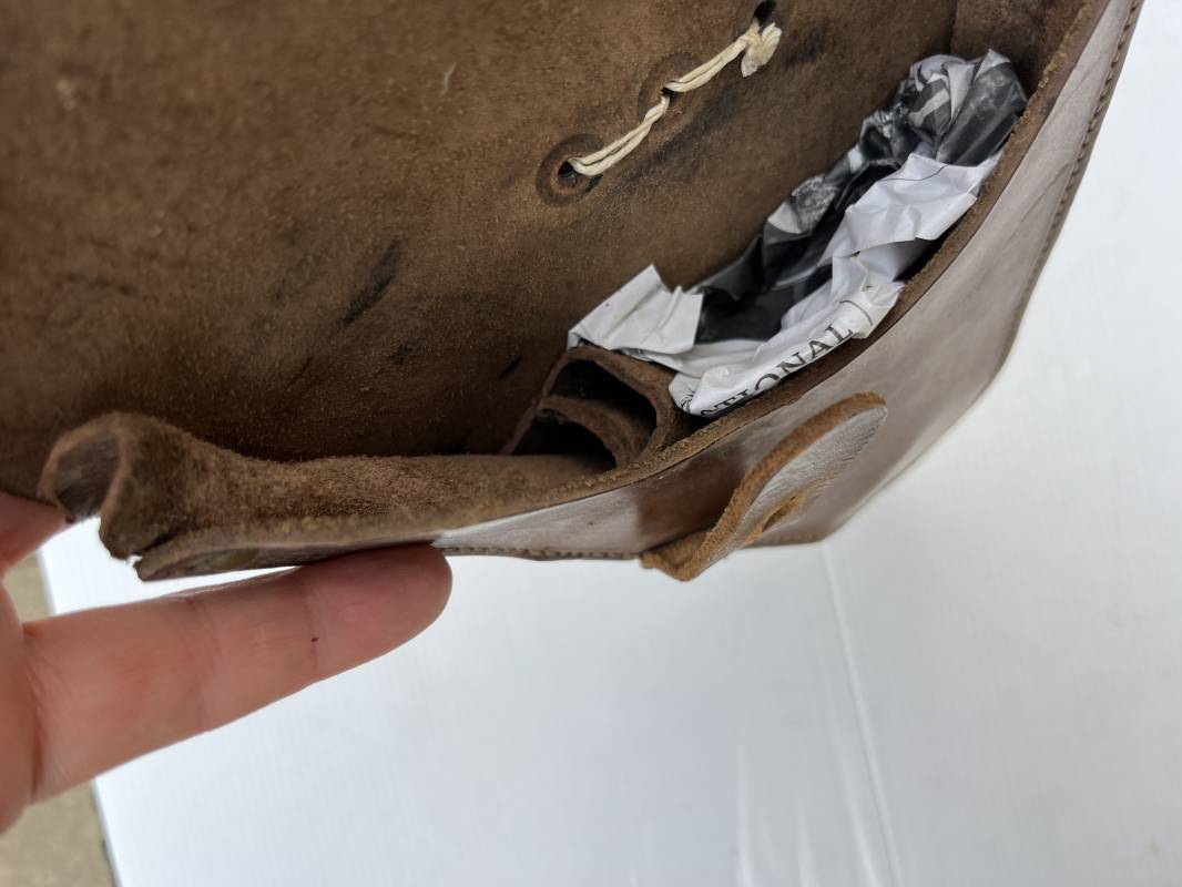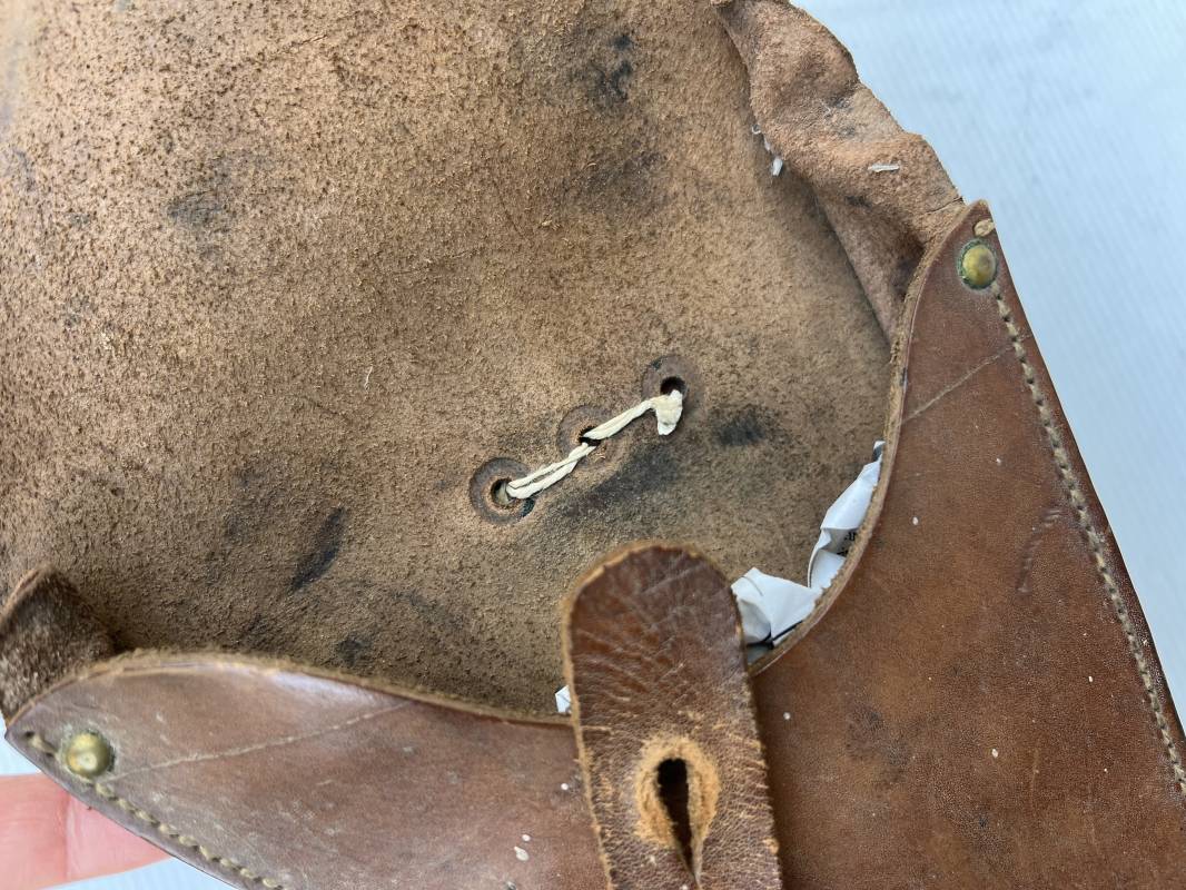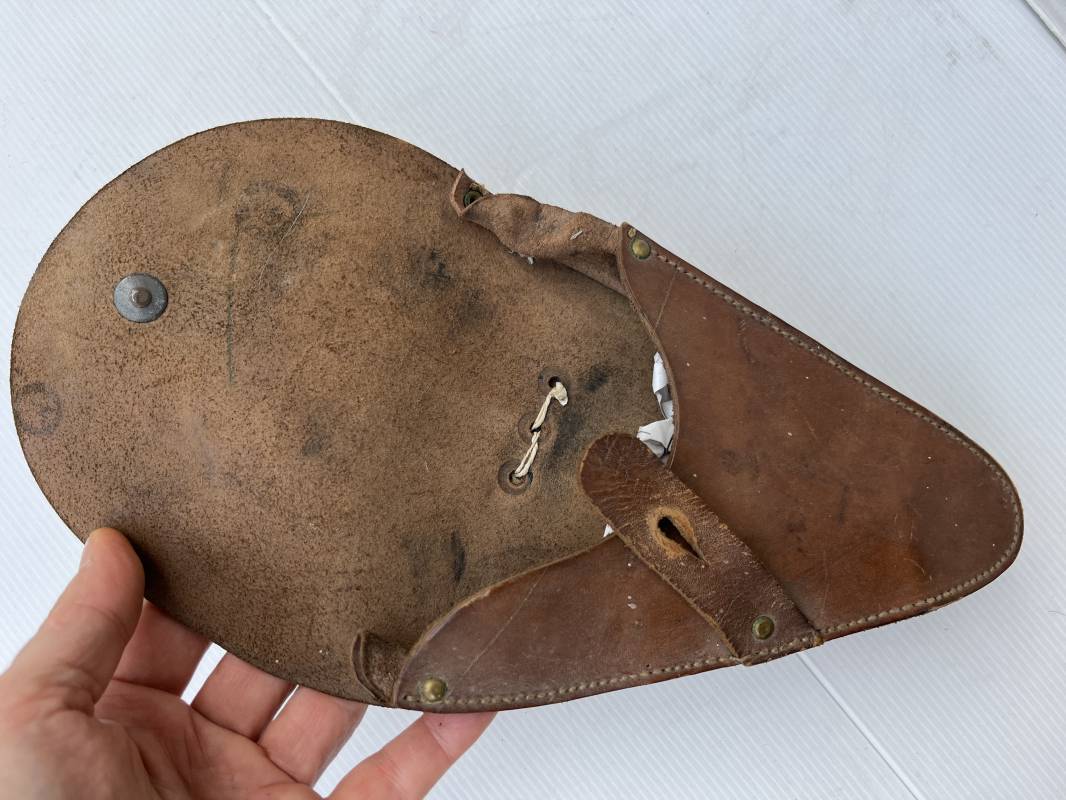 Trés bel étui d'un pistolet Ruby modèle 1916 en cuir marron.Fabrication rivets laiton Passant cuir de ceinturon. Les trois rivets de fixation hauts du passant de ceinturon ont ete remplacés et reparés d origine par un fort fil de coton ( voir photos ) Emplacement intérieur pour deux chargeurs, cuir souple . Tampon encre de fabricant sous le rabat mais illisible . Légérement porté en parfait état 1935/40 Ref 19817