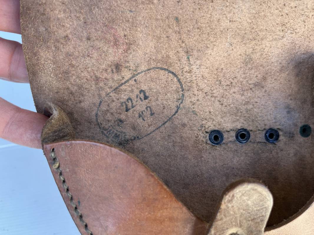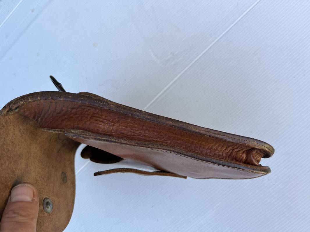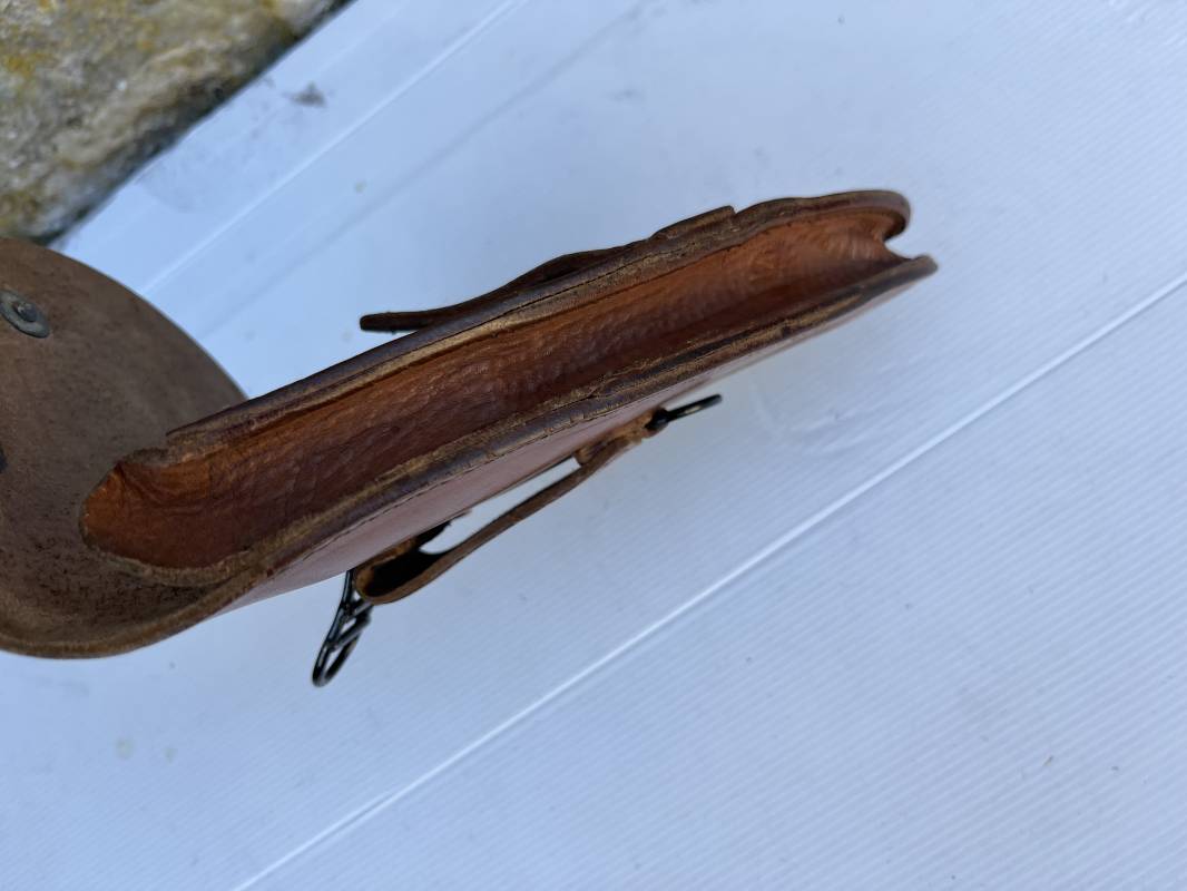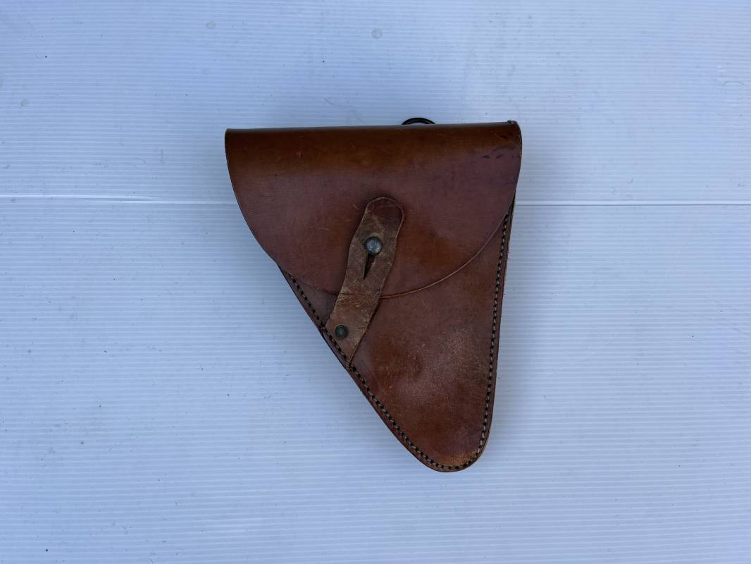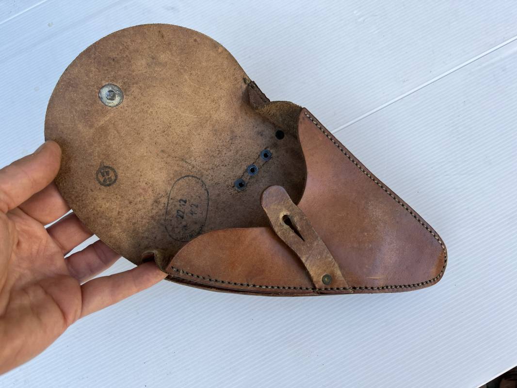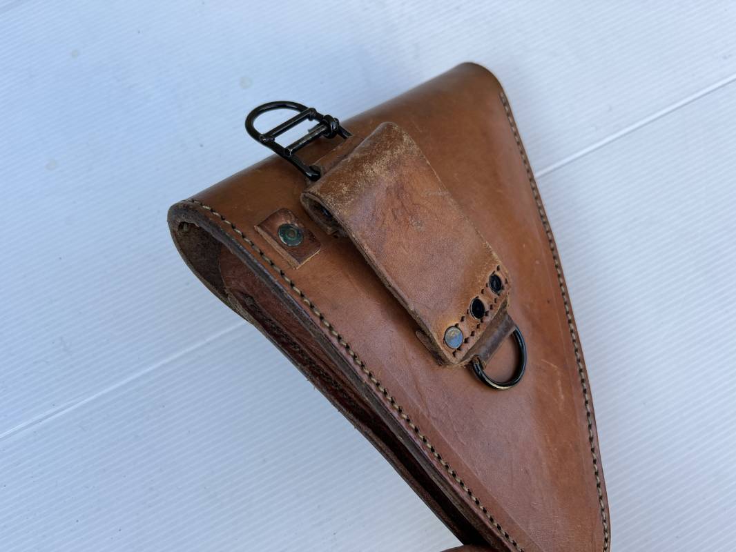 Trés bel étui d'un pistolet Ruby modèle 1916 en cuir marron.Etui Mdle 1916 Modifié 1935 par l ajout de passant metallique de bretelle de suspension , anneau de fixation equipement et patelette cuir de fixation a la cartouchière ( ici sectionné d origine ) Passant cuir de ceinturon. Emplacement intérieur pour deux chargeurs, cuir souple . Tampon encre de fabricant sous le rabat . Trés légérement porté en parfait état 1935/40 Ref 21901