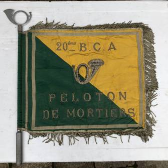 Rare fanion du 20éme BCA . Peloton Mortier . Fanion 1935/40 . Trés belle fabrication dimensions 47X37 cm . Tissu soie jonquille et vert , franges argent . Galons argentés et broderies cannetille . Mat d'origine en métal blanc . Cor de chasse Hauteur 58 cm . Fanion en superbe état . Rare fanion chasseur en 39/40 Peu courant Ref 13909