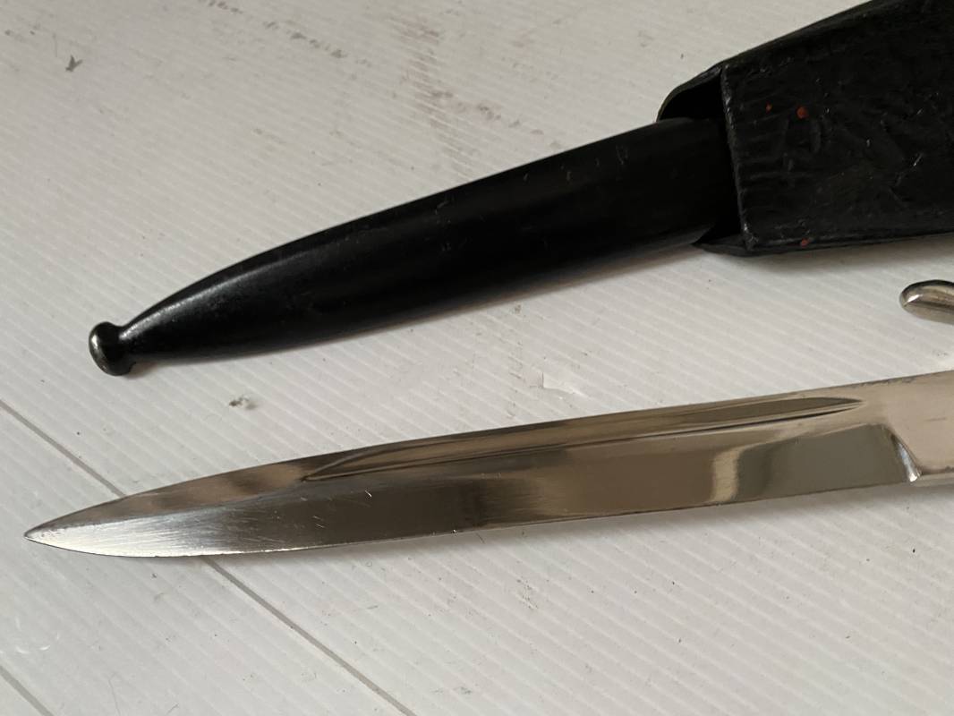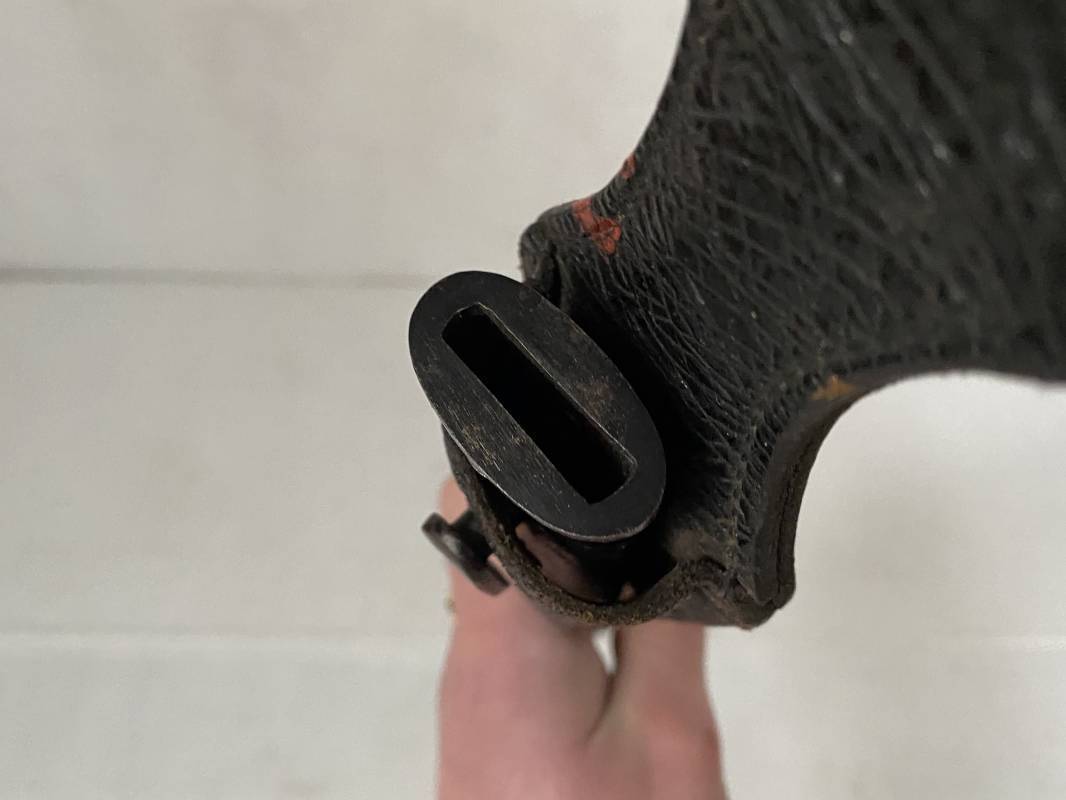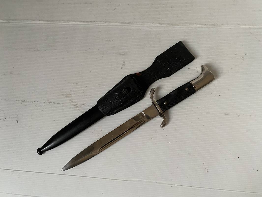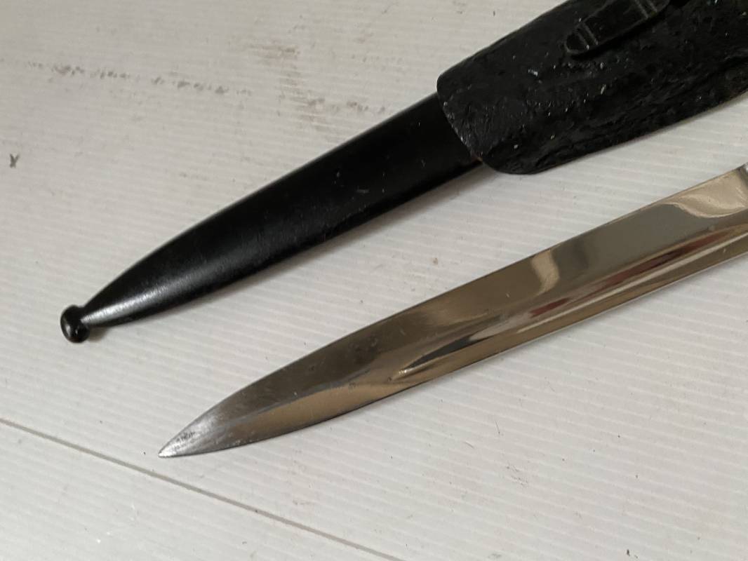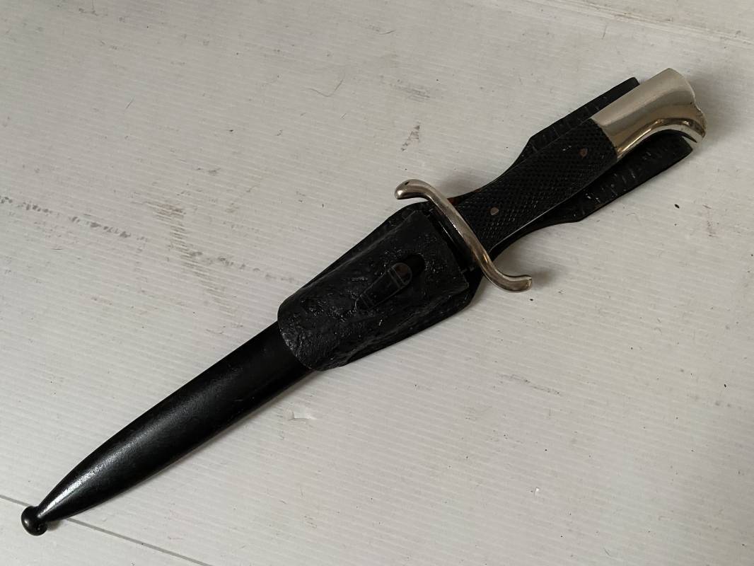 Baionnette troupe de la Feuerschutz Polizei avec son gousset en cuir vernis noir. Baionnette avec plaquettes en plastique noir quadrillé. Pommeau en forme de tête d'aigle. Garde en S. Très belle lame acier. Fourreau en métal peint en noir d'origine. Pontet métallique de fixation. Gousset en cuir vernis noir. Passant de ceinturon. Bel ensemble homogène. Légèrement portée en parfait état 1935/45. Ref 15167