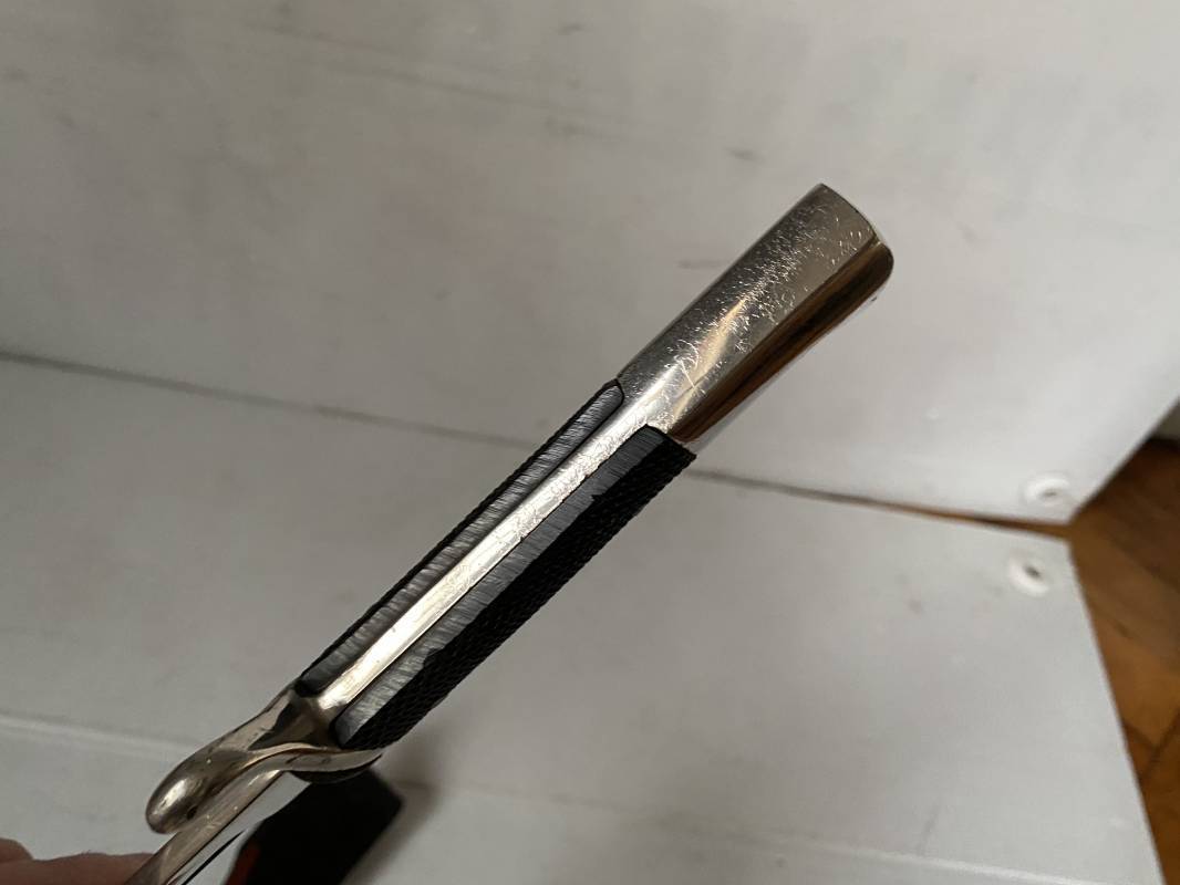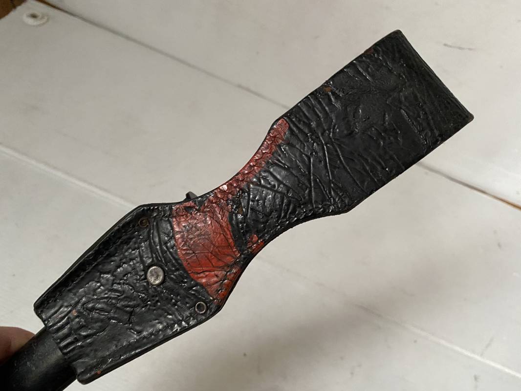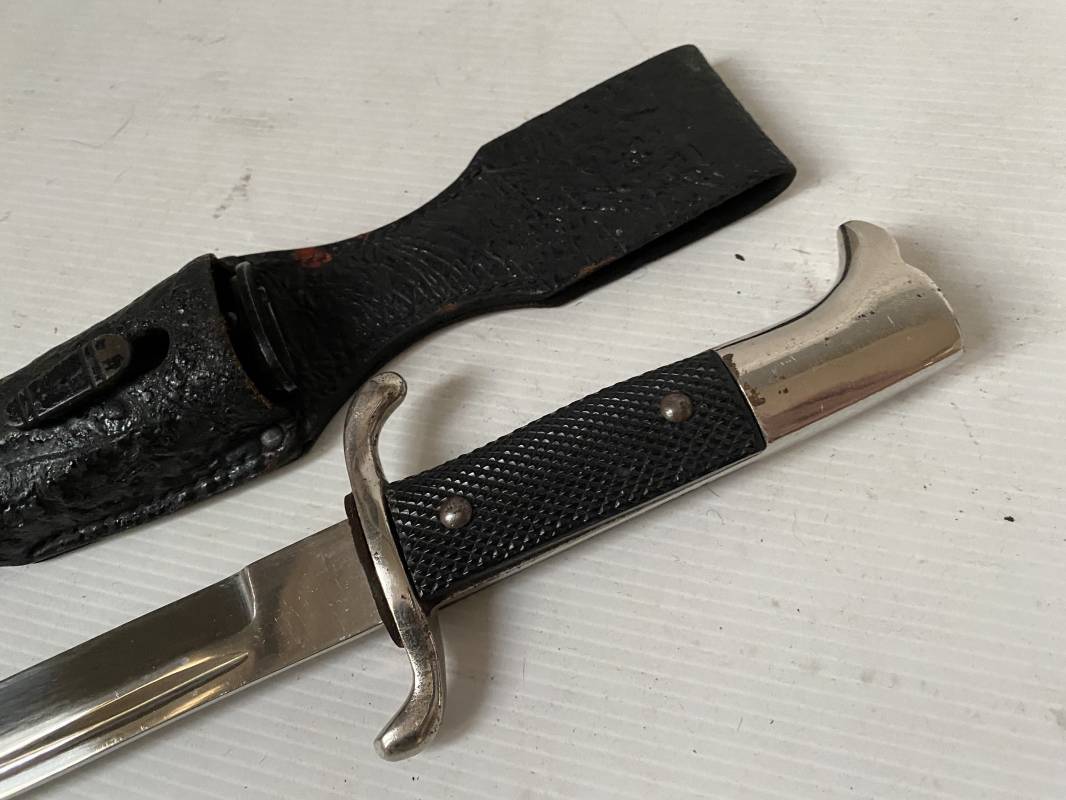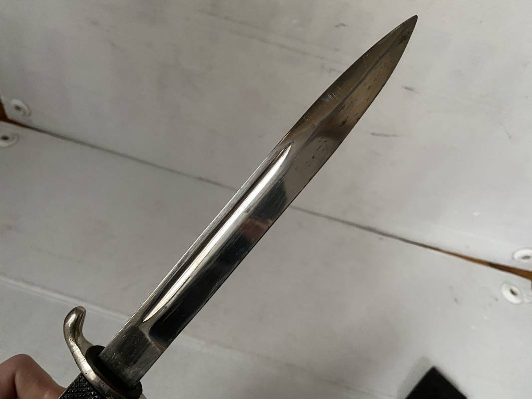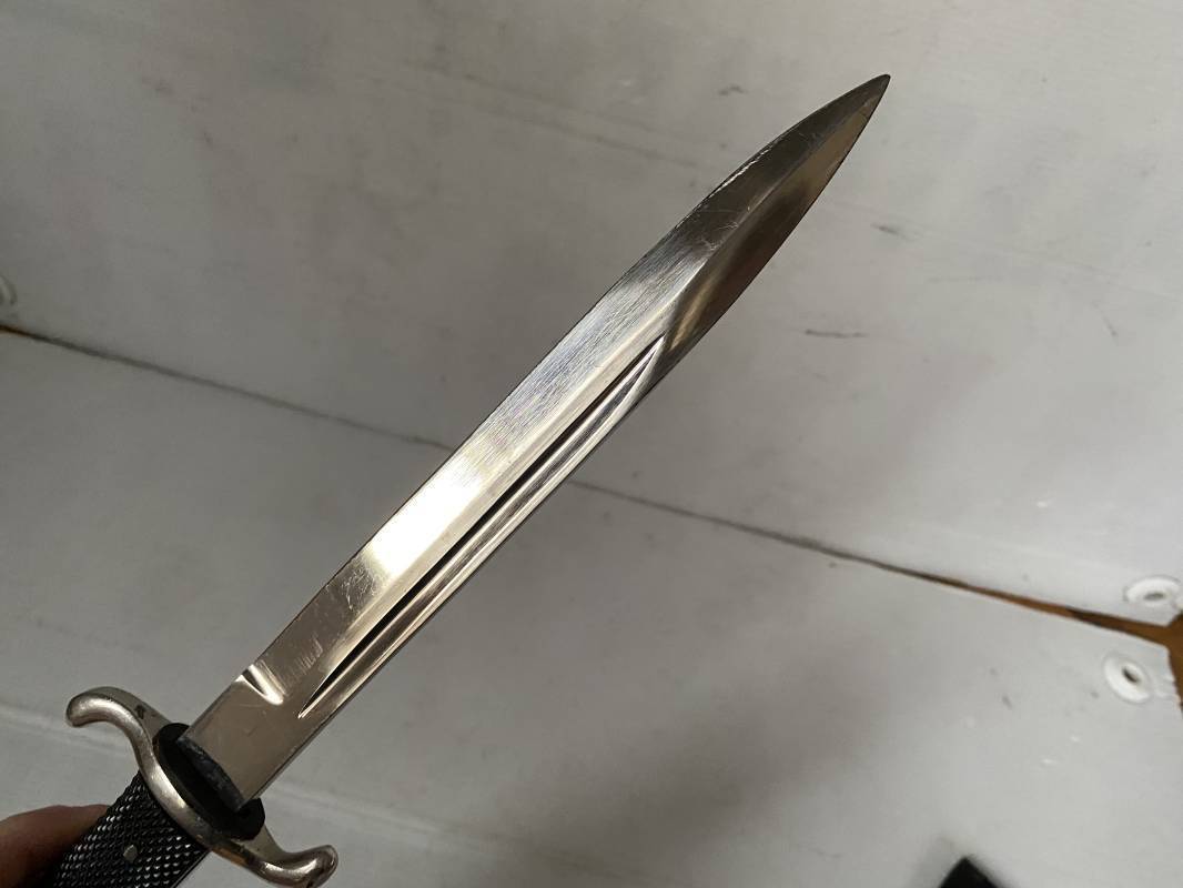Baionnette troupe de la Feuerschutz Polizei avec son gousset en cuir vernis noir. Baionnette avec plaquettes en plastique noir quadrillé. Pommeau en forme de tête d'aigle. Garde en S. Très belle lame acier. Fourreau en métal peint en noir d'origine. Pontet métallique de fixation. Gousset en cuir vernis noir. Passant de ceinturon. Bel ensemble homogène. Légèrement portée en parfait état 1935/45. Ref 15167