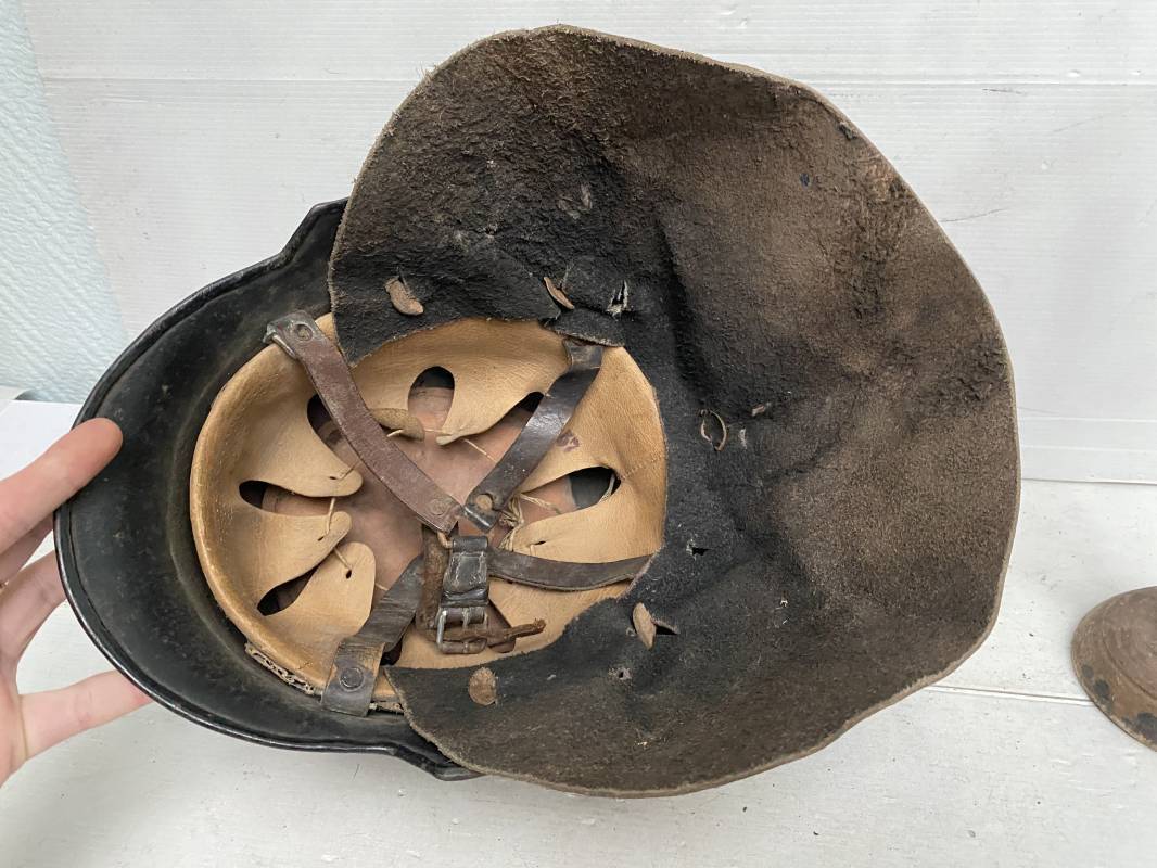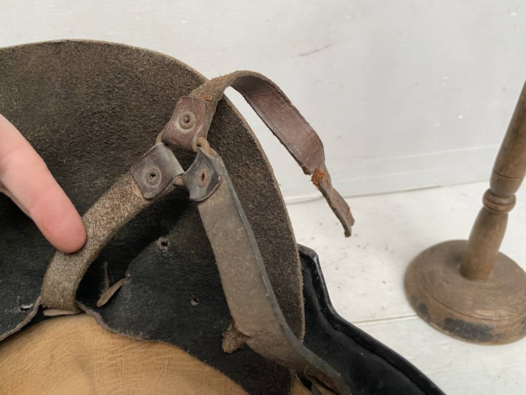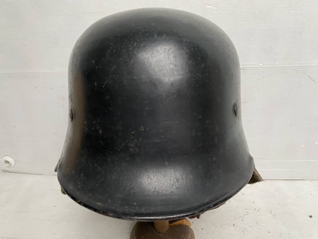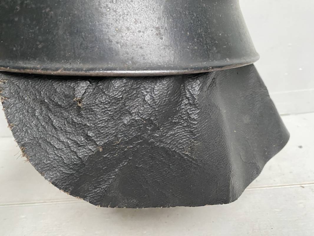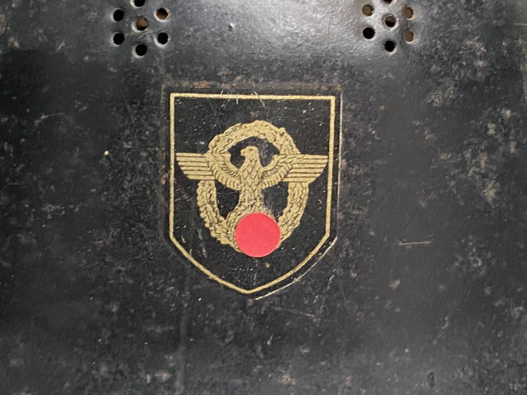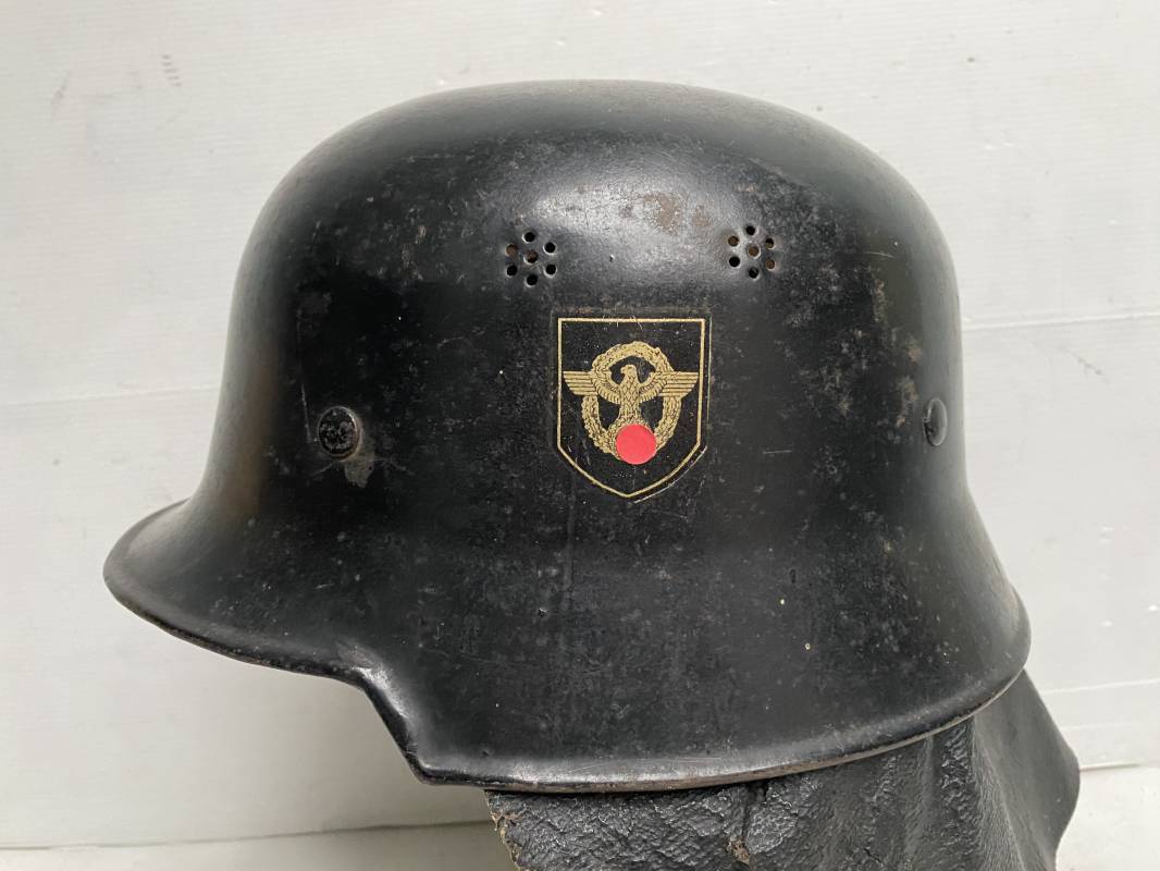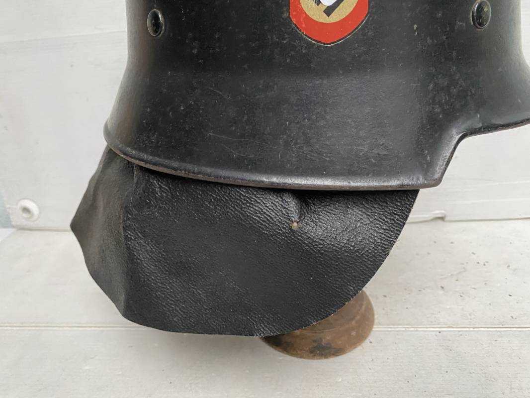 Trés beau casque Mdle 1934 du FeuerSchutz Polizei avec sa protection amovible nuquière en cuir . Casque acier avec peinture noire d'origine . Double insignes ; aigle polizei et insigne d'état . Aérateurs . Quatre rivets . Coiffe intérieur en cuir fauve , lacet de serrage ,Taille 57 , tampon amortisseur en fond de bombe .Cuir souple jamais ciré . Quatre passants cuir pour la fixation de la protection nuquière . Rare nuquière en cuir noir , cuir souple Jugulaire en 'V' en cuir , une boucle métallique à un ardillon . A noté bout de jugulaire manquant et fragilité au niveau d'un rivet métallique ( voir photos ) . Beau casque légèrement porté en parfait état 1935/45 Ref 18727