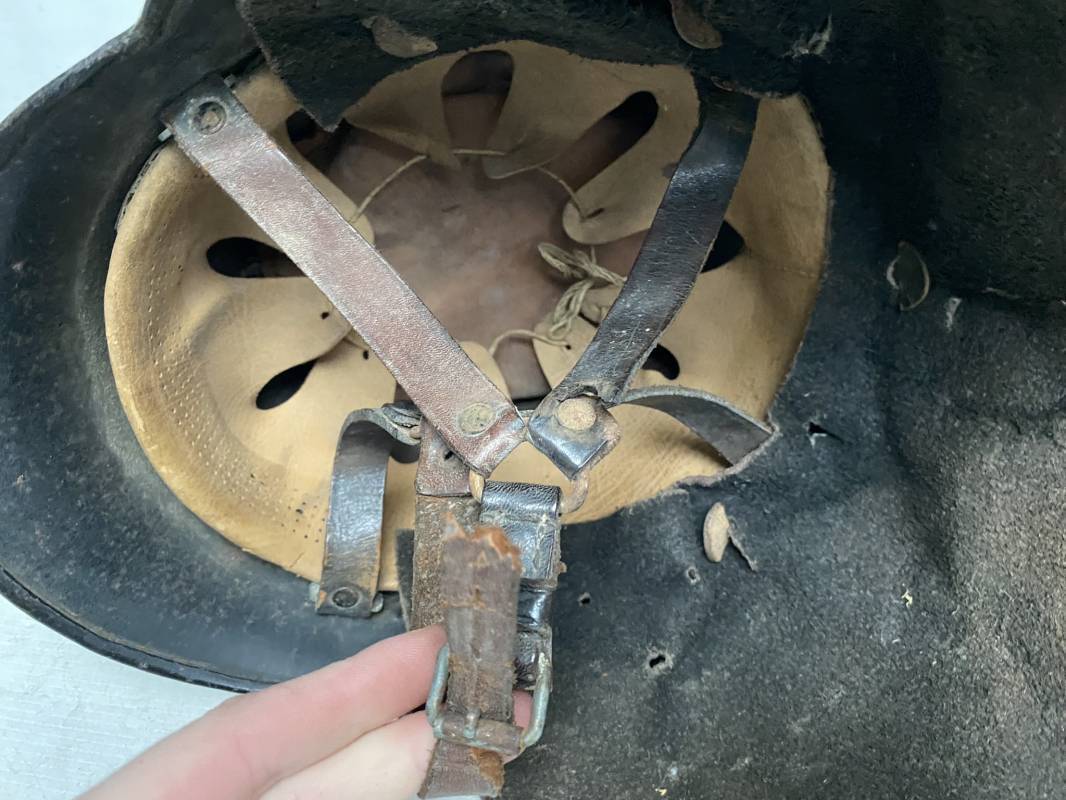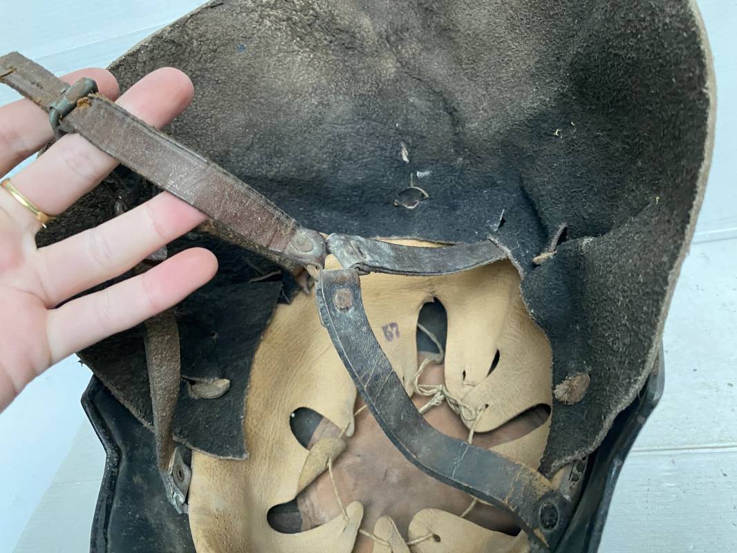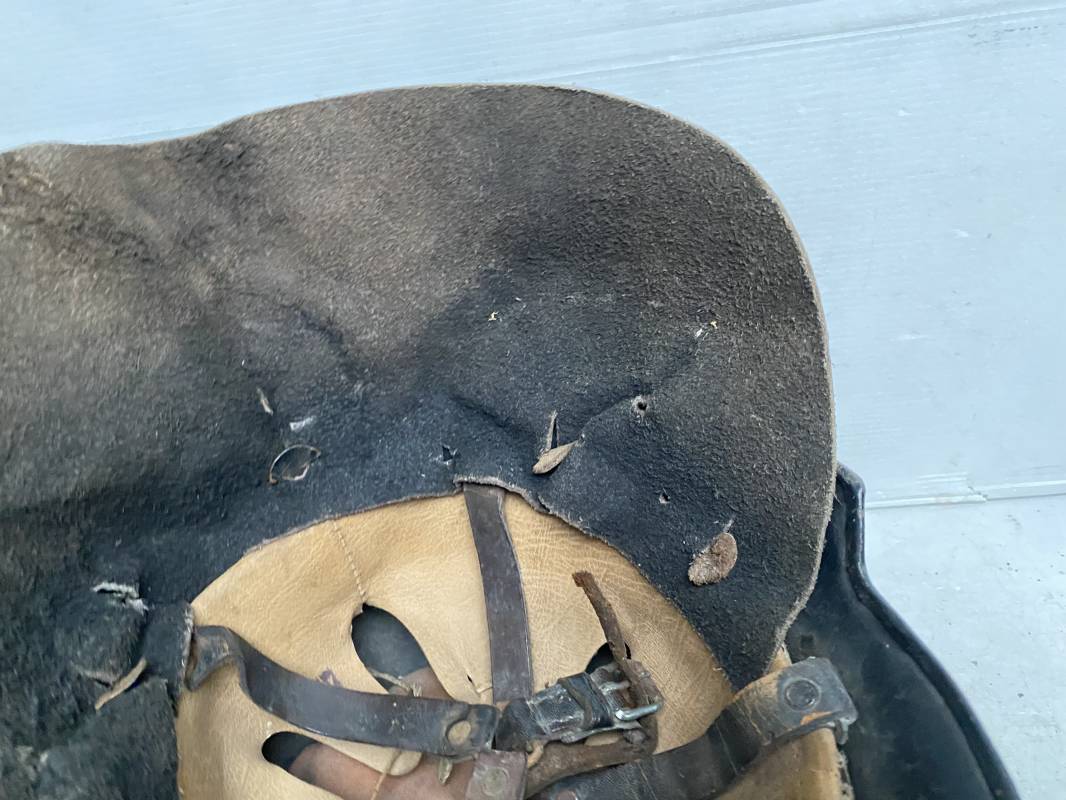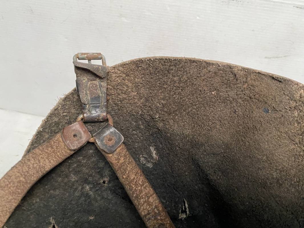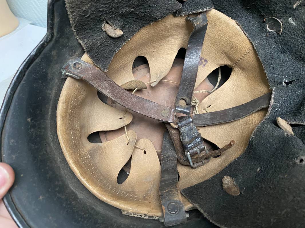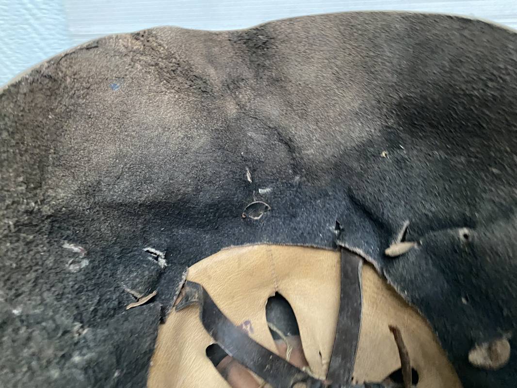 Trés beau casque Mdle 1934 du FeuerSchutz Polizei avec sa protection amovible nuquière en cuir . Casque acier avec peinture noire d'origine . Double insignes ; aigle polizei et insigne d'état . Aérateurs . Quatre rivets . Coiffe intérieur en cuir fauve , lacet de serrage ,Taille 57 , tampon amortisseur en fond de bombe .Cuir souple jamais ciré . Quatre passants cuir pour la fixation de la protection nuquière . Rare nuquière en cuir noir , cuir souple Jugulaire en 'V' en cuir , une boucle métallique à un ardillon . A noté bout de jugulaire manquant et fragilité au niveau d'un rivet métallique ( voir photos ) . Beau casque légèrement porté en parfait état 1935/45 Ref 18727