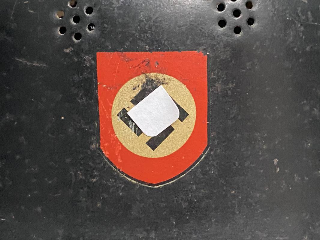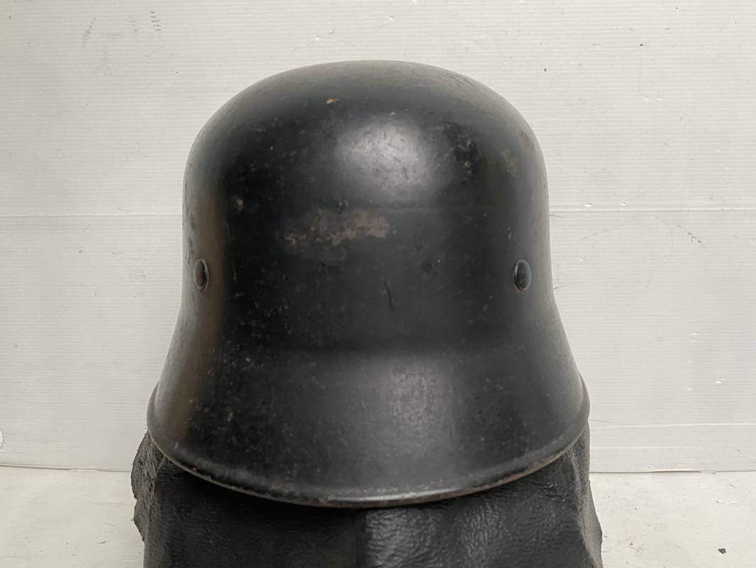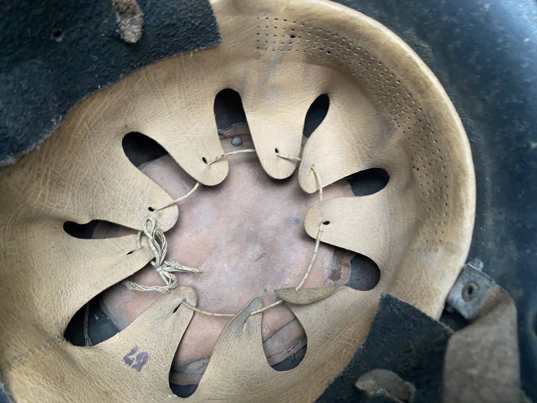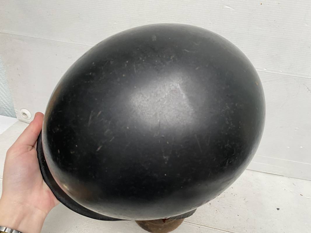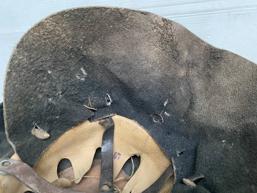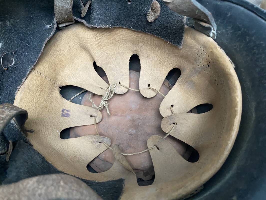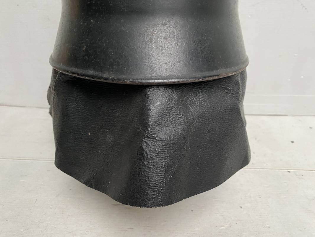 Trés beau casque Mdle 1934 du FeuerSchutz Polizei avec sa protection amovible nuquière en cuir . Casque acier avec peinture noire d'origine . Double insignes ; aigle polizei et insigne d'état . Aérateurs . Quatre rivets . Coiffe intérieur en cuir fauve , lacet de serrage ,Taille 57 , tampon amortisseur en fond de bombe .Cuir souple jamais ciré . Quatre passants cuir pour la fixation de la protection nuquière . Rare nuquière en cuir noir , cuir souple Jugulaire en 'V' en cuir , une boucle métallique à un ardillon . A noté bout de jugulaire manquant et fragilité au niveau d'un rivet métallique ( voir photos ) . Beau casque légèrement porté en parfait état 1935/45 Ref 18727