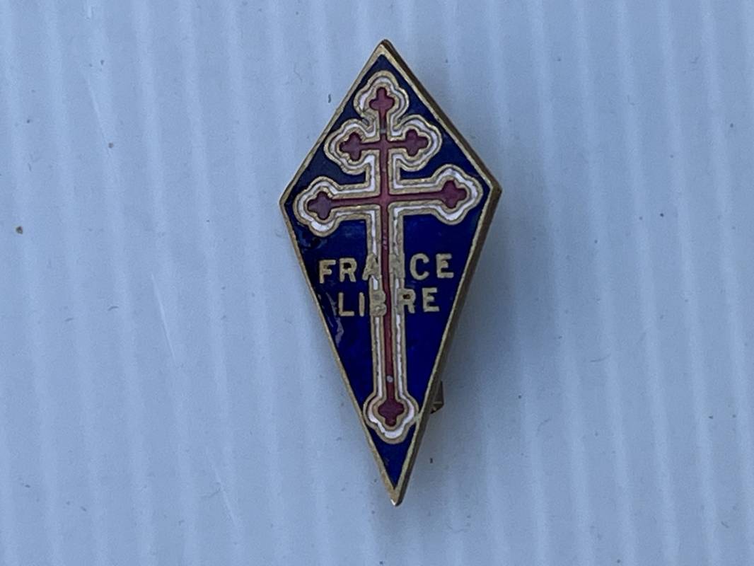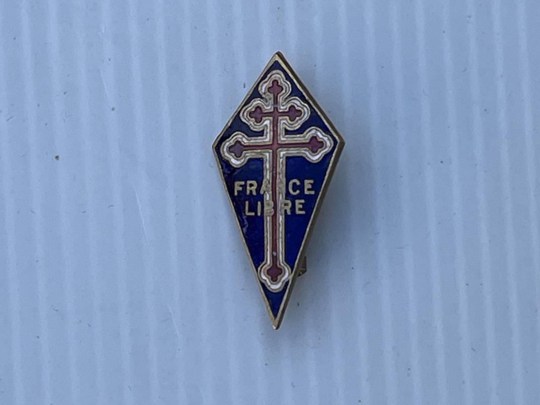 Rare insigne de la Force Francaise Libre . Losage émaillé Dimensions 33X17 mm . Email en parfait état . Fabrication anglaise 1940/44 . Marquage au dos Regen 83830 . Attache et crochets d origine . Parfait état 1940/44 Ref 21625