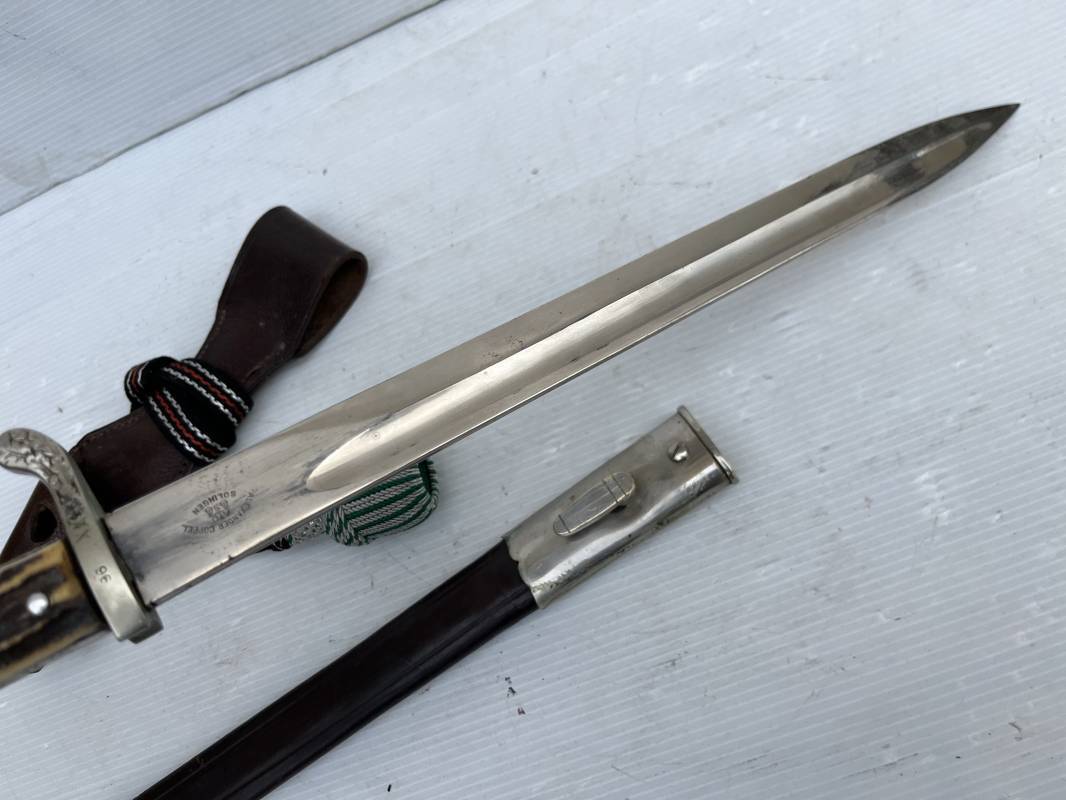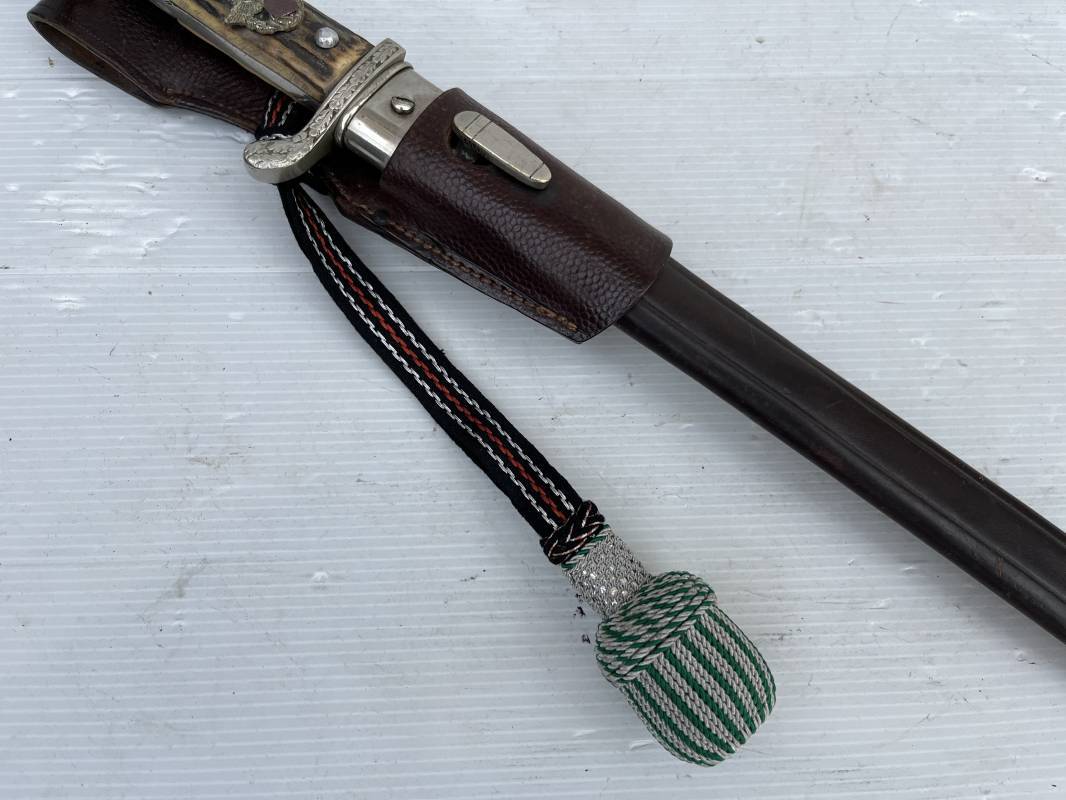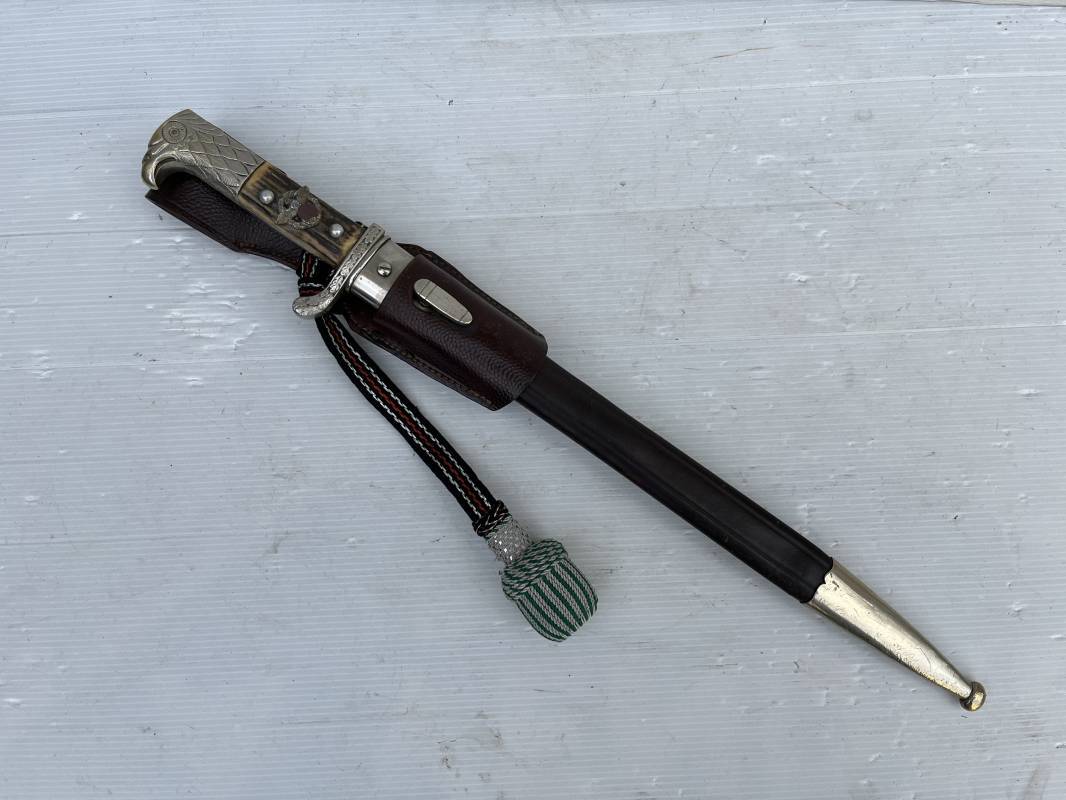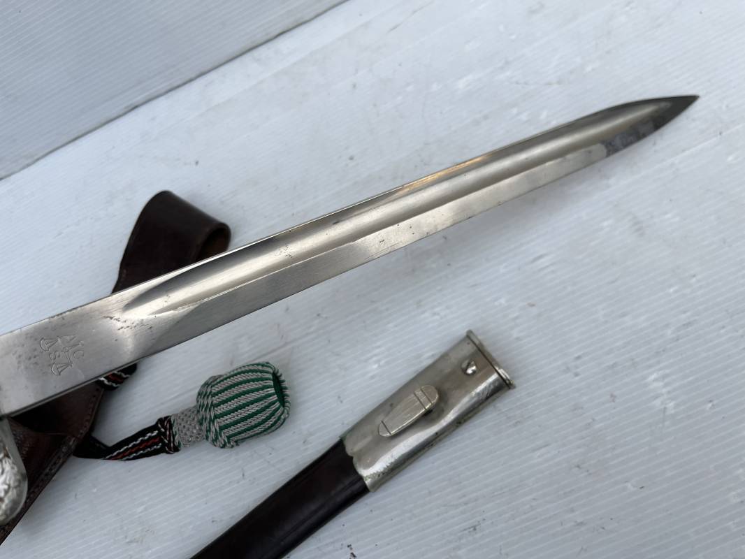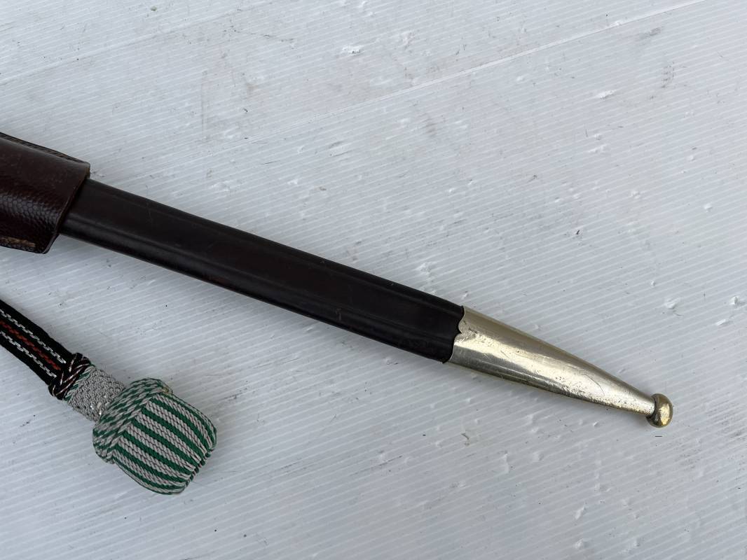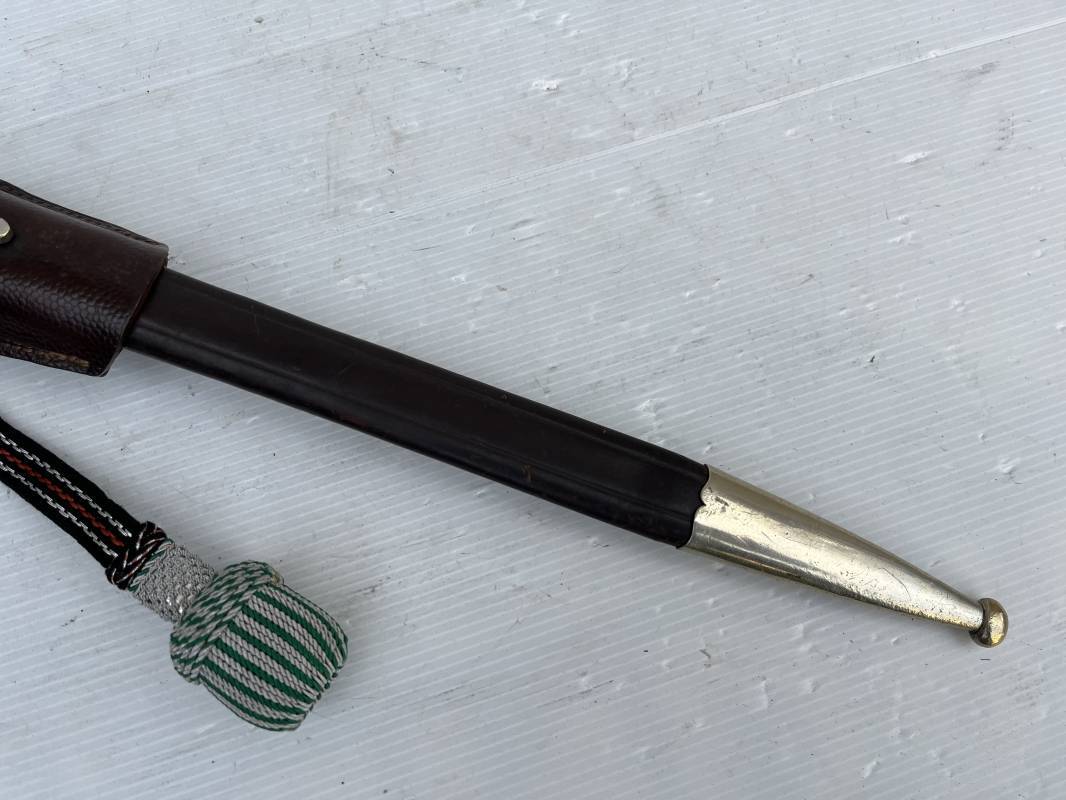 Trés belle baionnette troupe de la gendarmerie allemande avec sa dragonne et son gousset en cuir marron . Longueur totale 49 cm . Plaquettes en corne , insigne métallique de la gendarmerie dans la poignée . Pommeau en forme de téte d'aigle stylisé . Quillon avec ornements feuilles de chène . Trés belle lame acier sans aucune trace d'oxydation .Double Marquages fabricant ACSolingen et logo sur la lame Marquage d'affectation sur quillon et tranche de lame w16 . Fourreau en cuir marron , chape et garniture en acier marquage affectation 96 et effacement de l'ancienne affectation , téton metallique de fixation Gousset en cuir grenelé marron , passant cuir de ceinturon .Dragonne troupe en coton noir , fil aluminium et coton rouge . Gland cannetille argent fil aluminium et vert Parfait état . 1935/45 Ref 19767
