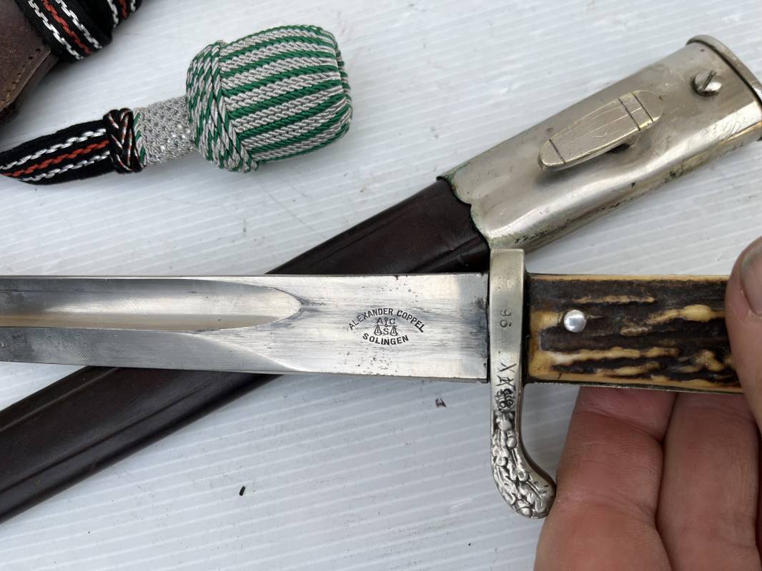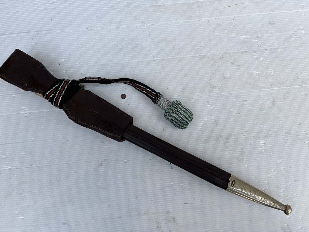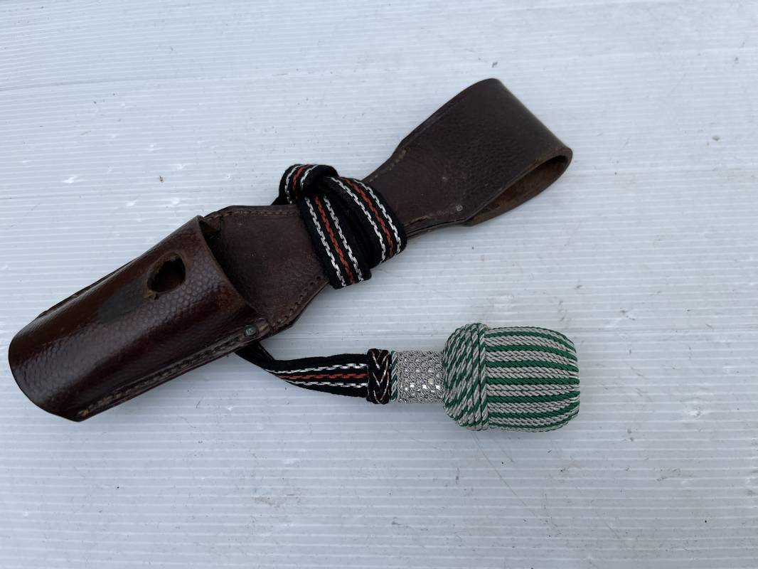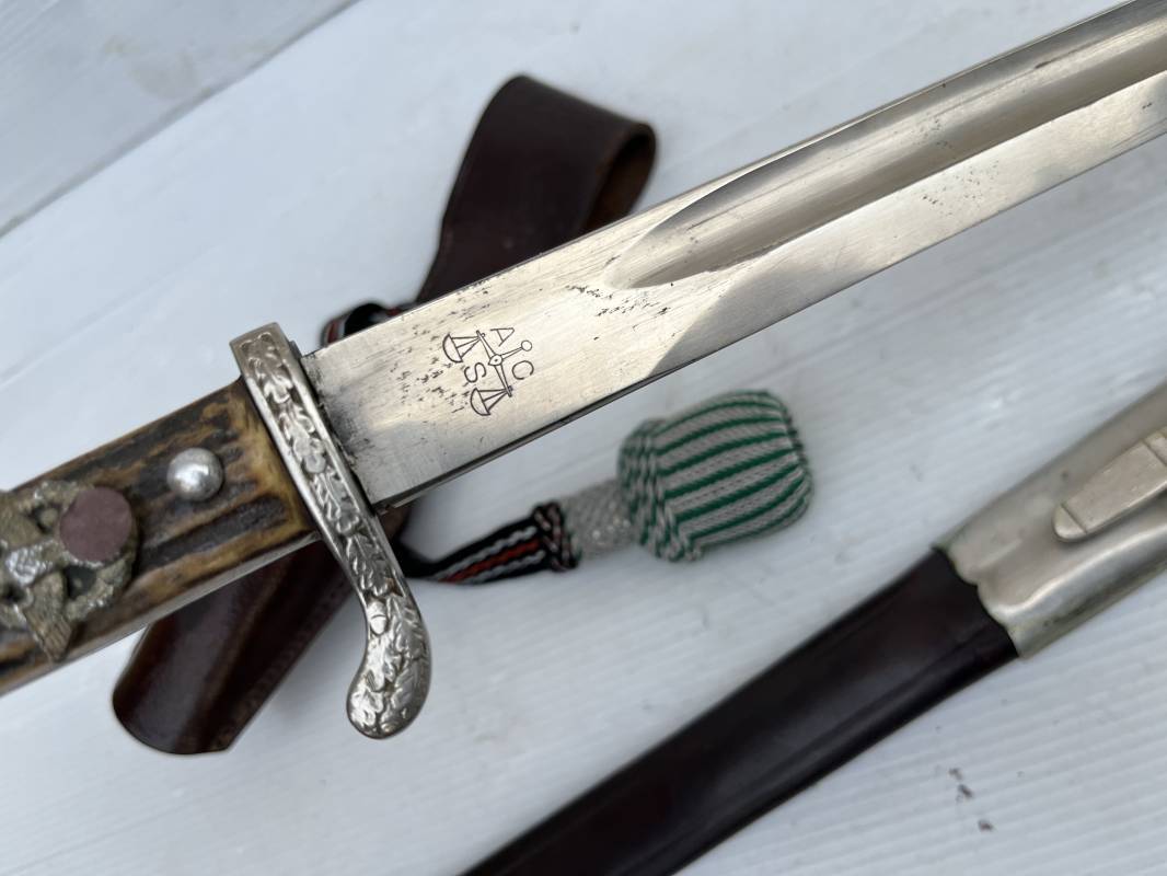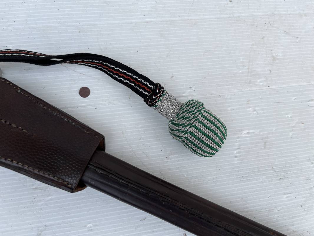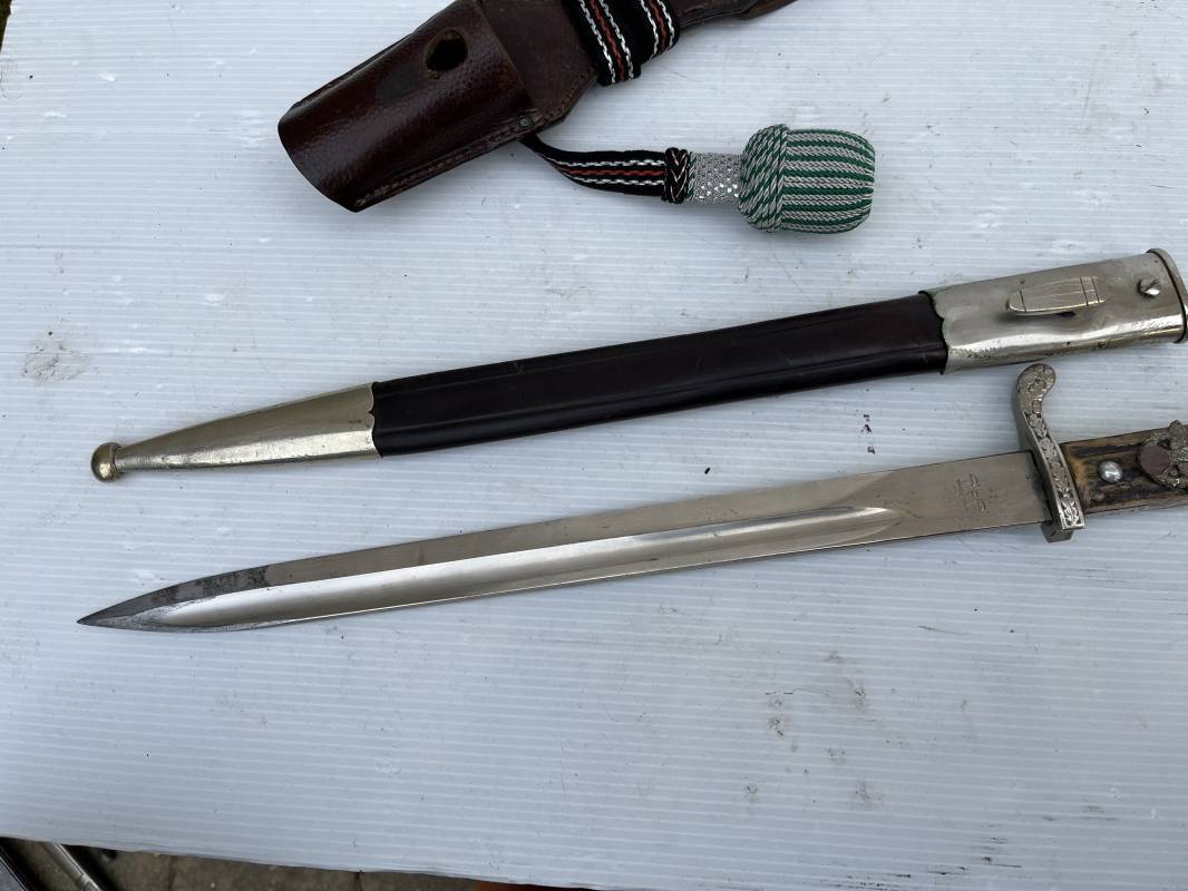 Trés belle baionnette troupe de la gendarmerie allemande avec sa dragonne et son gousset en cuir marron . Longueur totale 49 cm . Plaquettes en corne , insigne métallique de la gendarmerie dans la poignée . Pommeau en forme de téte d'aigle stylisé . Quillon avec ornements feuilles de chène . Trés belle lame acier sans aucune trace d'oxydation .Double Marquages fabricant ACSolingen et logo sur la lame Marquage d'affectation sur quillon et tranche de lame w16 . Fourreau en cuir marron , chape et garniture en acier marquage affectation 96 et effacement de l'ancienne affectation , téton metallique de fixation Gousset en cuir grenelé marron , passant cuir de ceinturon .Dragonne troupe en coton noir , fil aluminium et coton rouge . Gland cannetille argent fil aluminium et vert Parfait état . 1935/45 Ref 19767