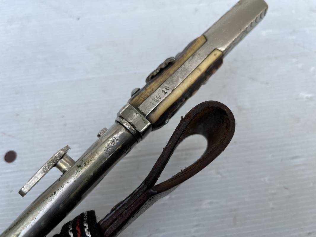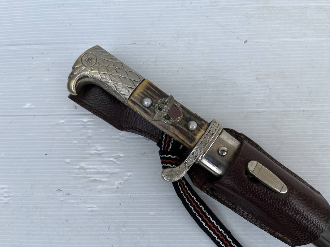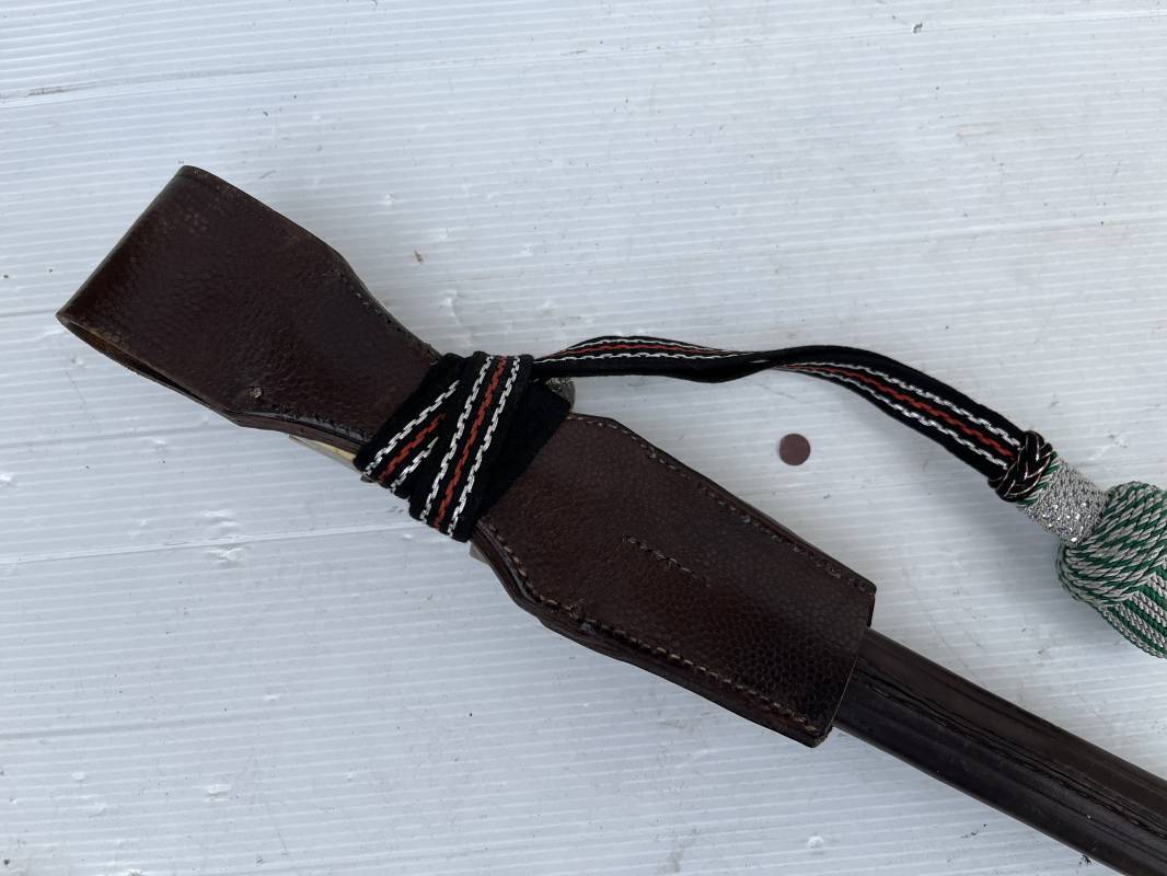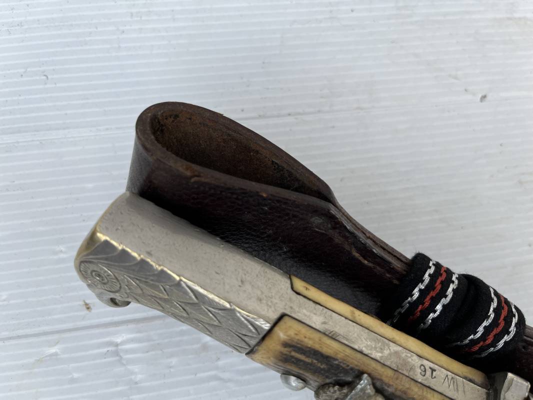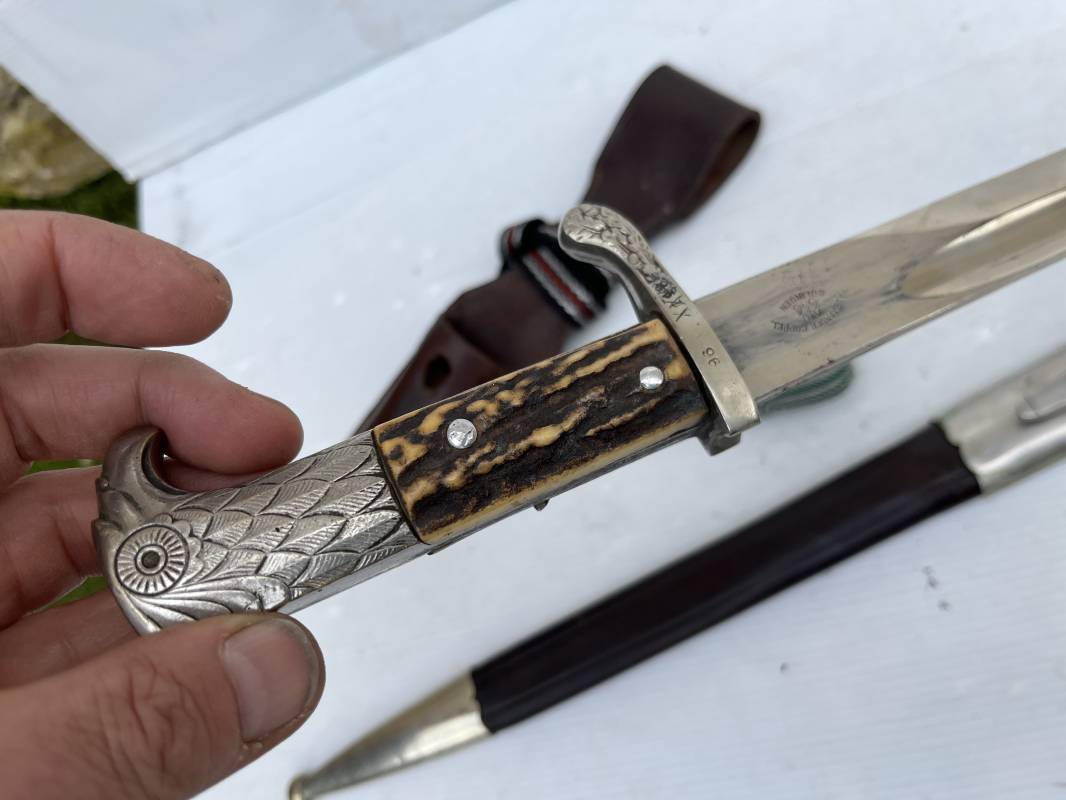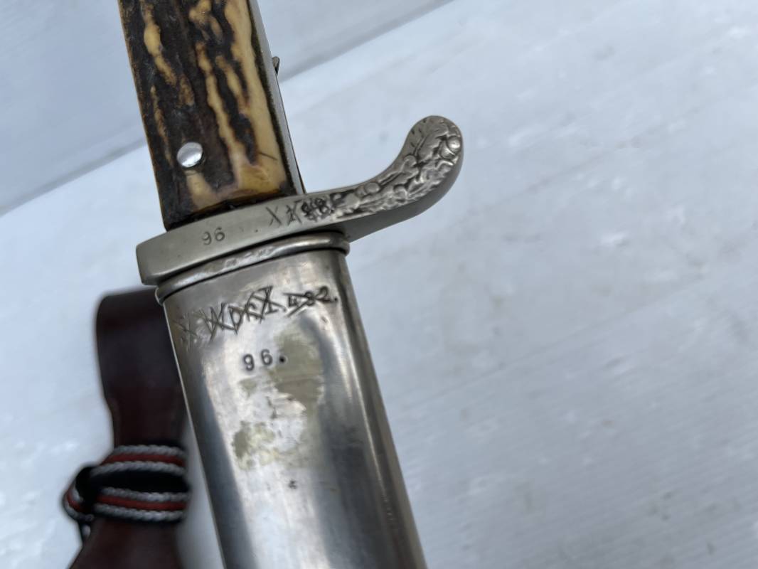Trés belle baionnette troupe de la gendarmerie allemande avec sa dragonne et son gousset en cuir marron . Longueur totale 49 cm . Plaquettes en corne , insigne métallique de la gendarmerie dans la poignée . Pommeau en forme de téte d'aigle stylisé . Quillon avec ornements feuilles de chène . Trés belle lame acier sans aucune trace d'oxydation .Double Marquages fabricant ACSolingen et logo sur la lame Marquage d'affectation sur quillon et tranche de lame w16 . Fourreau en cuir marron , chape et garniture en acier marquage affectation 96 et effacement de l'ancienne affectation , téton metallique de fixation Gousset en cuir grenelé marron , passant cuir de ceinturon .Dragonne troupe en coton noir , fil aluminium et coton rouge . Gland cannetille argent fil aluminium et vert Parfait état . 1935/45 Ref 19767
