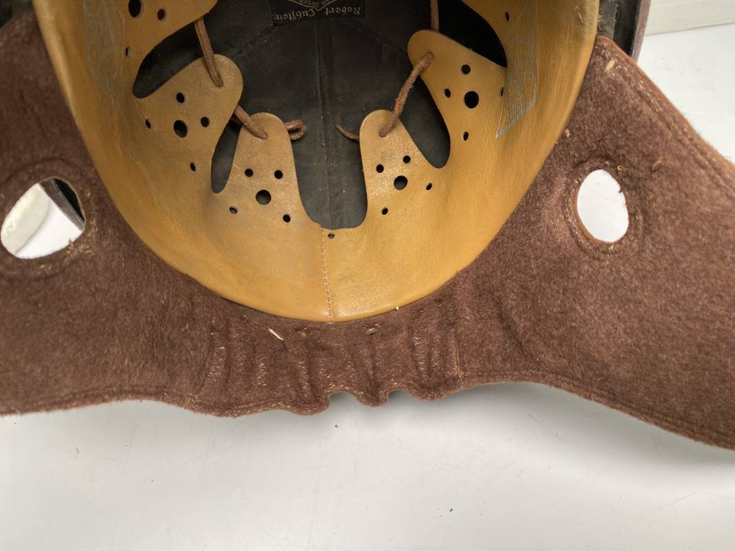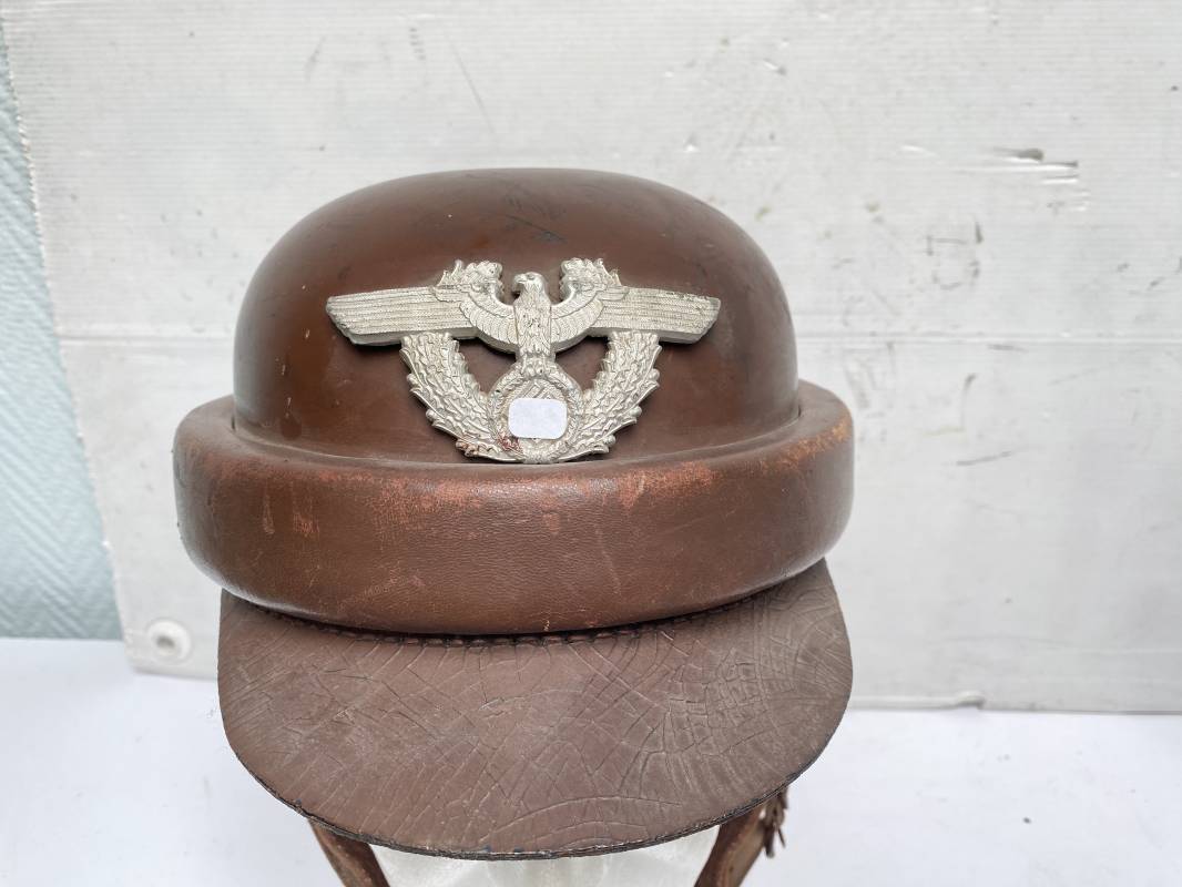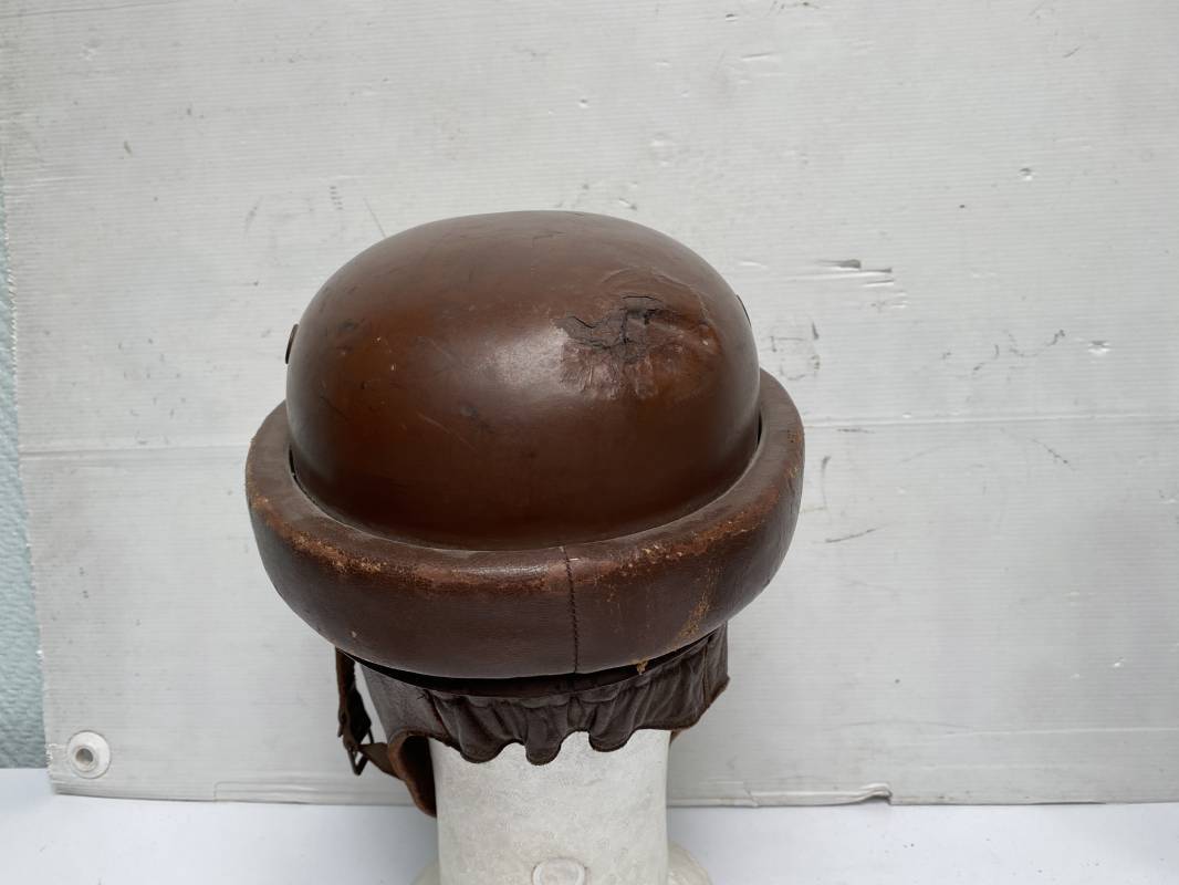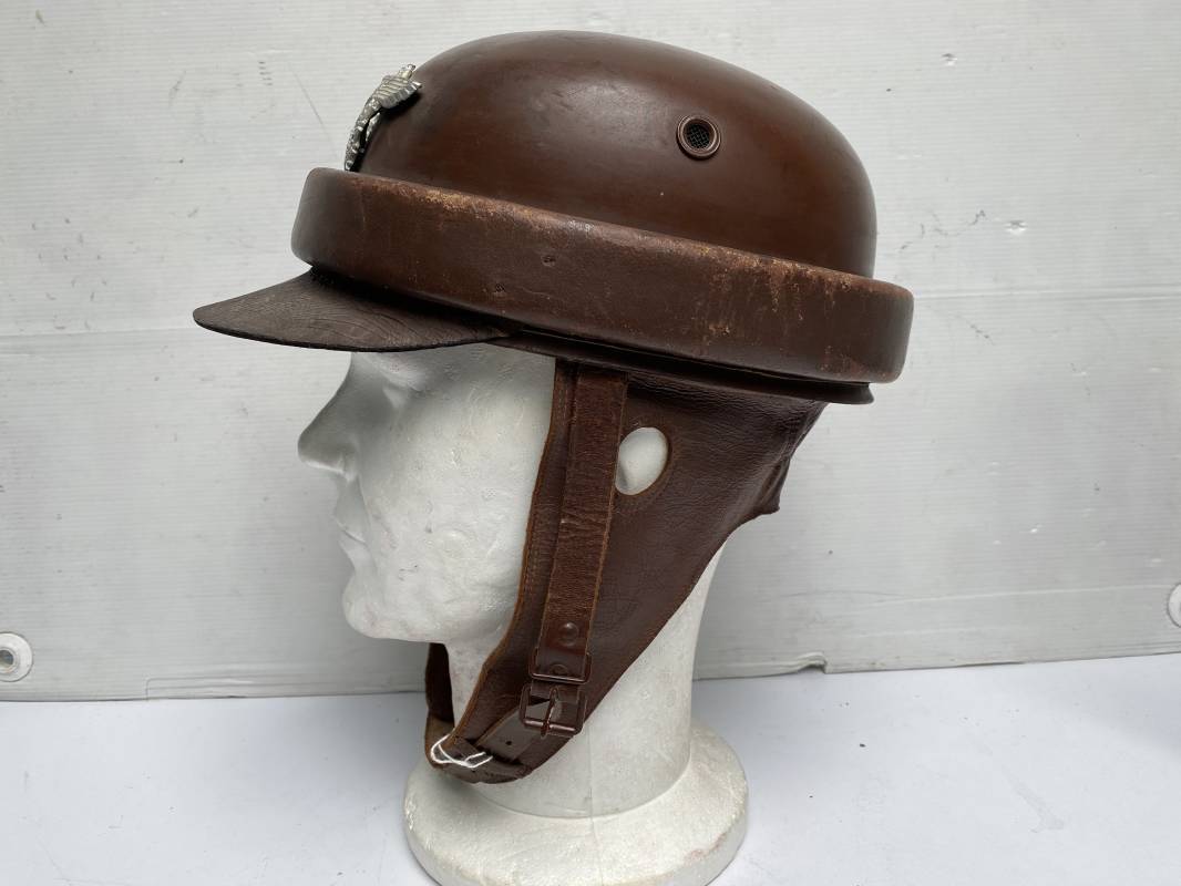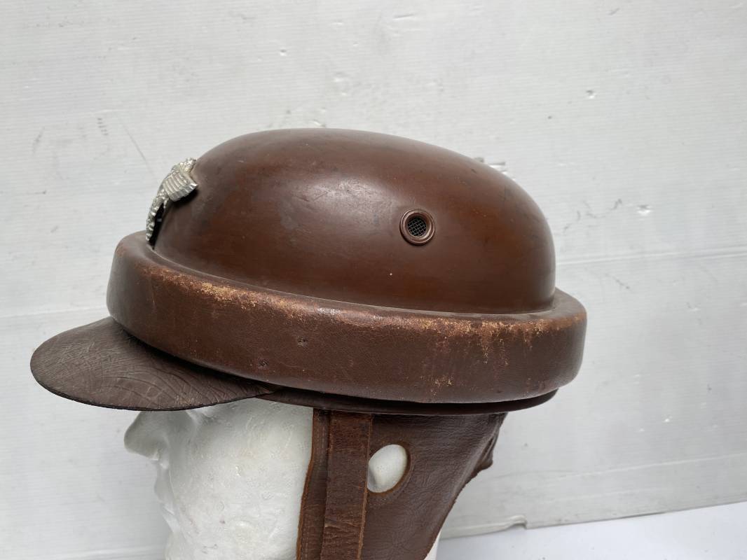 Rare casque d'un motard de la gendarmerie allemande . Casque anti choc en cuir marron clair . Insigne frontal en aluminium de la gendarmerie . Visière et bourrelet de protection Oeillets de ventillation . Bavolets en cuir doublé laine marron , jugulaire et boucle métallique à un ardillon . Coiffe intérieure en cuir beige claire avec logo et marquage fabricant Erel ' Fiber Helm' . Etiquette tissu en fond de bombe fabricant Robert Lubstein Erel Berlin Taille 59 . Casque légérement porté en parfait état . A noté un choc sur l'arrière de la bombe ( voir photo ) . Rare casque d'un motard de la gendarmerie 1935/45 Ref 8649