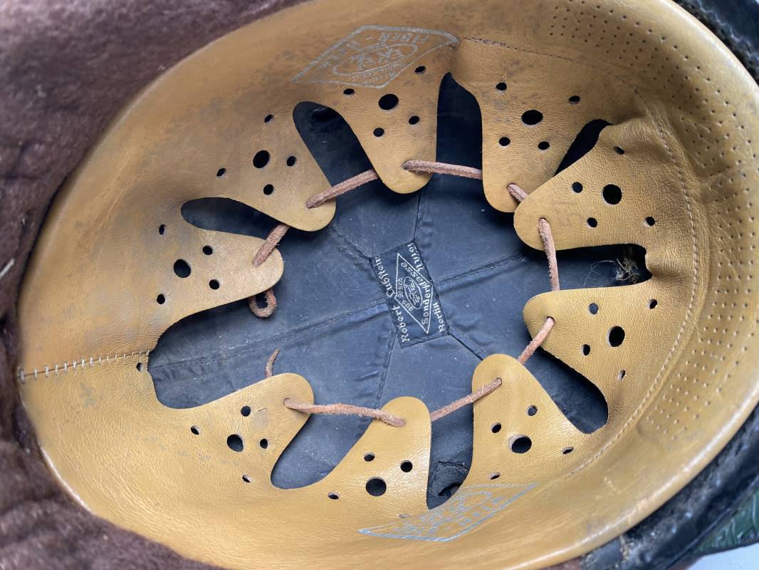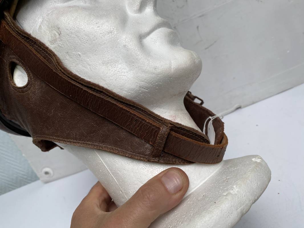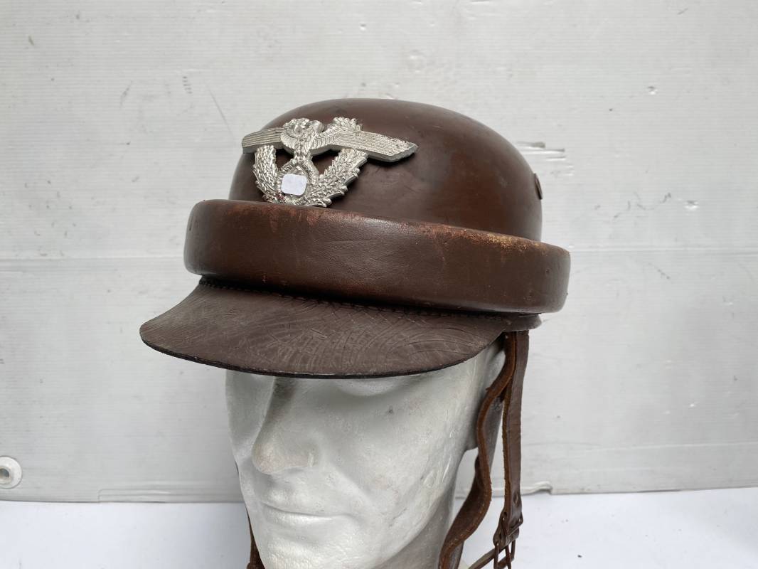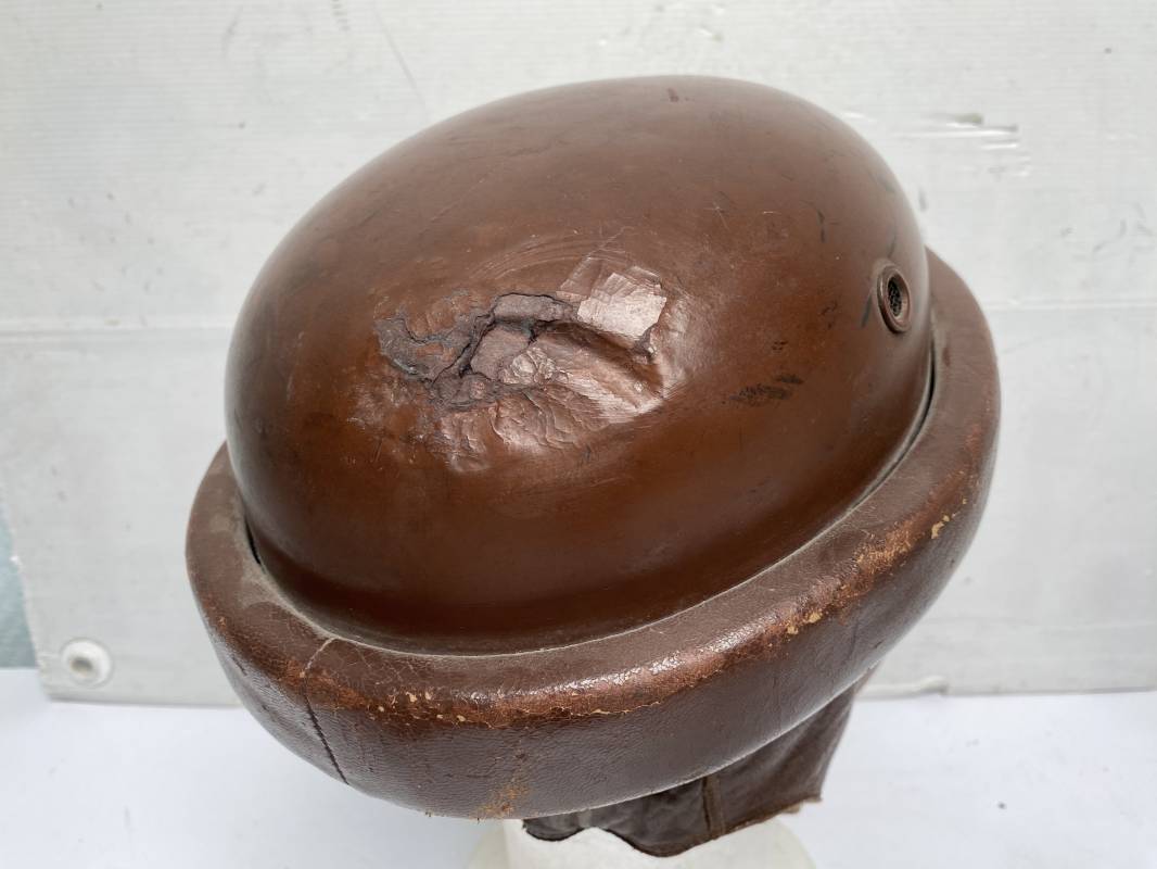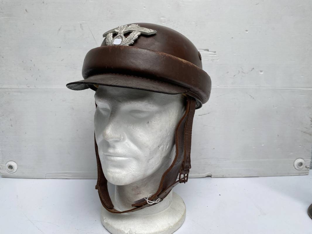Rare casque d'un motard de la gendarmerie allemande . Casque anti choc en cuir marron clair . Insigne frontal en aluminium de la gendarmerie . Visière et bourrelet de protection Oeillets de ventillation . Bavolets en cuir doublé laine marron , jugulaire et boucle métallique à un ardillon . Coiffe intérieure en cuir beige claire avec logo et marquage fabricant Erel ' Fiber Helm' . Etiquette tissu en fond de bombe fabricant Robert Lubstein Erel Berlin Taille 59 . Casque légérement porté en parfait état . A noté un choc sur l'arrière de la bombe ( voir photo ) . Rare casque d'un motard de la gendarmerie 1935/45 Ref 8649