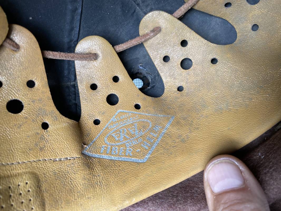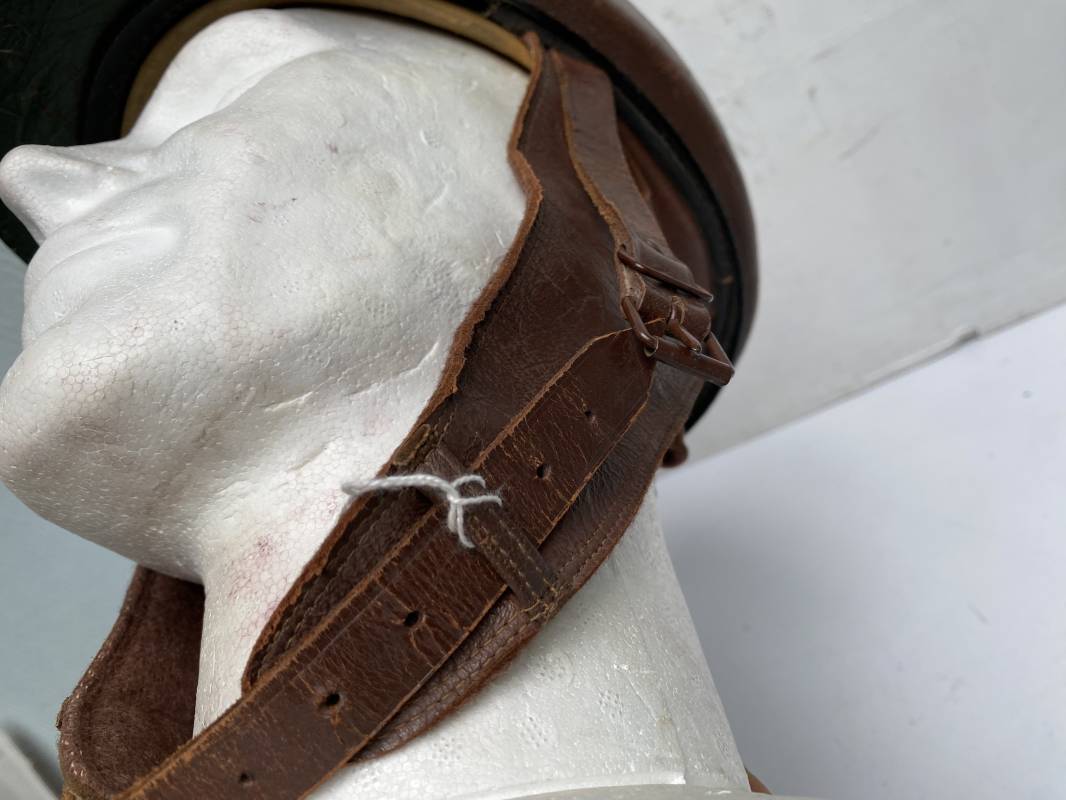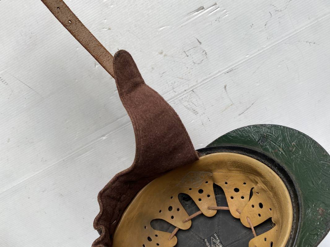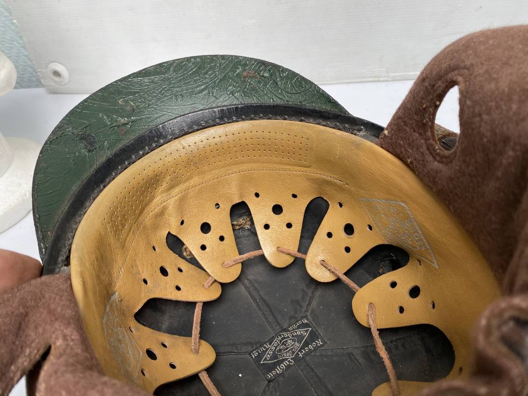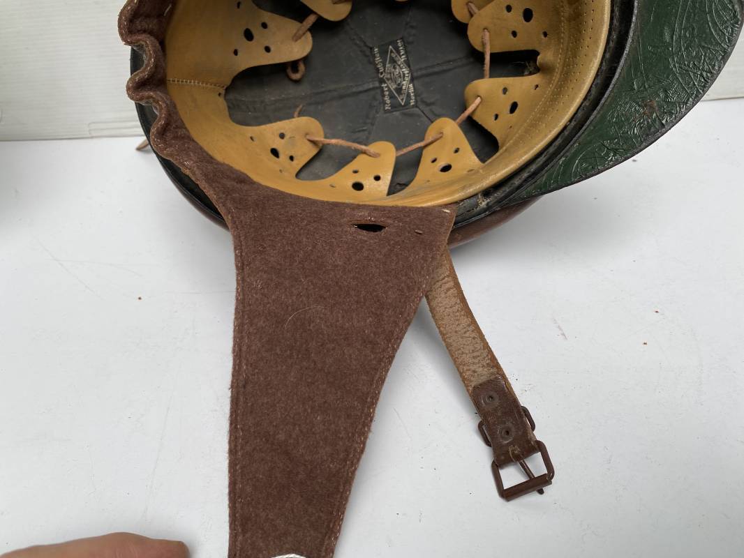 Rare casque d'un motard de la gendarmerie allemande . Casque anti choc en cuir marron clair . Insigne frontal en aluminium de la gendarmerie . Visière et bourrelet de protection Oeillets de ventillation . Bavolets en cuir doublé laine marron , jugulaire et boucle métallique à un ardillon . Coiffe intérieure en cuir beige claire avec logo et marquage fabricant Erel ' Fiber Helm' . Etiquette tissu en fond de bombe fabricant Robert Lubstein Erel Berlin Taille 59 . Casque légérement porté en parfait état . A noté un choc sur l'arrière de la bombe ( voir photo ) . Rare casque d'un motard de la gendarmerie 1935/45 Ref 8649