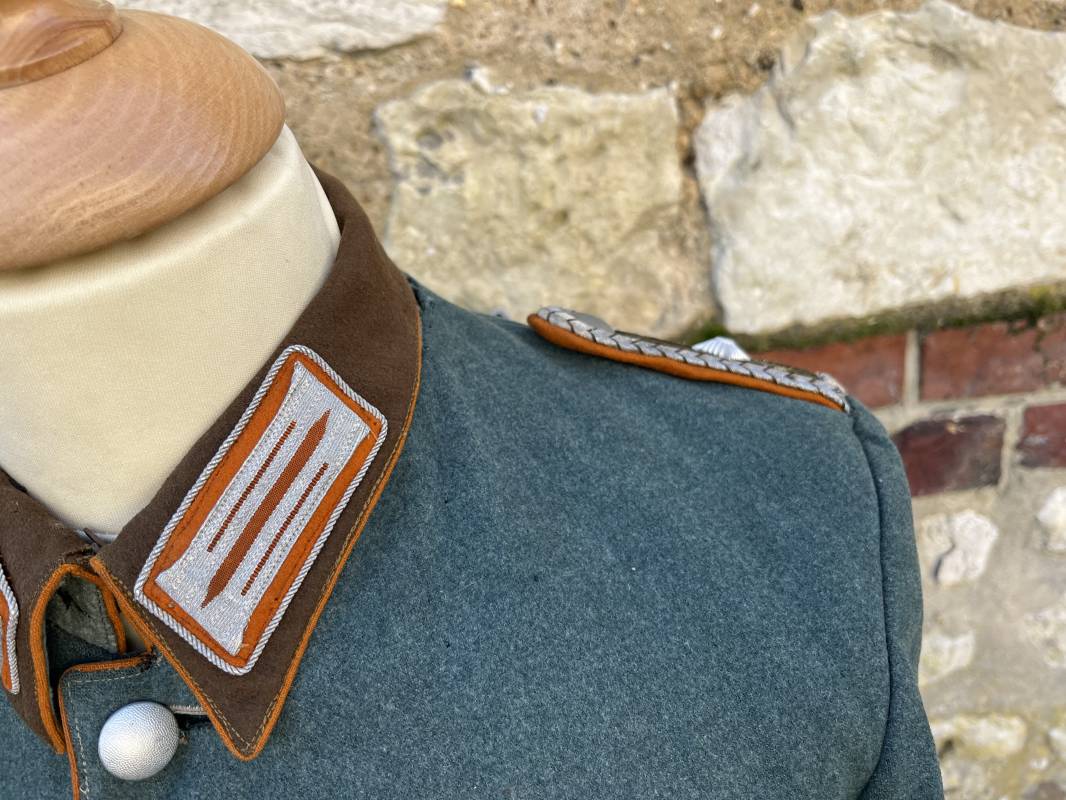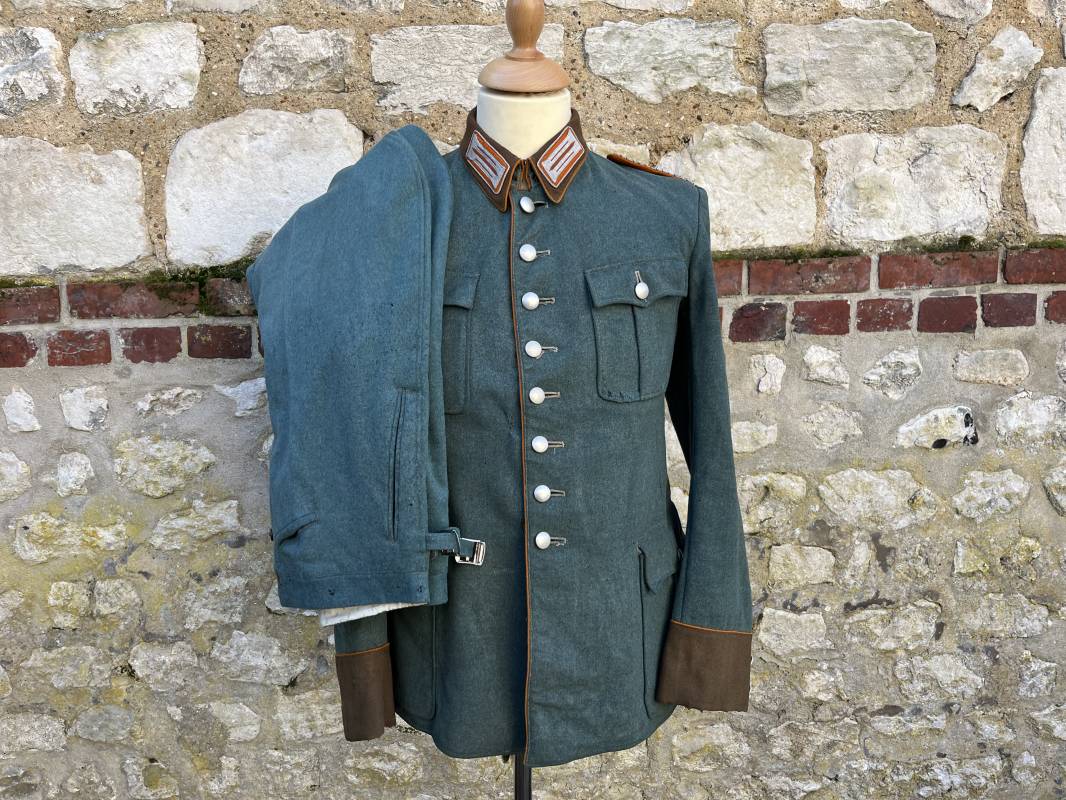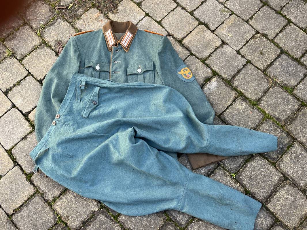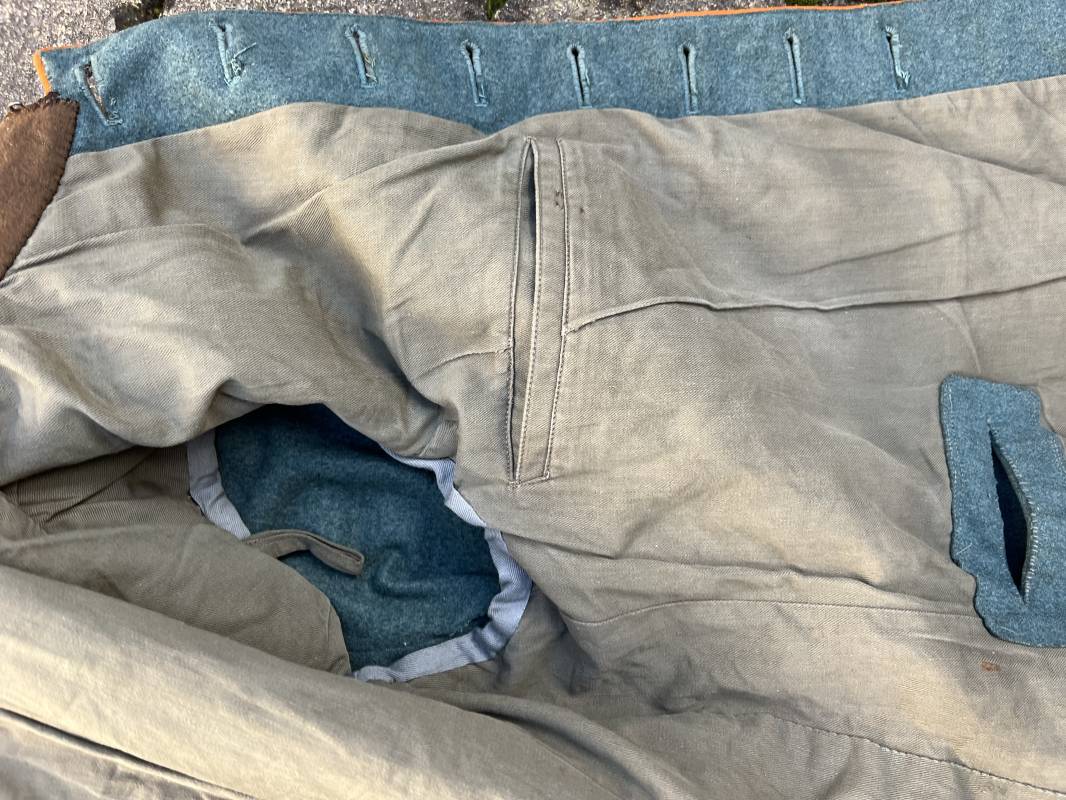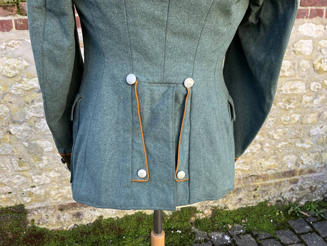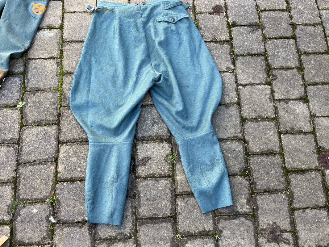 Bel ensemble veste et culotte d un gendarme . Cette veste et culotte ont été trouvés en succession familiale dans le sud de la France . Veste de service ( Dienstrock) d un sous officier gendarme en drap vert , quatre poches a rabts boutonnés , fermeture frontale à huit boutons , boutons grenelé argent cousus d origine . Col en drap marron , pattes de col ( litzen )avec socle orange de la gendarmerie . Montées machine d origine . Pattes d épaules du modele cousues aux enmanchures , liseré orange , grade de sous officier ( adjudant ) .Aigle de bras troupe brodé en coton orange cousu mains sur la manche gauche . Bas des manches a revers de drap marron liseré orange et deux boutons grenelé . Intérieur doublé en coton vert , une poche intérieure , passage pour le port du sabre deux poches fessières dans l interieur de la doublure . . Largeur épaules 43 cm , longueur 74 cm , manche 63 cm Culotte en drap vert , trois poches dont une fessière deux passants lateraux de serrge de taille , boutons en plastiqye vert cousus d origine , crochet métallique de braguette . Bas des jambes a glissières d origines et fonctionnelles , marquage fabricant Zipp . Doublure intérieure en coton blanc a motifs , et oches en coton gris vert . Taille 40 Longueur 95 cm . Bel ensemble homogéne ayant appatenu au meme homme . Ensemble porté et dans son jus . Petites usures et trous de mites Trés belle patine générale . Drap frais . 100 % natrure et totalement intouché Bel ensemble Jus et terrain . 1935/45 Ref 21819