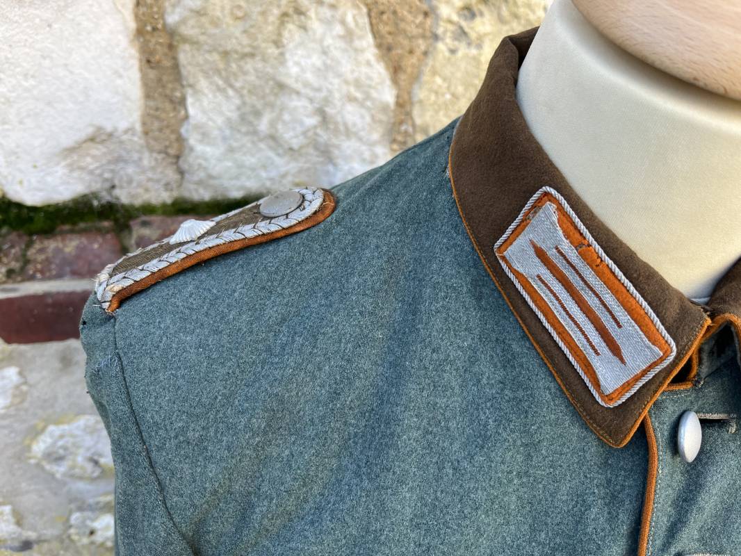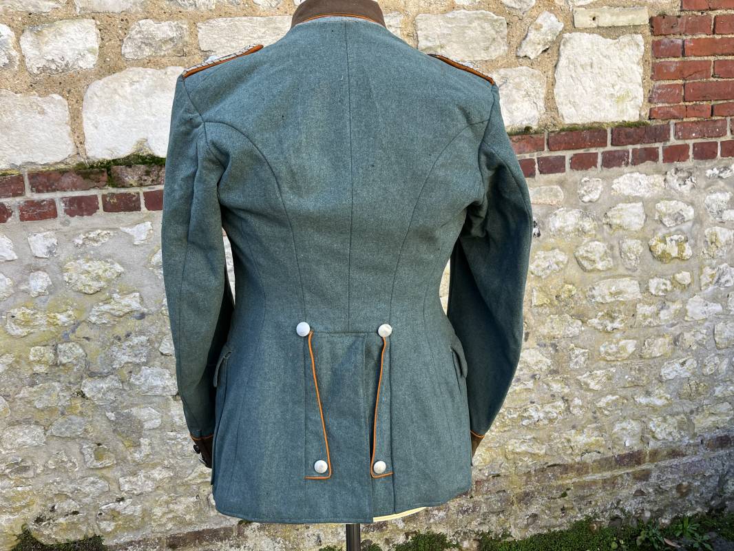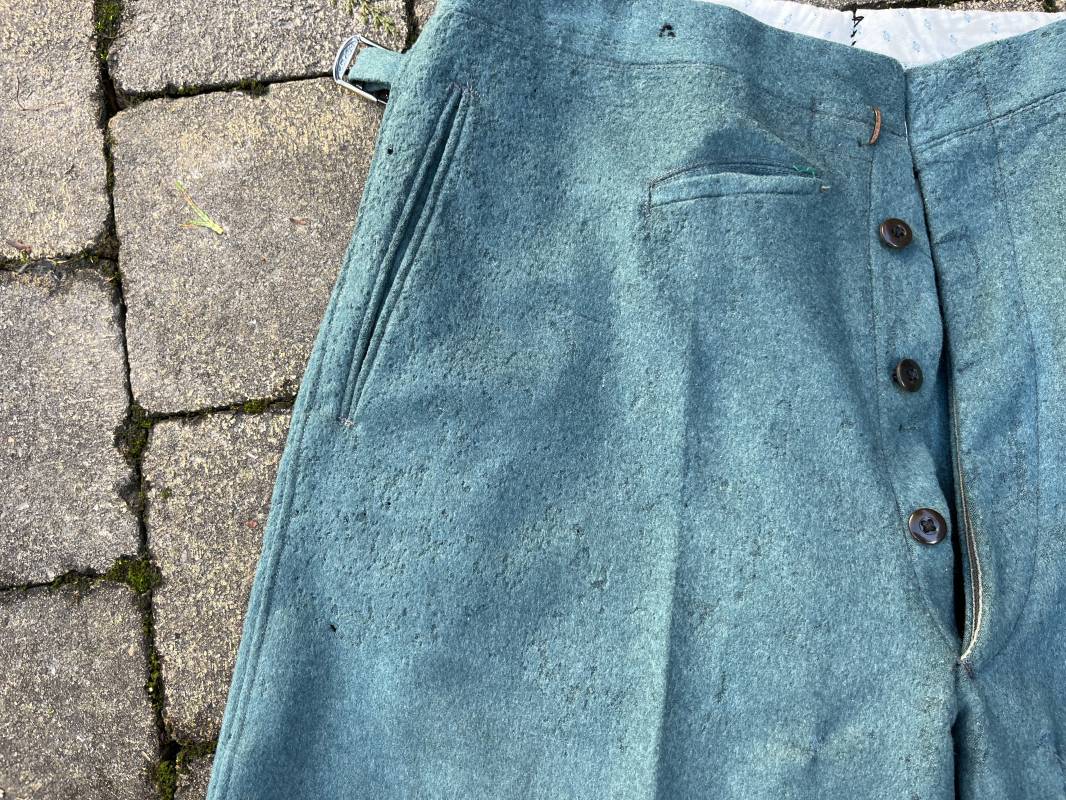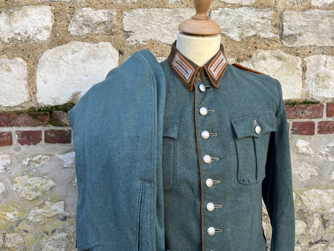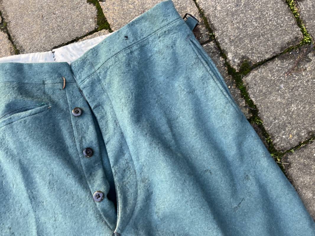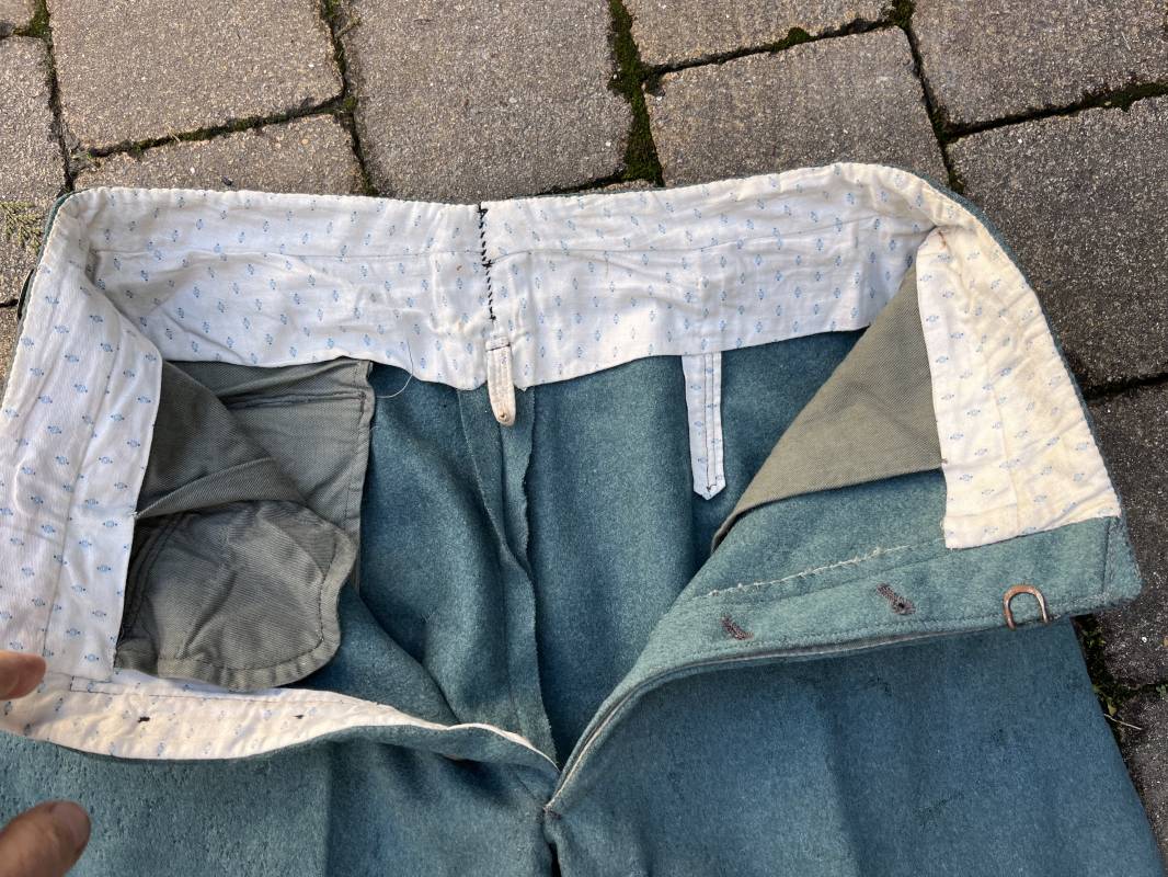 Bel ensemble veste et culotte d un gendarme . Cette veste et culotte ont été trouvés en succession familiale dans le sud de la France . Veste de service ( Dienstrock) d un sous officier gendarme en drap vert , quatre poches a rabts boutonnés , fermeture frontale à huit boutons , boutons grenelé argent cousus d origine . Col en drap marron , pattes de col ( litzen )avec socle orange de la gendarmerie . Montées machine d origine . Pattes d épaules du modele cousues aux enmanchures , liseré orange , grade de sous officier ( adjudant ) .Aigle de bras troupe brodé en coton orange cousu mains sur la manche gauche . Bas des manches a revers de drap marron liseré orange et deux boutons grenelé . Intérieur doublé en coton vert , une poche intérieure , passage pour le port du sabre deux poches fessières dans l interieur de la doublure . . Largeur épaules 43 cm , longueur 74 cm , manche 63 cm Culotte en drap vert , trois poches dont une fessière deux passants lateraux de serrge de taille , boutons en plastiqye vert cousus d origine , crochet métallique de braguette . Bas des jambes a glissières d origines et fonctionnelles , marquage fabricant Zipp . Doublure intérieure en coton blanc a motifs , et oches en coton gris vert . Taille 40 Longueur 95 cm . Bel ensemble homogéne ayant appatenu au meme homme . Ensemble porté et dans son jus . Petites usures et trous de mites Trés belle patine générale . Drap frais . 100 % natrure et totalement intouché Bel ensemble Jus et terrain . 1935/45 Ref 21819