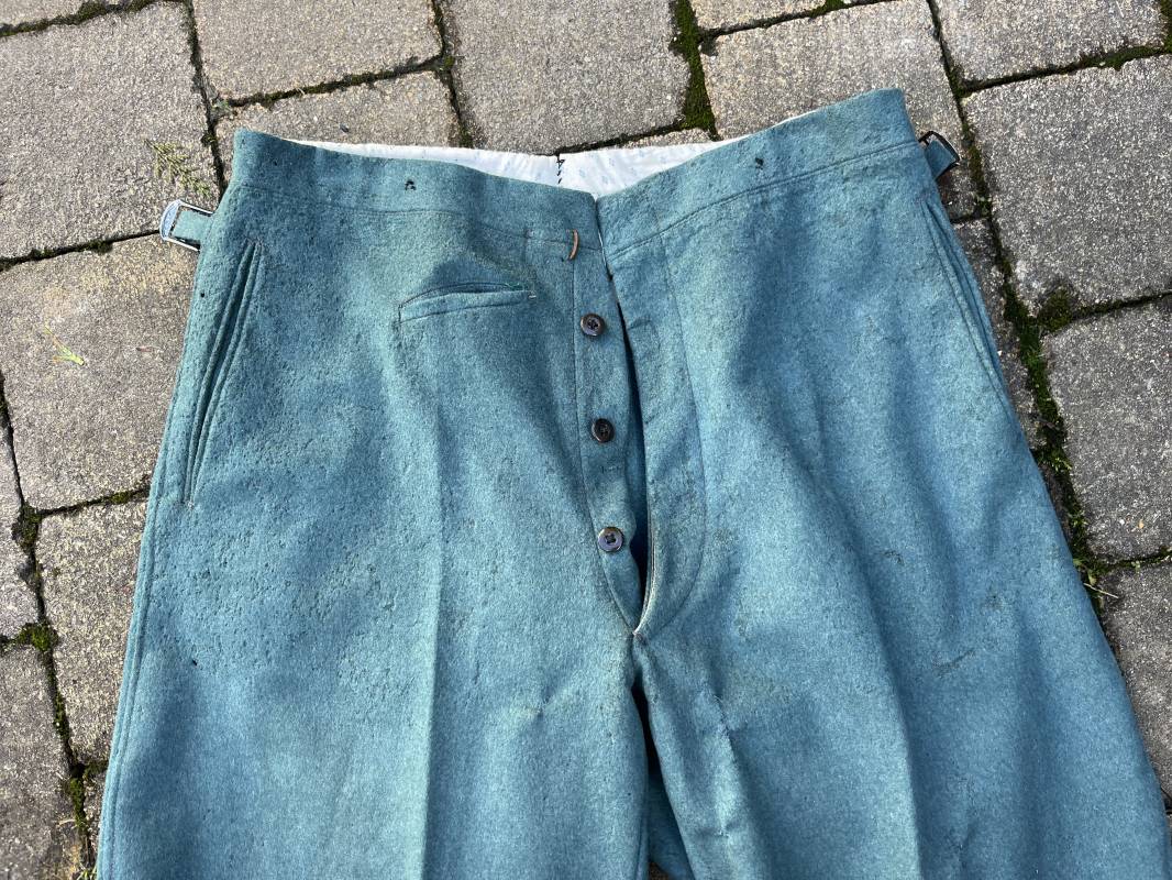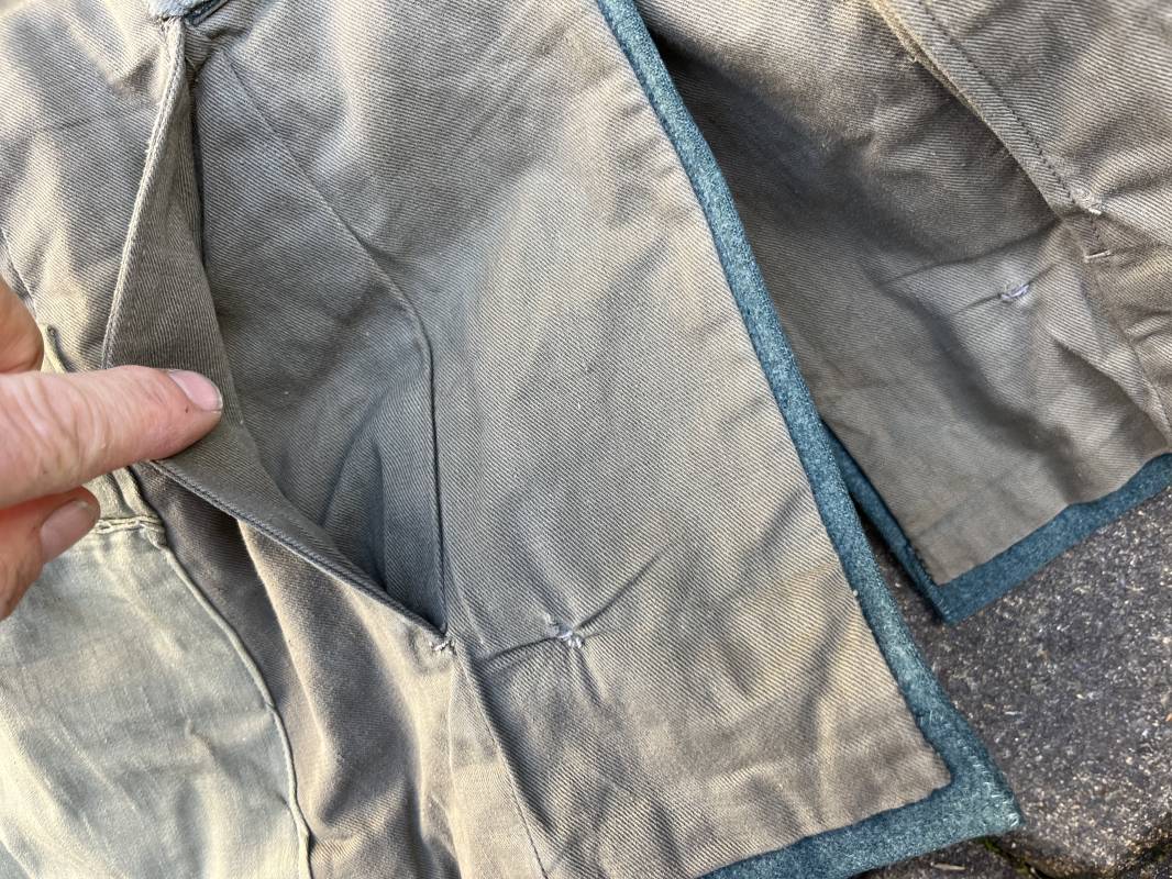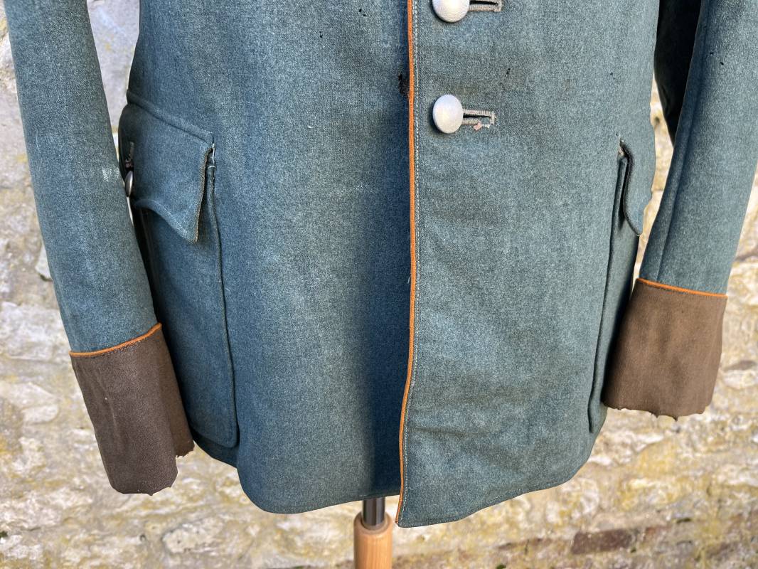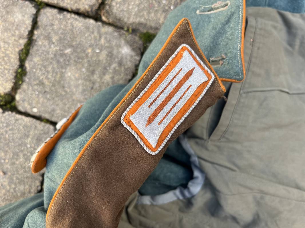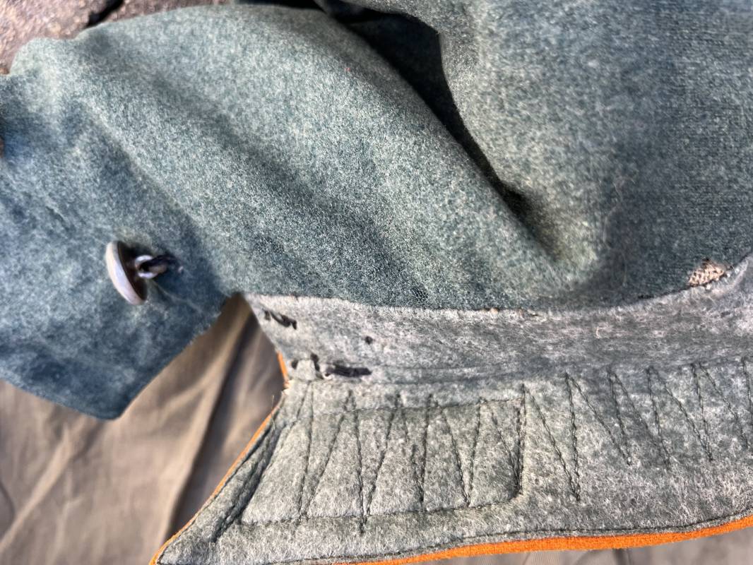 Bel ensemble veste et culotte d un gendarme . Cette veste et culotte ont été trouvés en succession familiale dans le sud de la France . Veste de service ( Dienstrock) d un sous officier gendarme en drap vert , quatre poches a rabts boutonnés , fermeture frontale à huit boutons , boutons grenelé argent cousus d origine . Col en drap marron , pattes de col ( litzen )avec socle orange de la gendarmerie . Montées machine d origine . Pattes d épaules du modele cousues aux enmanchures , liseré orange , grade de sous officier ( adjudant ) .Aigle de bras troupe brodé en coton orange cousu mains sur la manche gauche . Bas des manches a revers de drap marron liseré orange et deux boutons grenelé . Intérieur doublé en coton vert , une poche intérieure , passage pour le port du sabre deux poches fessières dans l interieur de la doublure . . Largeur épaules 43 cm , longueur 74 cm , manche 63 cm Culotte en drap vert , trois poches dont une fessière deux passants lateraux de serrge de taille , boutons en plastiqye vert cousus d origine , crochet métallique de braguette . Bas des jambes a glissières d origines et fonctionnelles , marquage fabricant Zipp . Doublure intérieure en coton blanc a motifs , et oches en coton gris vert . Taille 40 Longueur 95 cm . Bel ensemble homogéne ayant appatenu au meme homme . Ensemble porté et dans son jus . Petites usures et trous de mites Trés belle patine générale . Drap frais . 100 % natrure et totalement intouché Bel ensemble Jus et terrain . 1935/45 Ref 21819
