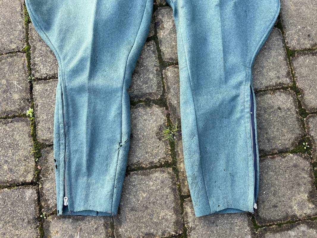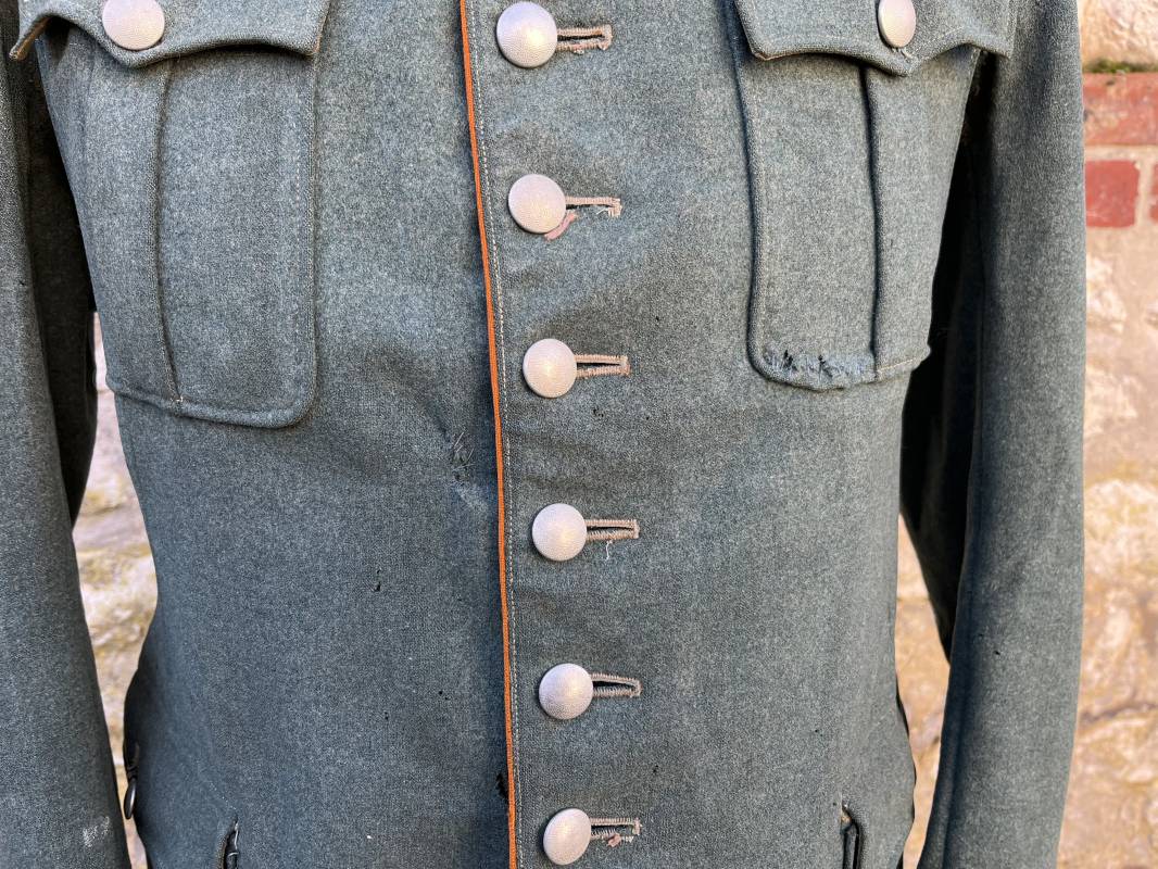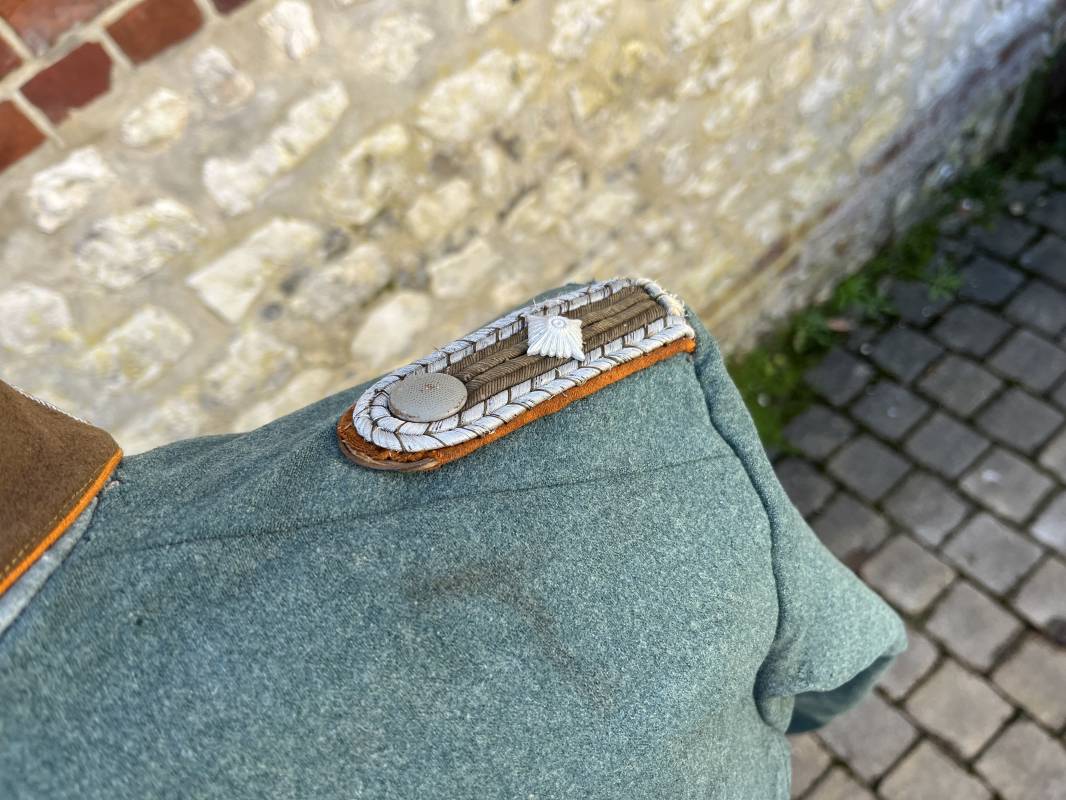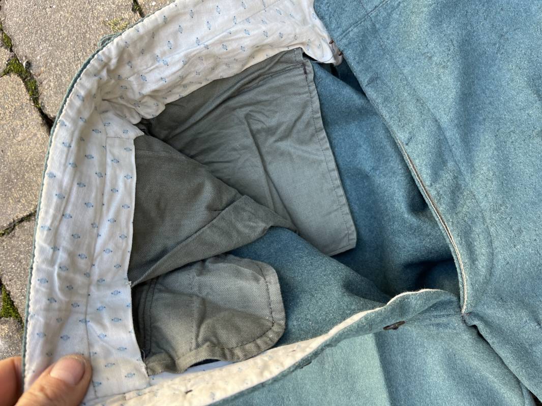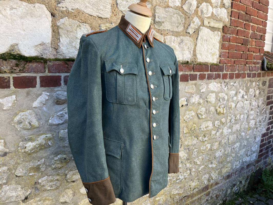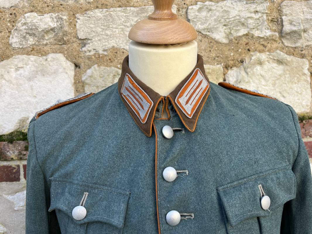 Bel ensemble veste et culotte d un gendarme . Cette veste et culotte ont été trouvés en succession familiale dans le sud de la France . Veste de service ( Dienstrock) d un sous officier gendarme en drap vert , quatre poches a rabts boutonnés , fermeture frontale à huit boutons , boutons grenelé argent cousus d origine . Col en drap marron , pattes de col ( litzen )avec socle orange de la gendarmerie . Montées machine d origine . Pattes d épaules du modele cousues aux enmanchures , liseré orange , grade de sous officier ( adjudant ) .Aigle de bras troupe brodé en coton orange cousu mains sur la manche gauche . Bas des manches a revers de drap marron liseré orange et deux boutons grenelé . Intérieur doublé en coton vert , une poche intérieure , passage pour le port du sabre deux poches fessières dans l interieur de la doublure . . Largeur épaules 43 cm , longueur 74 cm , manche 63 cm Culotte en drap vert , trois poches dont une fessière deux passants lateraux de serrge de taille , boutons en plastiqye vert cousus d origine , crochet métallique de braguette . Bas des jambes a glissières d origines et fonctionnelles , marquage fabricant Zipp . Doublure intérieure en coton blanc a motifs , et oches en coton gris vert . Taille 40 Longueur 95 cm . Bel ensemble homogéne ayant appatenu au meme homme . Ensemble porté et dans son jus . Petites usures et trous de mites Trés belle patine générale . Drap frais . 100 % natrure et totalement intouché Bel ensemble Jus et terrain . 1935/45 Ref 21819