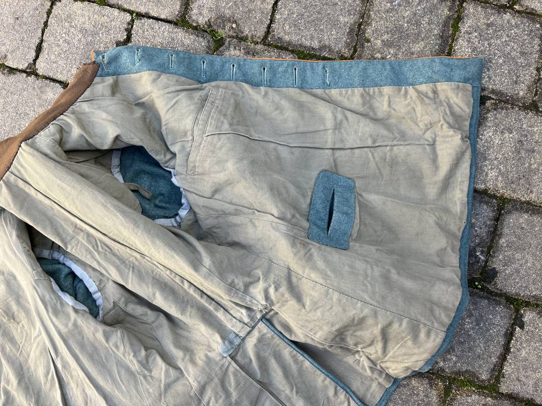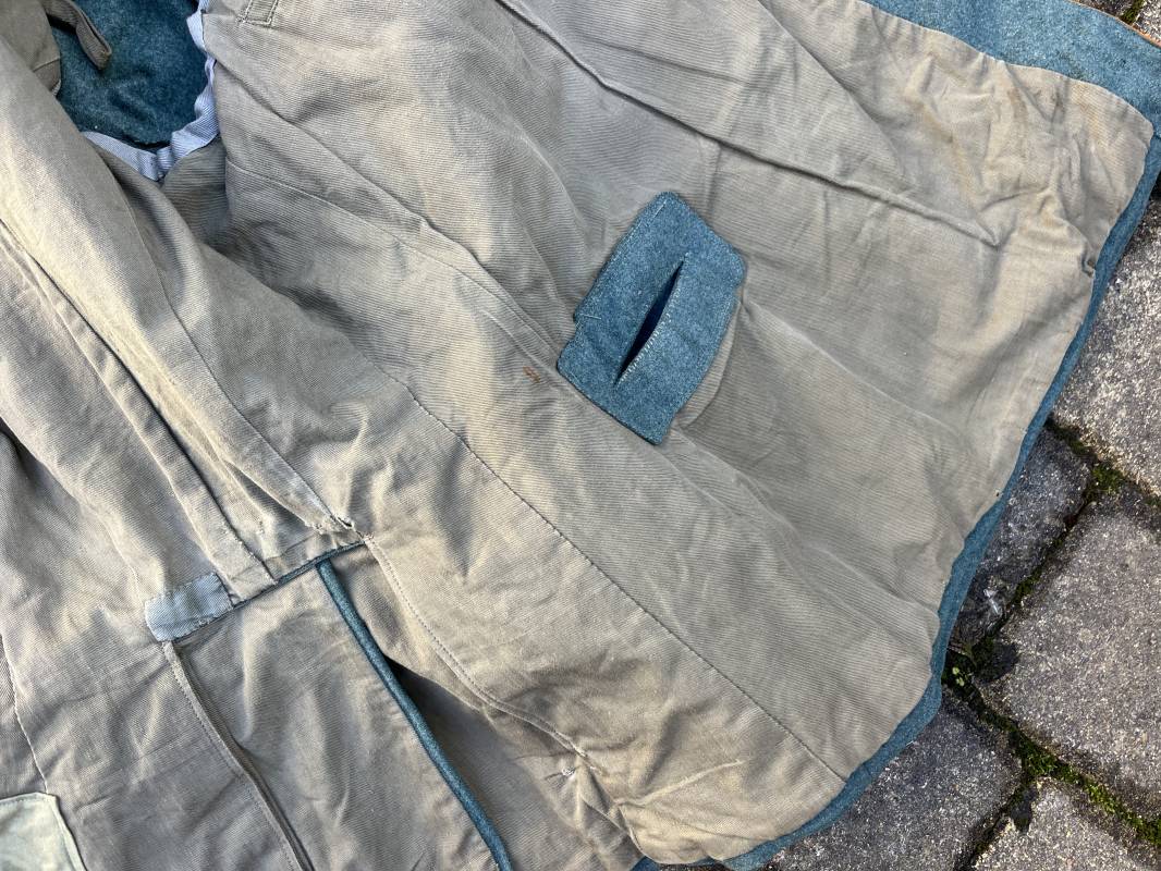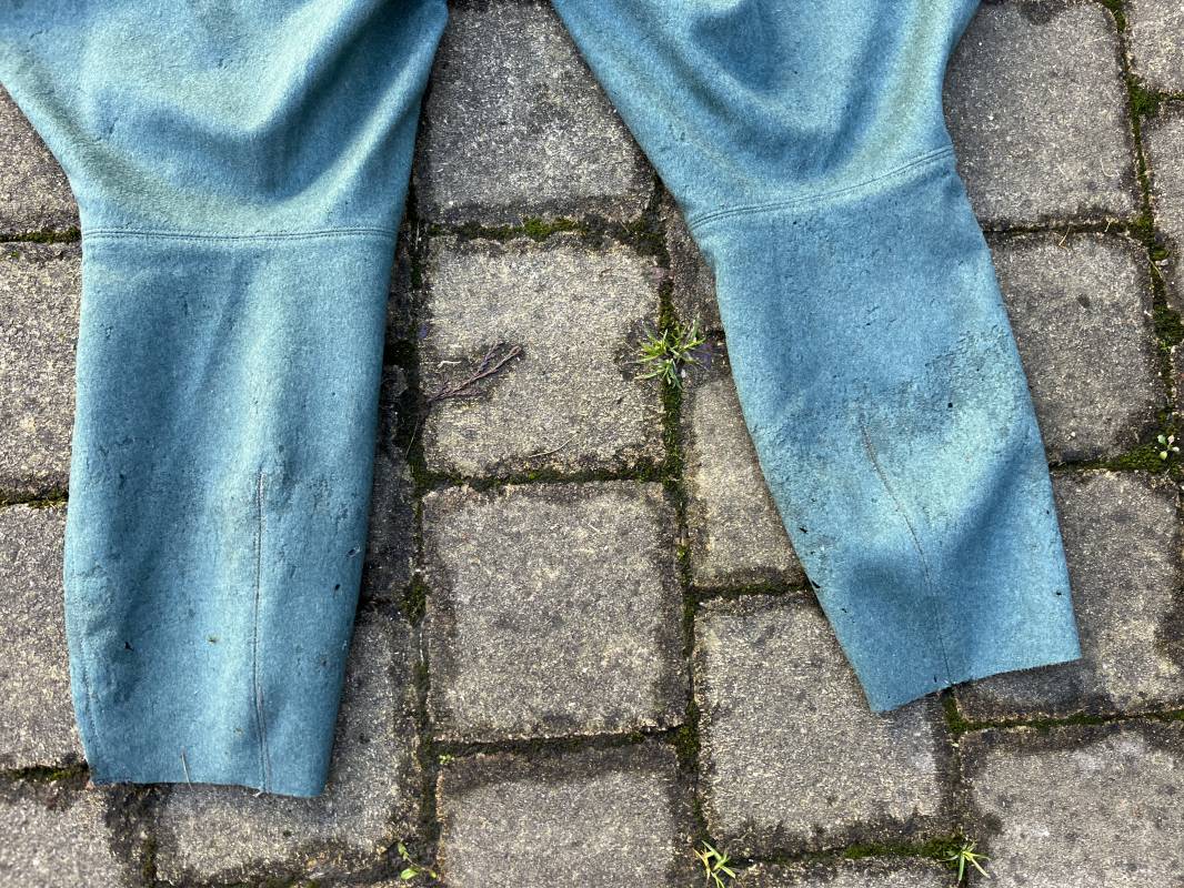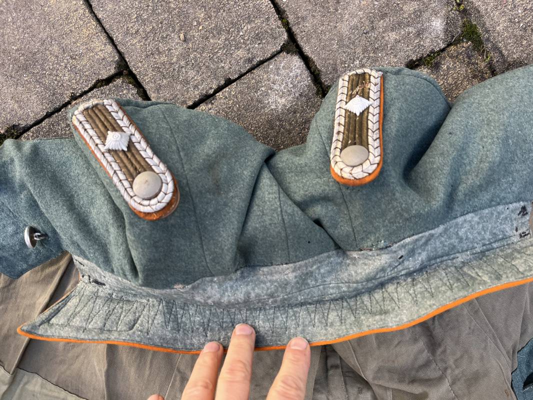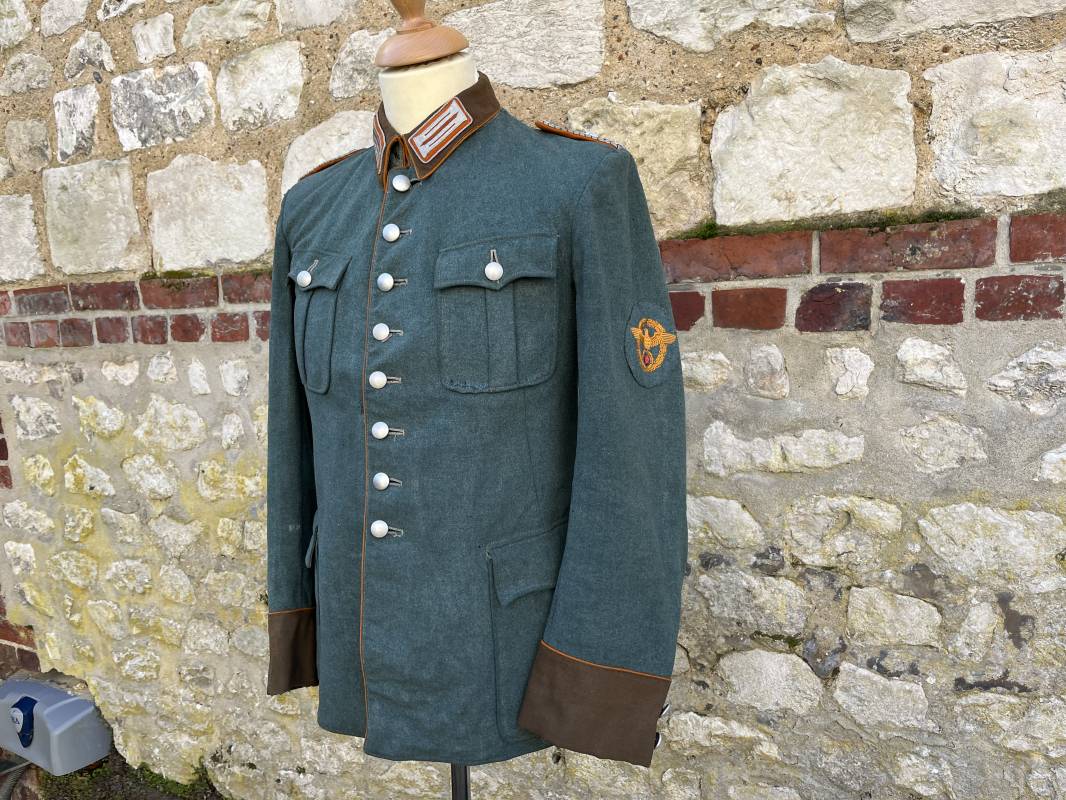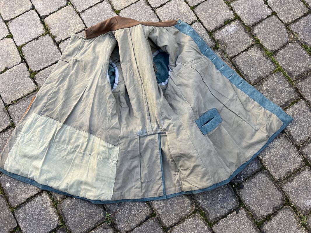 Bel ensemble veste et culotte d un gendarme . Cette veste et culotte ont été trouvés en succession familiale dans le sud de la France . Veste de service ( Dienstrock) d un sous officier gendarme en drap vert , quatre poches a rabts boutonnés , fermeture frontale à huit boutons , boutons grenelé argent cousus d origine . Col en drap marron , pattes de col ( litzen )avec socle orange de la gendarmerie . Montées machine d origine . Pattes d épaules du modele cousues aux enmanchures , liseré orange , grade de sous officier ( adjudant ) .Aigle de bras troupe brodé en coton orange cousu mains sur la manche gauche . Bas des manches a revers de drap marron liseré orange et deux boutons grenelé . Intérieur doublé en coton vert , une poche intérieure , passage pour le port du sabre deux poches fessières dans l interieur de la doublure . . Largeur épaules 43 cm , longueur 74 cm , manche 63 cm Culotte en drap vert , trois poches dont une fessière deux passants lateraux de serrge de taille , boutons en plastiqye vert cousus d origine , crochet métallique de braguette . Bas des jambes a glissières d origines et fonctionnelles , marquage fabricant Zipp . Doublure intérieure en coton blanc a motifs , et oches en coton gris vert . Taille 40 Longueur 95 cm . Bel ensemble homogéne ayant appatenu au meme homme . Ensemble porté et dans son jus . Petites usures et trous de mites Trés belle patine générale . Drap frais . 100 % natrure et totalement intouché Bel ensemble Jus et terrain . 1935/45 Ref 21819
