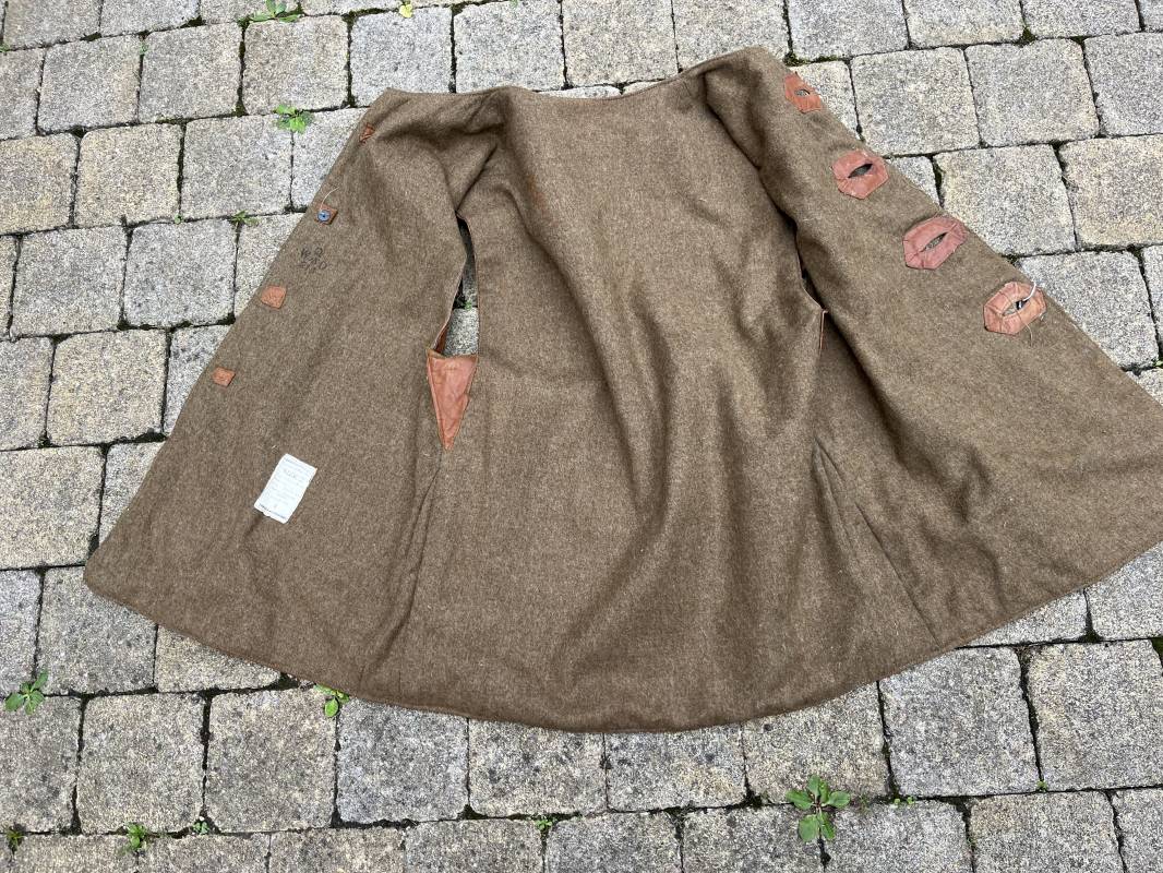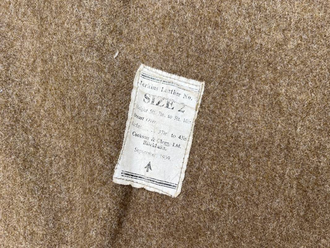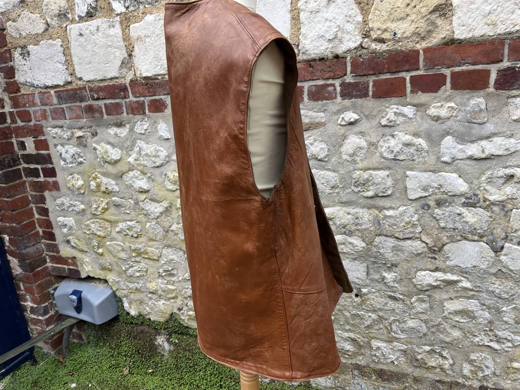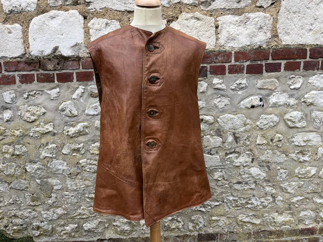 Beau gilet de protection en cuir. 'Leather Jerkin'. Fermeture à quatre boutons plastique marron. Intèrieur doublé en drap kaki. Etiquette fabricant Cookson Ltd Septembre 1939 Size n 2 , cuir souple. Largeur épaules 50 cm , longueur 80 cm Légèrement porté en trés bel état . Ref 22049