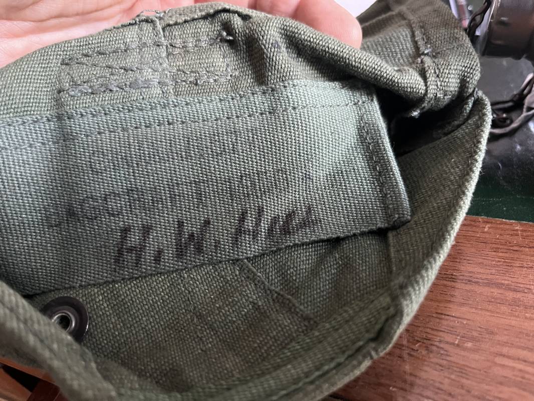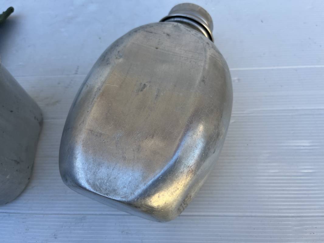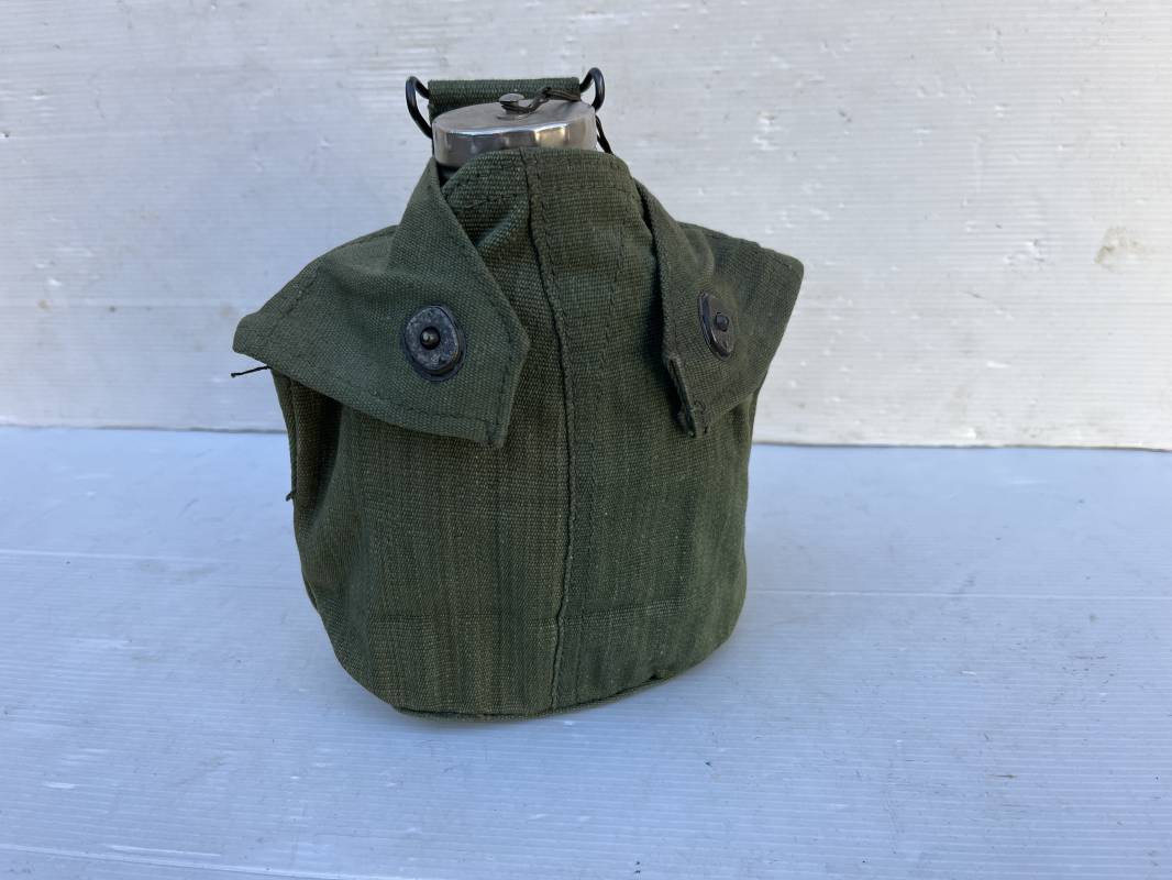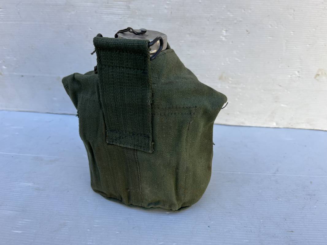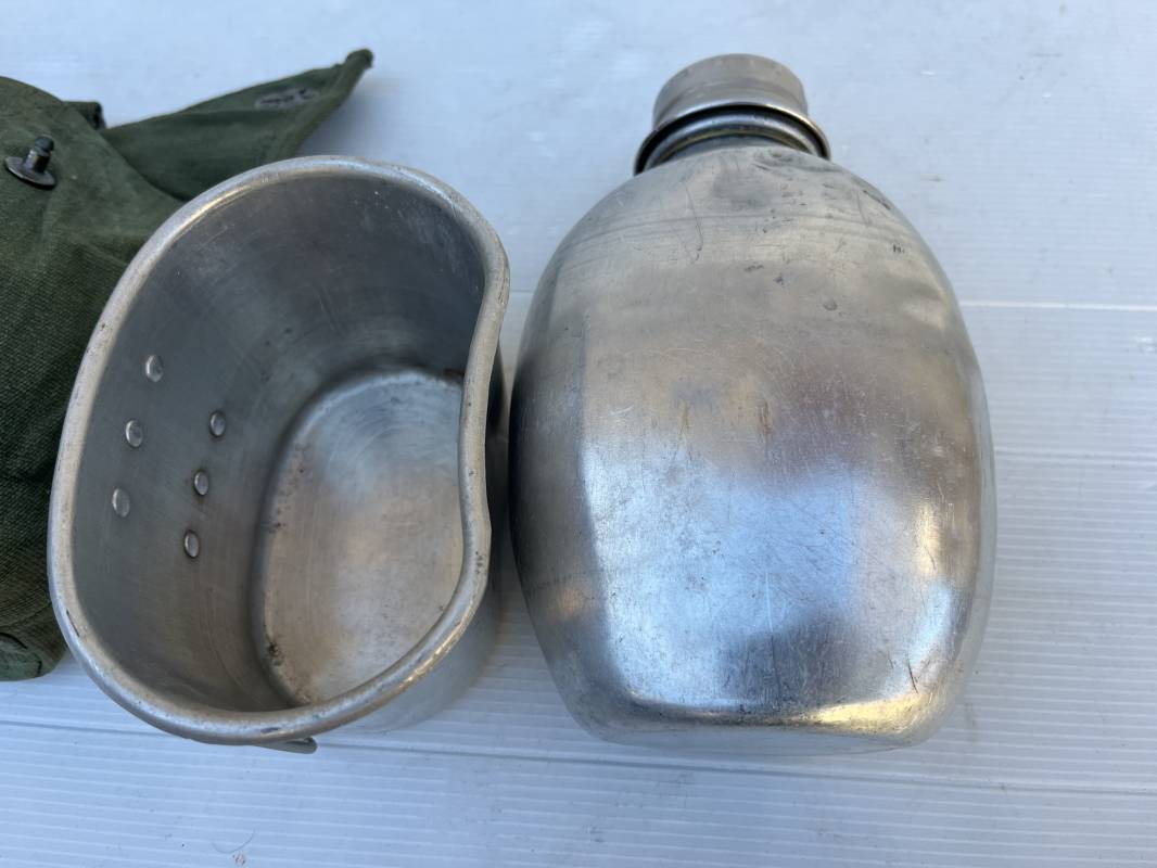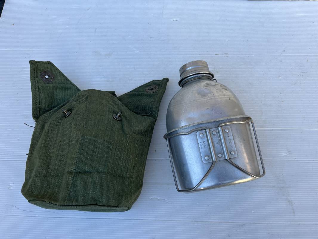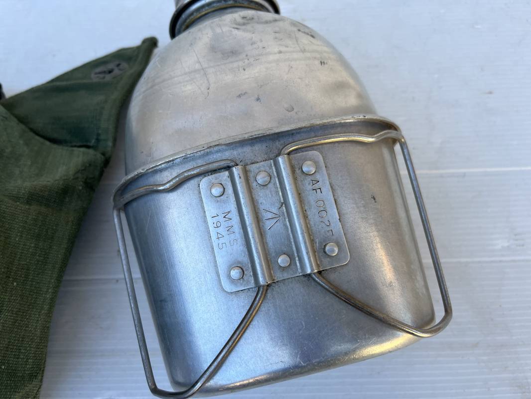 Gourde pattern 44 de l armée anglaise utilisée en Extréme Orient par l armee francaise . Bidon alu avec bouchon et chainette Quart individuel daté 1945 ;Housse en forte toile verte Marquage fabricant bAGCRAFT 1950 . Passant de ceinturon et crochet fer . Rabats de fermeture et pression . Porté en trés bel état . Ce modele de gourde anglaise P44 est largement porté par le CEFEO en 1945/50 Ref 20066