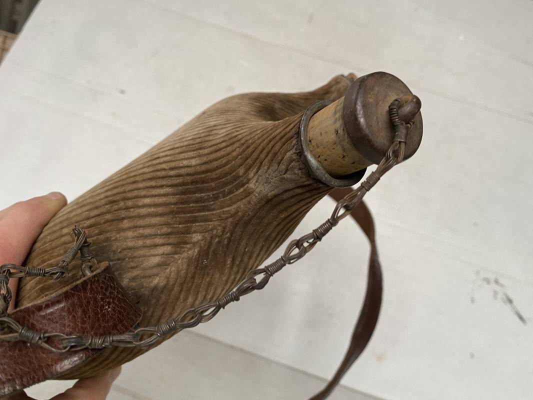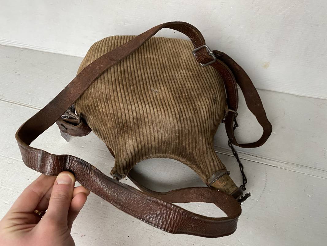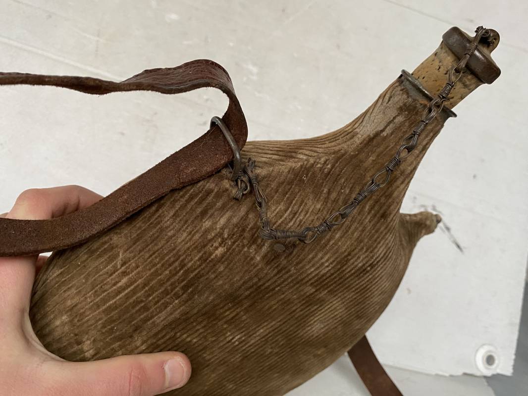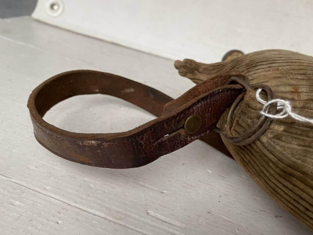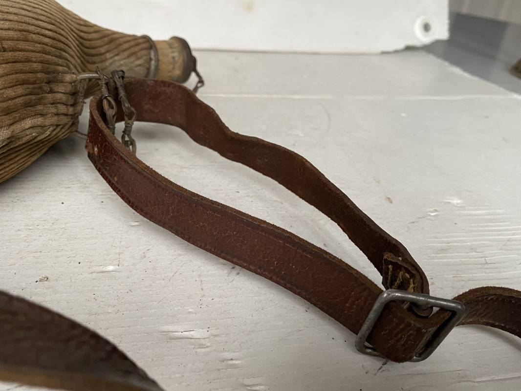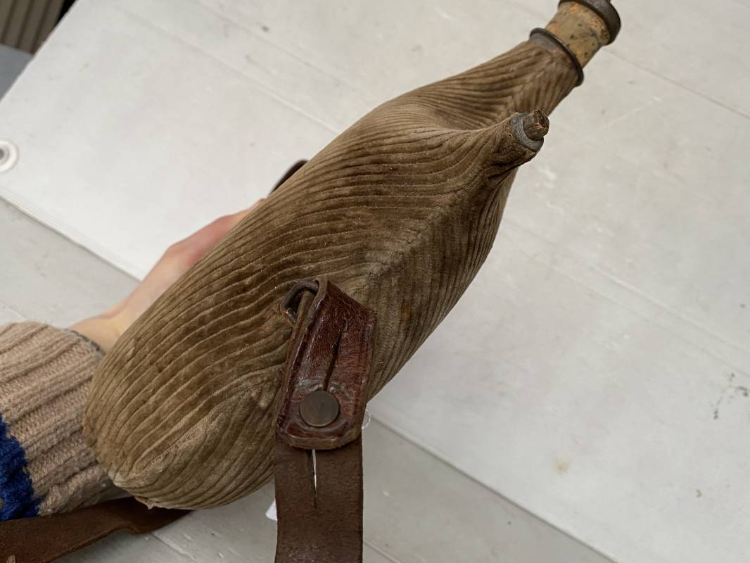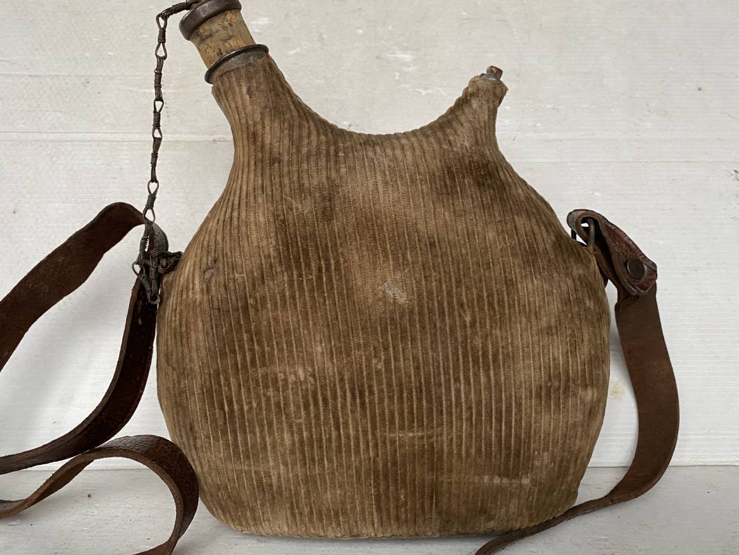 Belle gourde individuelle modèle 1877/15 . Bidon de 2 litres en fer. Housse en velours marron de type ersatz . Housse typique de l'année 1915. Bouchon d'origine avec chainette. Anneau métallique pour fixation du quart individuel. Bouchon bois. Sangle en cuir marron . Rivet laiton. Boucle métallique. Gourde en bel état 1915/16. Ref 15418