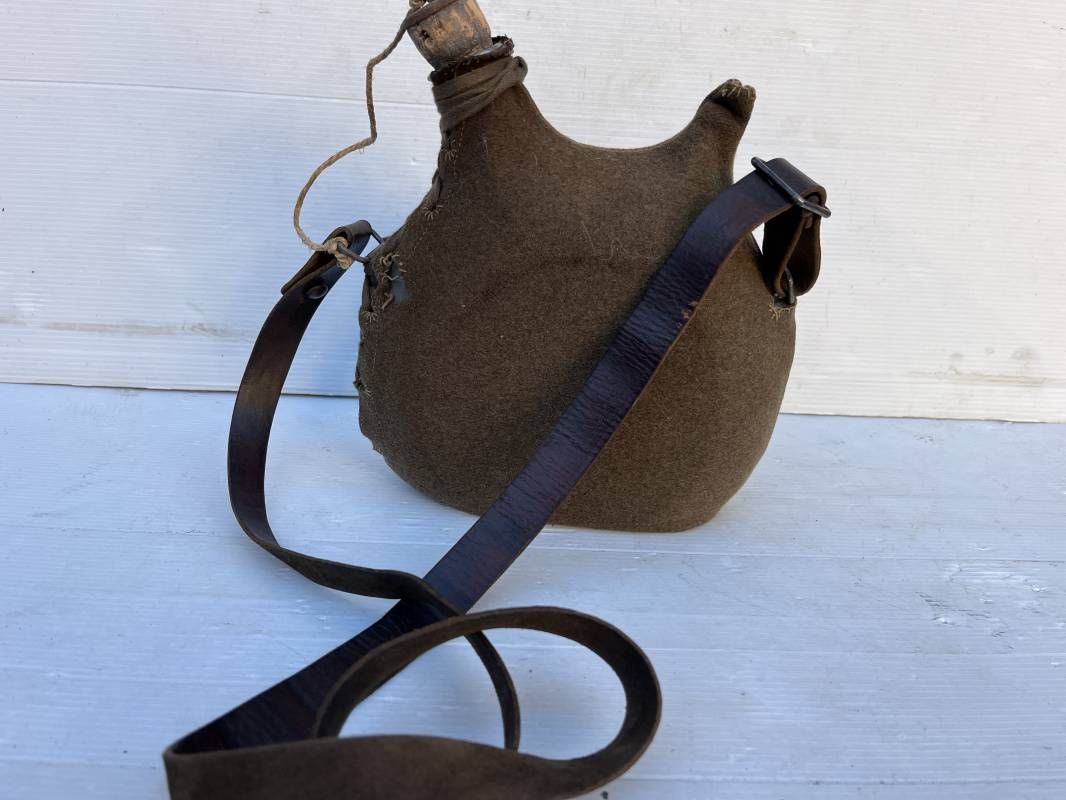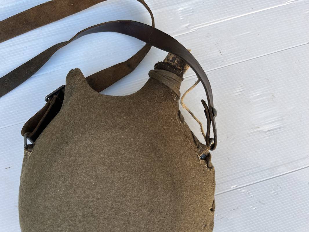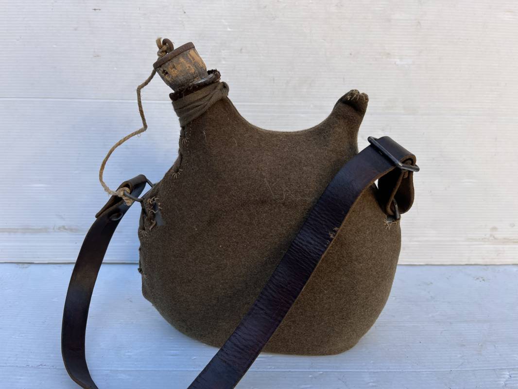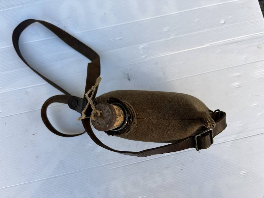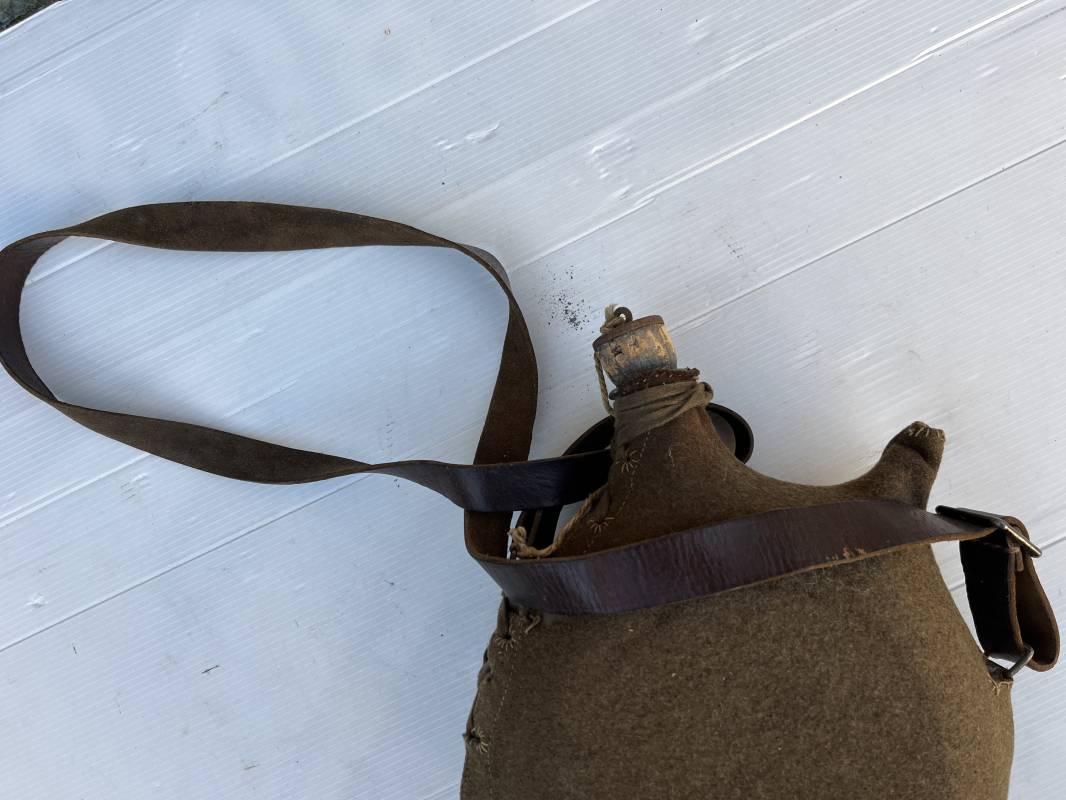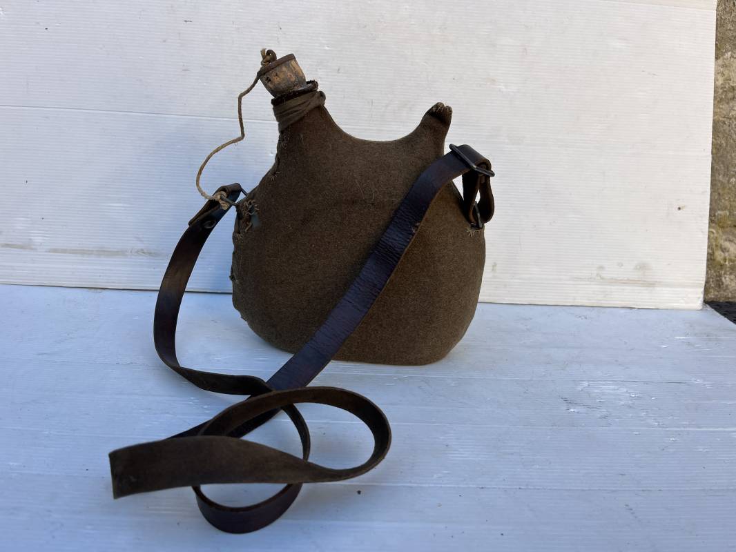 Belle gourde individuelle modèle 1877/35 . Bidon de deux litres à deux goulots avec bouchon et cordellette d'origines. Housse en drap kaki d'origine avec oeillets surfilés coton , lacet coton kaki .Nominette en coton blanc au cul du bidon . Longue sangle en cuir marron avec boucle et rivet méatllique . Cuir souple . Légèrement utilisé en parfait état 1935/40 Ref 21632