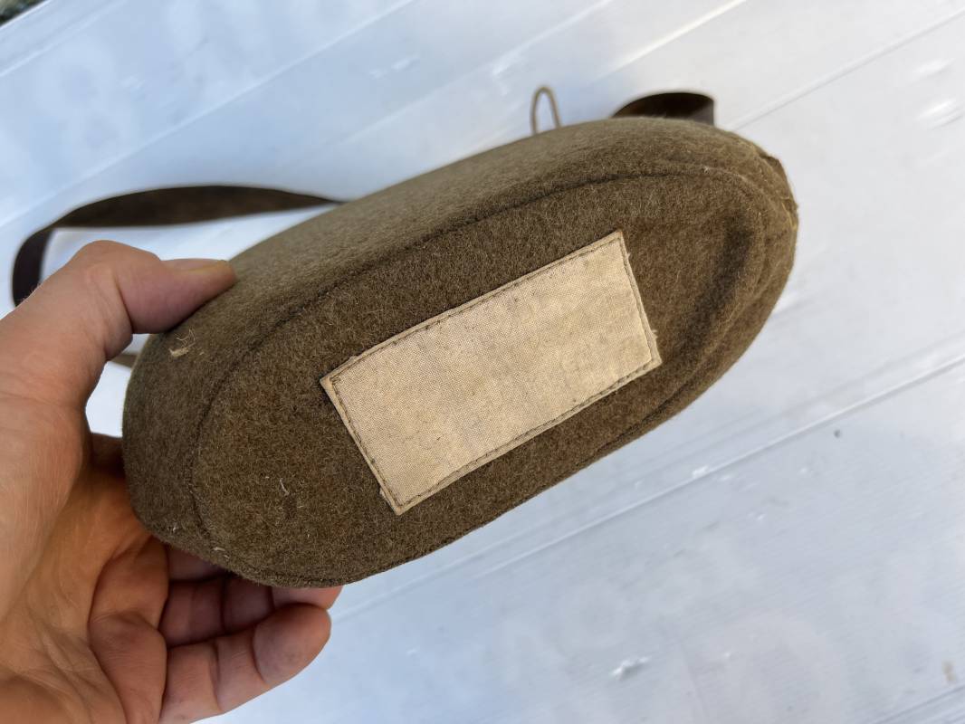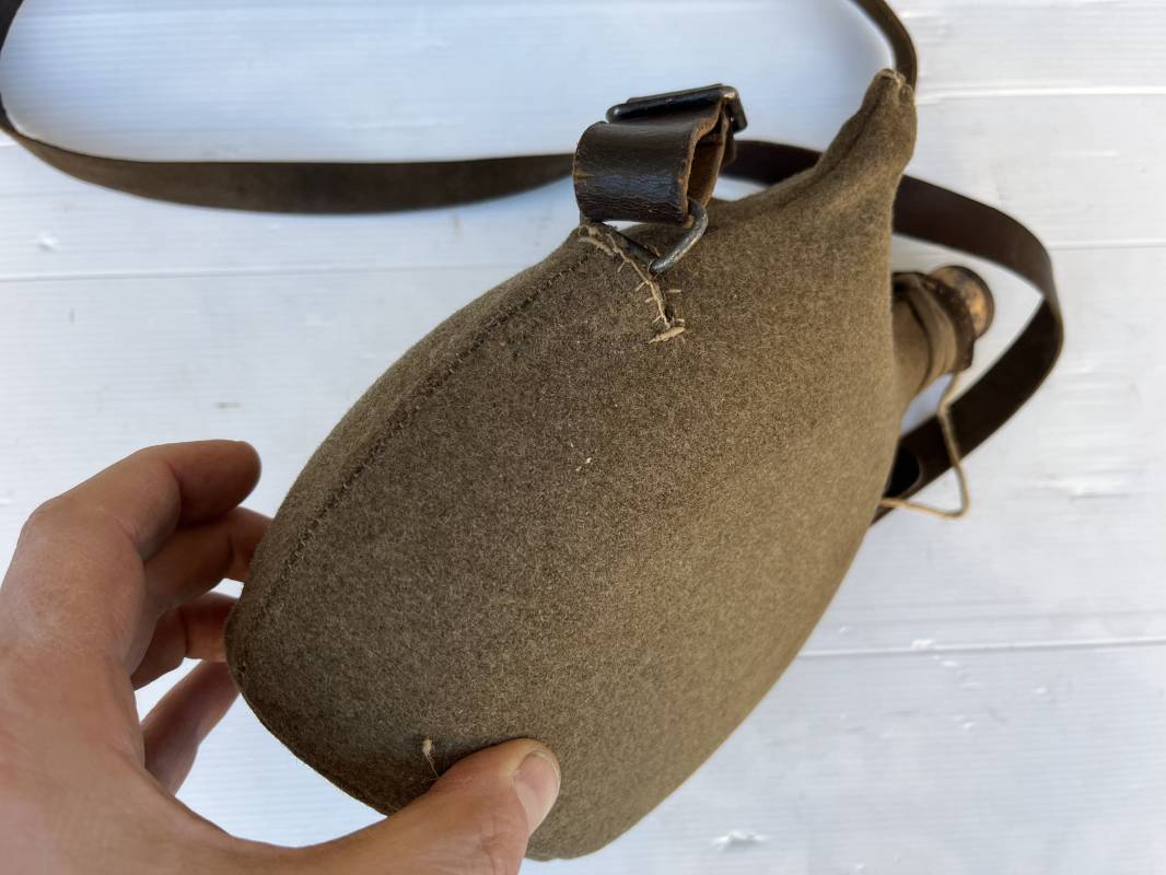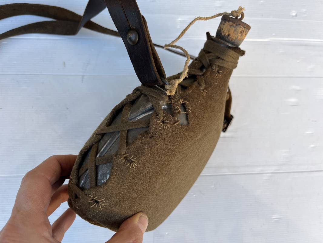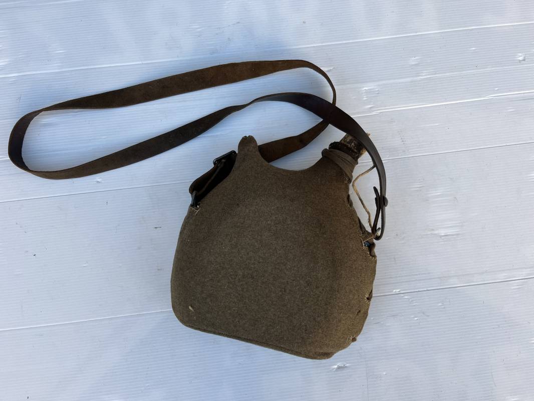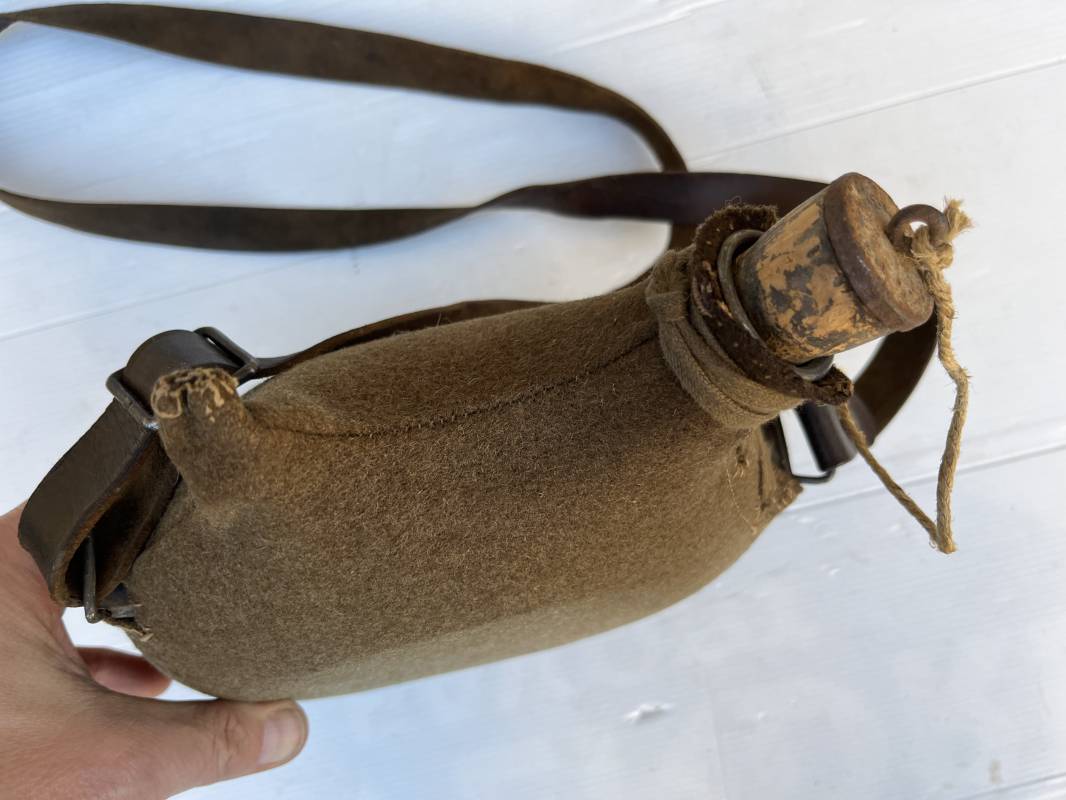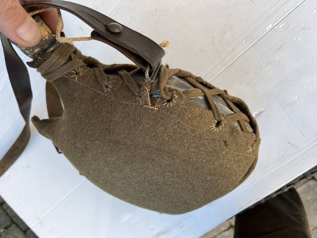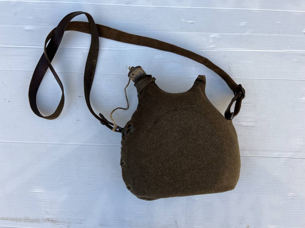 Belle gourde individuelle modèle 1877/35 . Bidon de deux litres à deux goulots avec bouchon et cordellette d'origines. Housse en drap kaki d'origine avec oeillets surfilés coton , lacet coton kaki .Nominette en coton blanc au cul du bidon . Longue sangle en cuir marron avec boucle et rivet méatllique . Cuir souple . Légèrement utilisé en parfait état 1935/40 Ref 21632