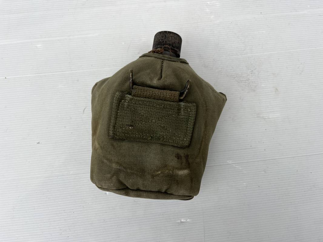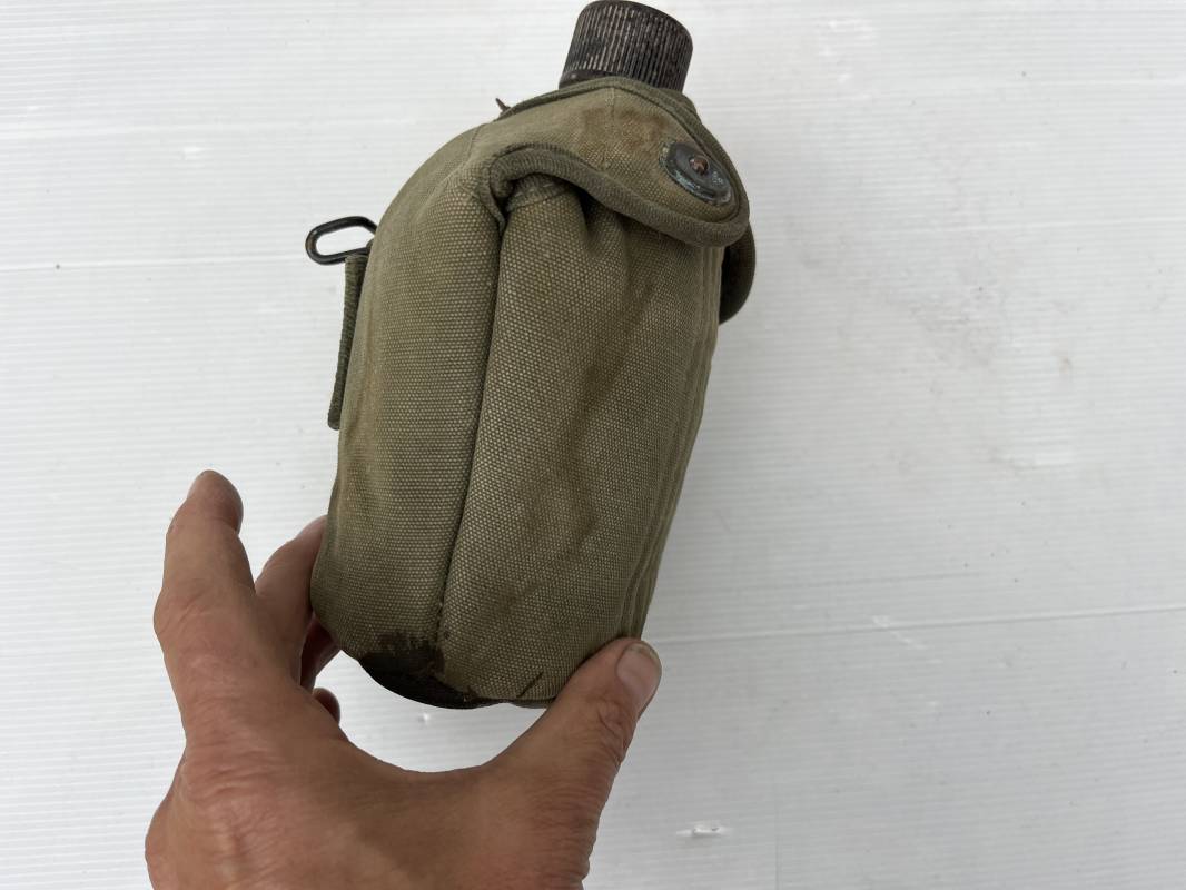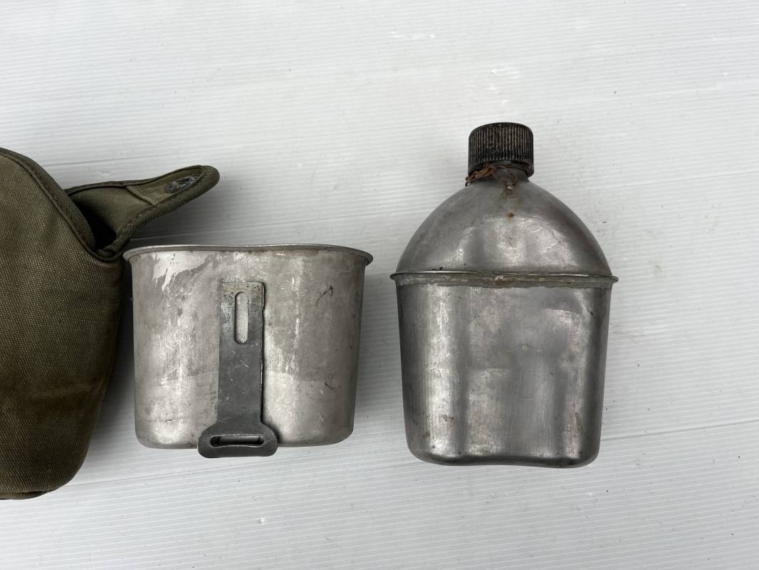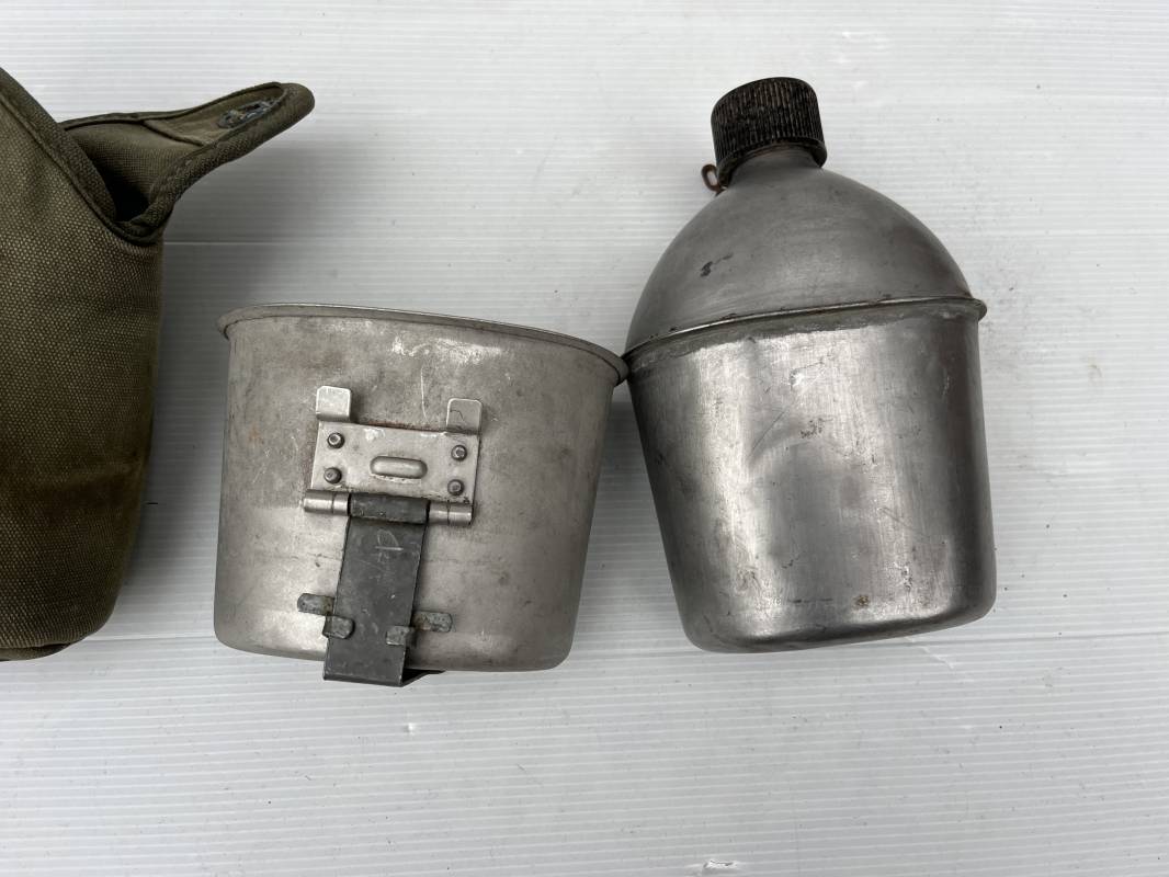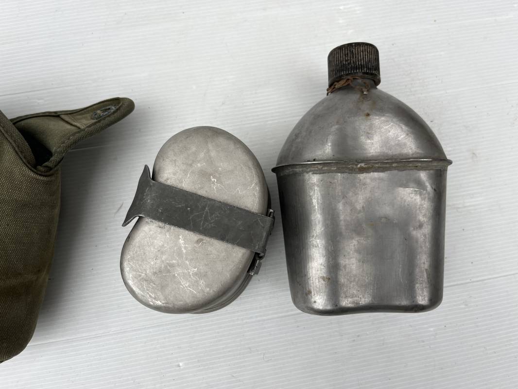 Gourde individuelle modèle 1910 avec bidon et quart. Housse en toile vert foncé . Housse doublée en déchets de laine.Marquage US , fabricant illisible Boutons pressions. Bidon modèle 1910 en alu. Bouchon plastique et chainette marquage fabricant US GP FCo 1945 . Quart individuel . Légèrement utilisé en bel état 1944/45. Ref 19612