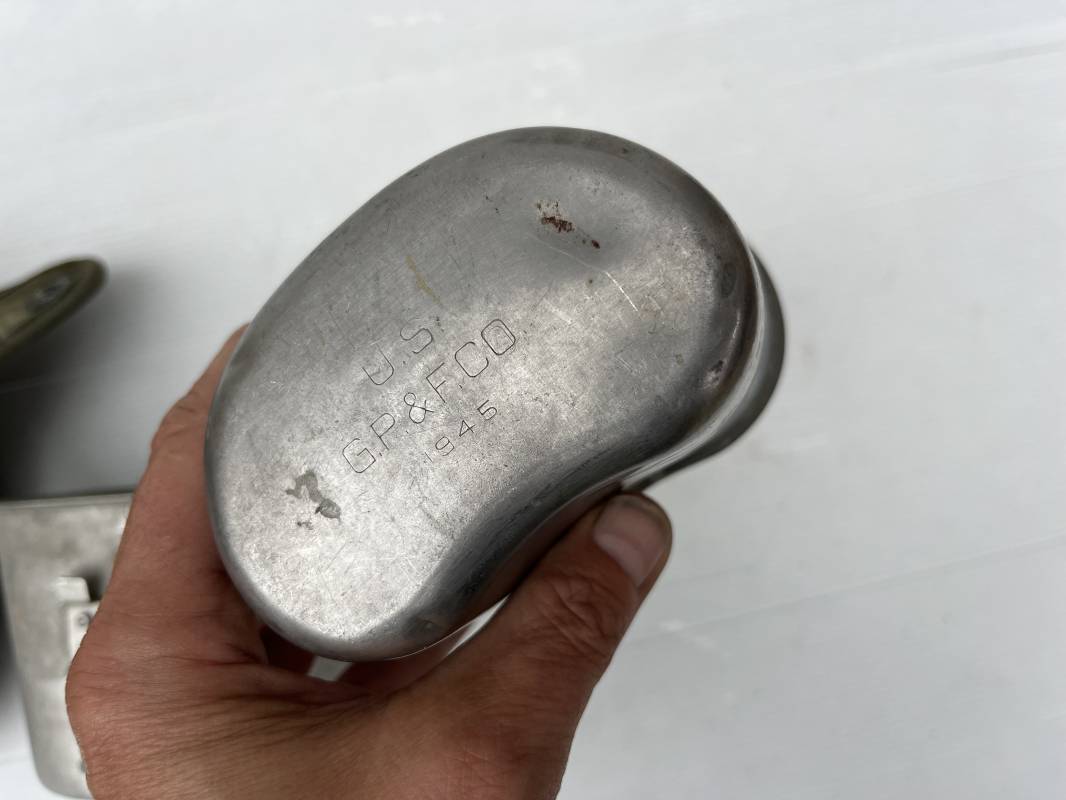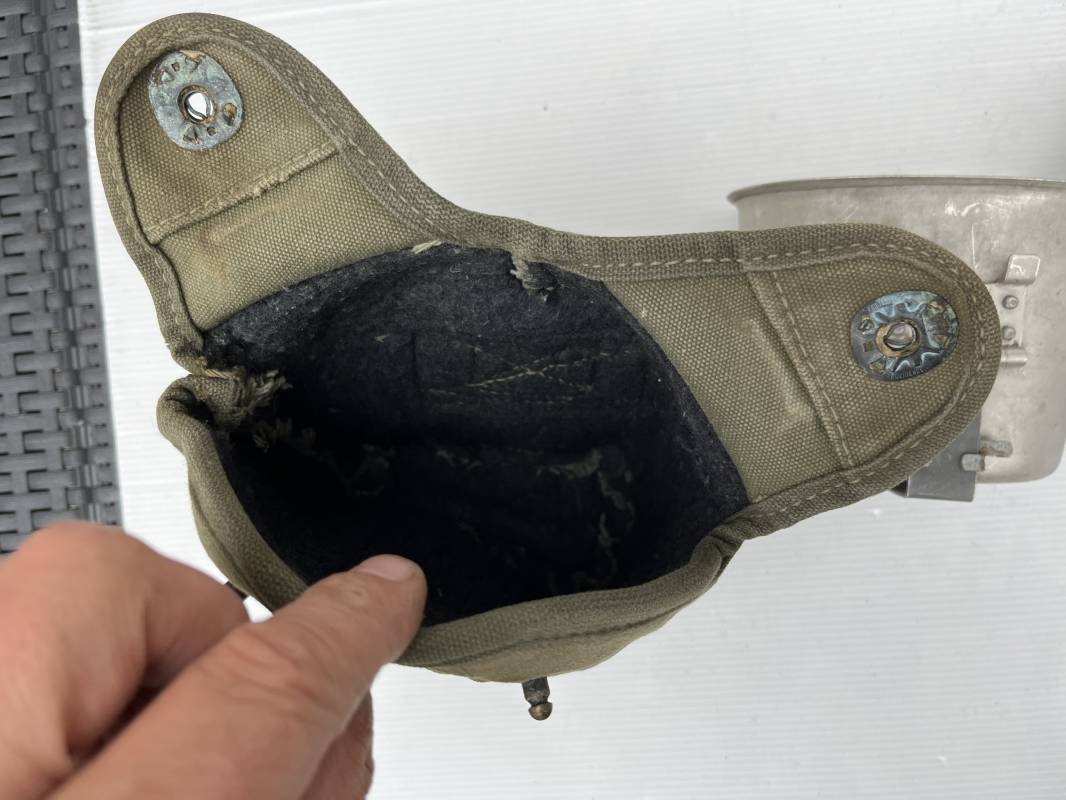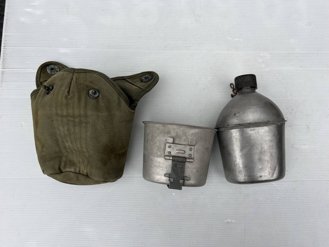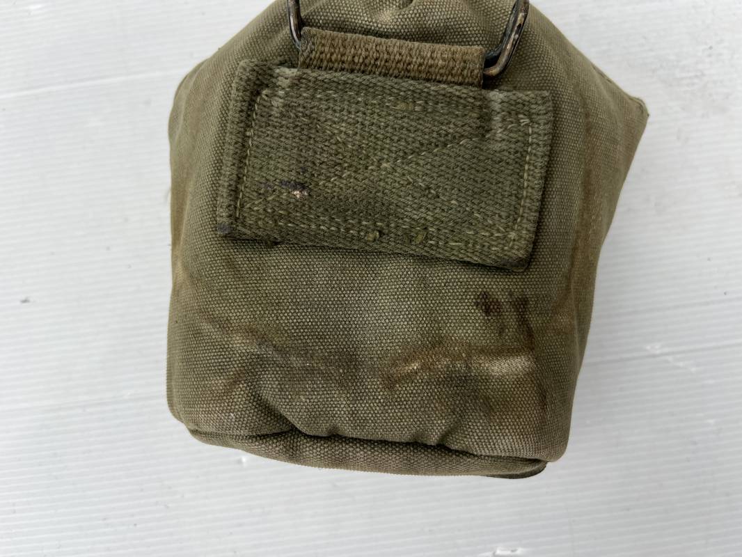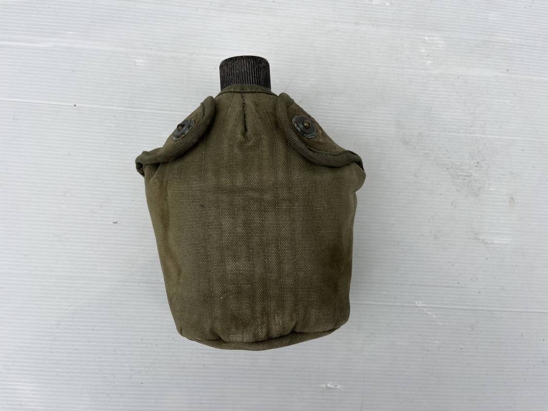 Gourde individuelle modèle 1910 avec bidon et quart. Housse en toile vert foncé . Housse doublée en déchets de laine.Marquage US , fabricant illisible Boutons pressions. Bidon modèle 1910 en alu. Bouchon plastique et chainette marquage fabricant US GP FCo 1945 . Quart individuel . Légèrement utilisé en bel état 1944/45. Ref 19612