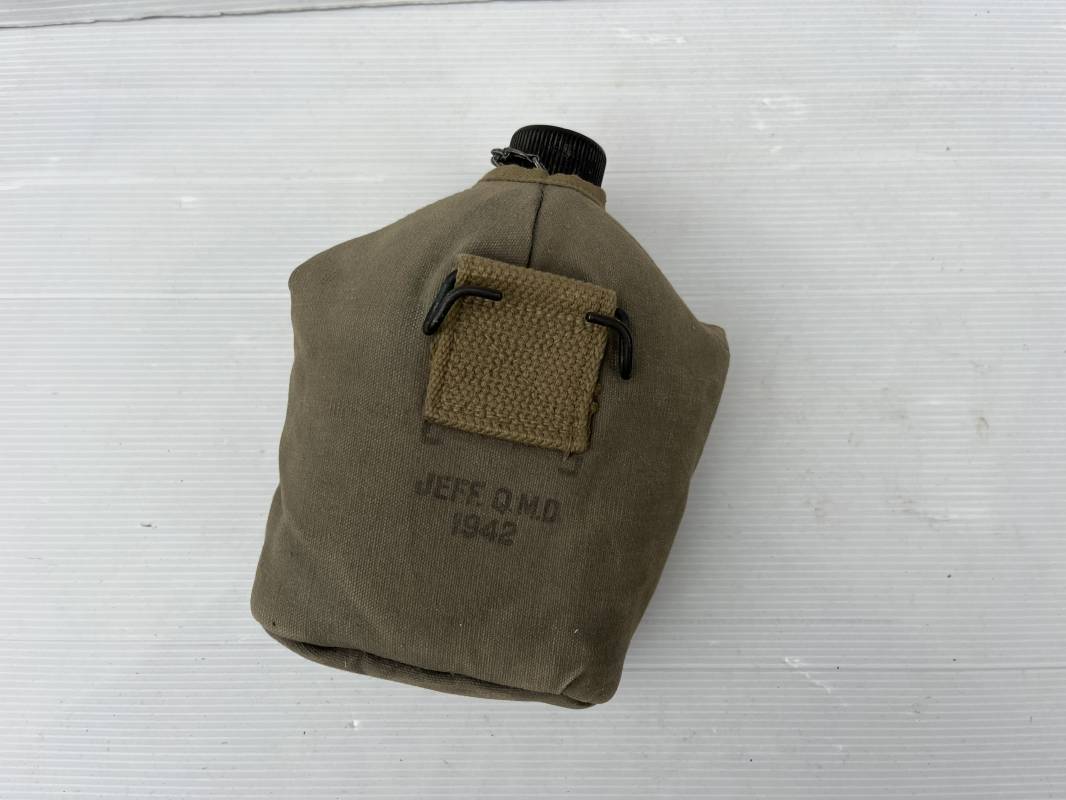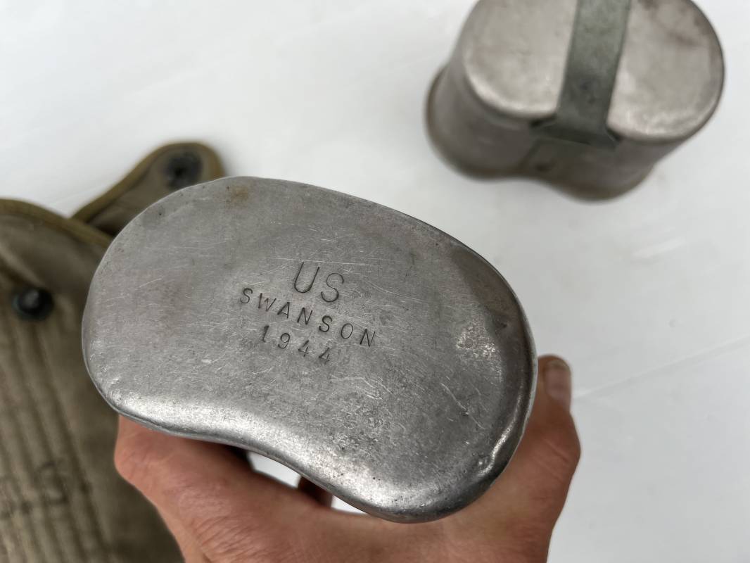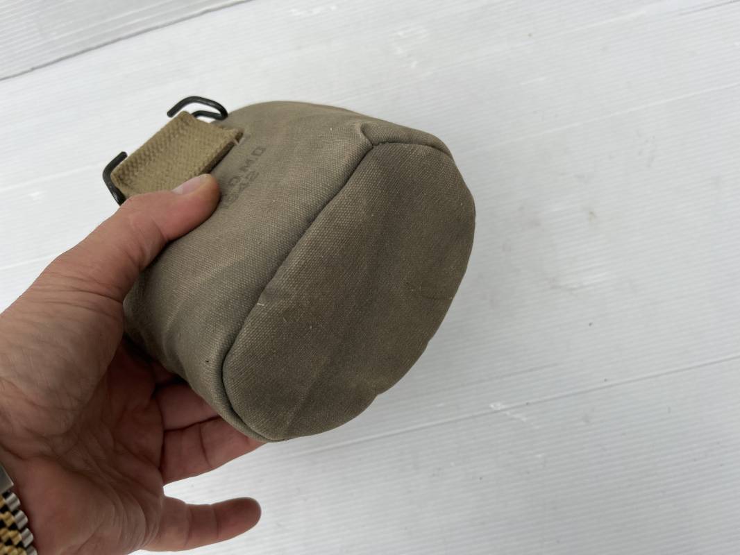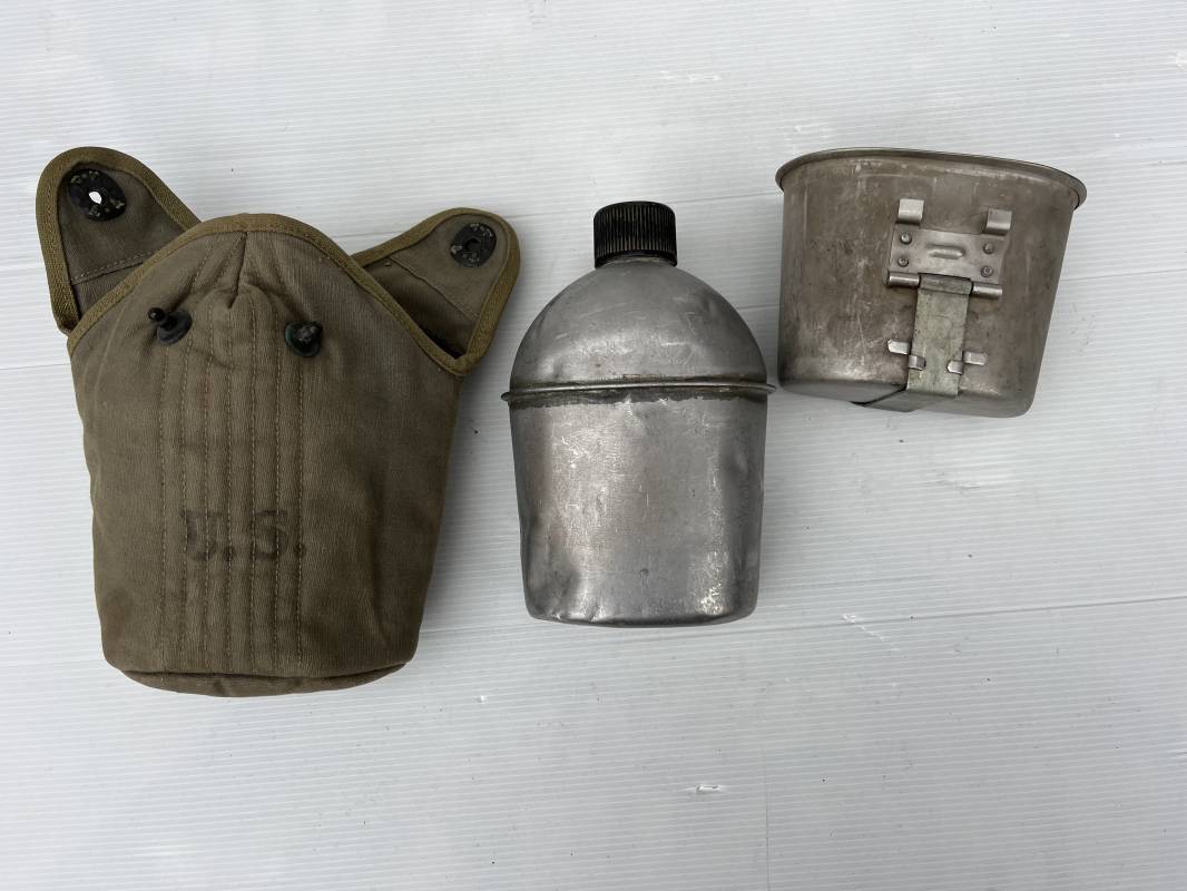 Gourde individuelle modèle 1910 avec bidon et quart. Housse en toile olive drab. Housse doublée en déchets de laine.Marquage us ET FABRICANT Jeff QMD 1942 Boutons pressions. Bidon modèle 1910 en alu. Bouchon plastique et chainette marquage fabricant US Swanson 1944 . Quart individuel et bidon marquage fabricant us beco daté 1944. Légèrement utilisé en parfait état 1942/44. Ref 20008