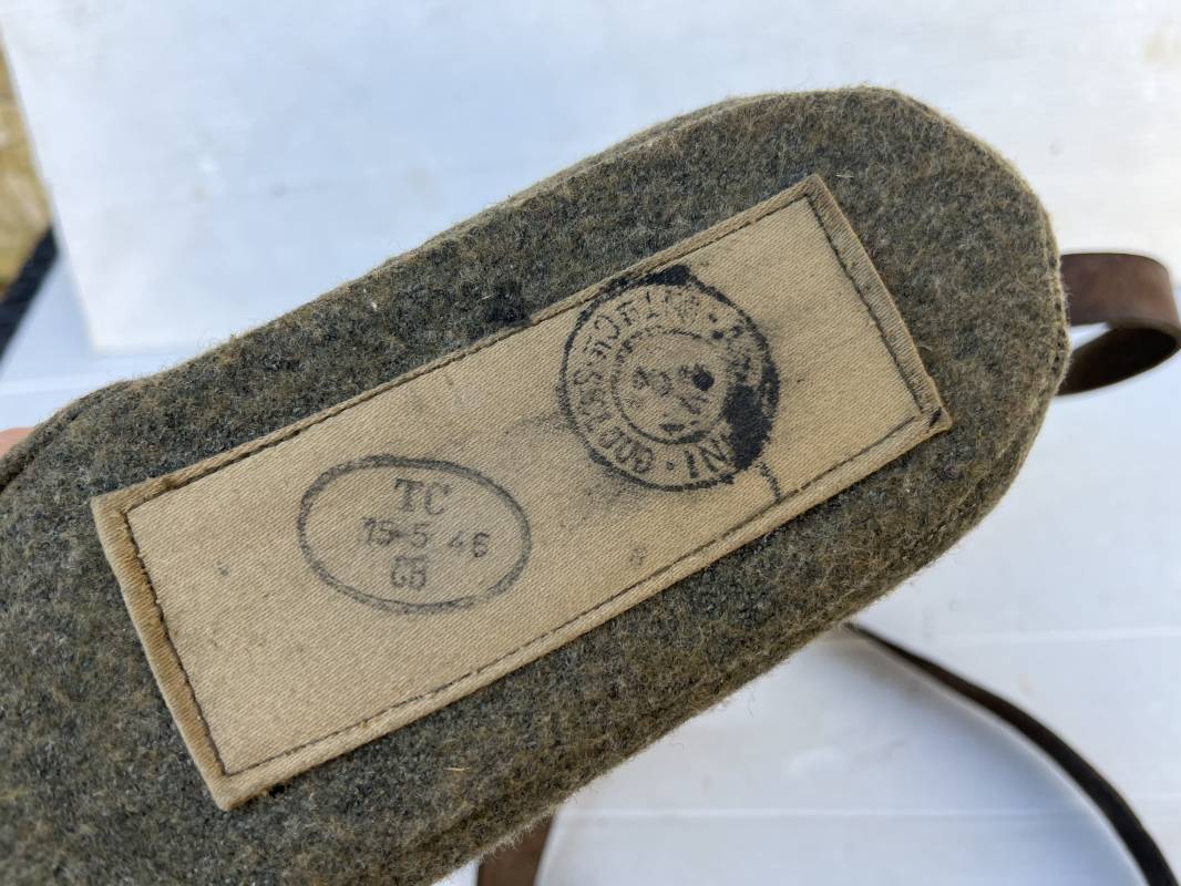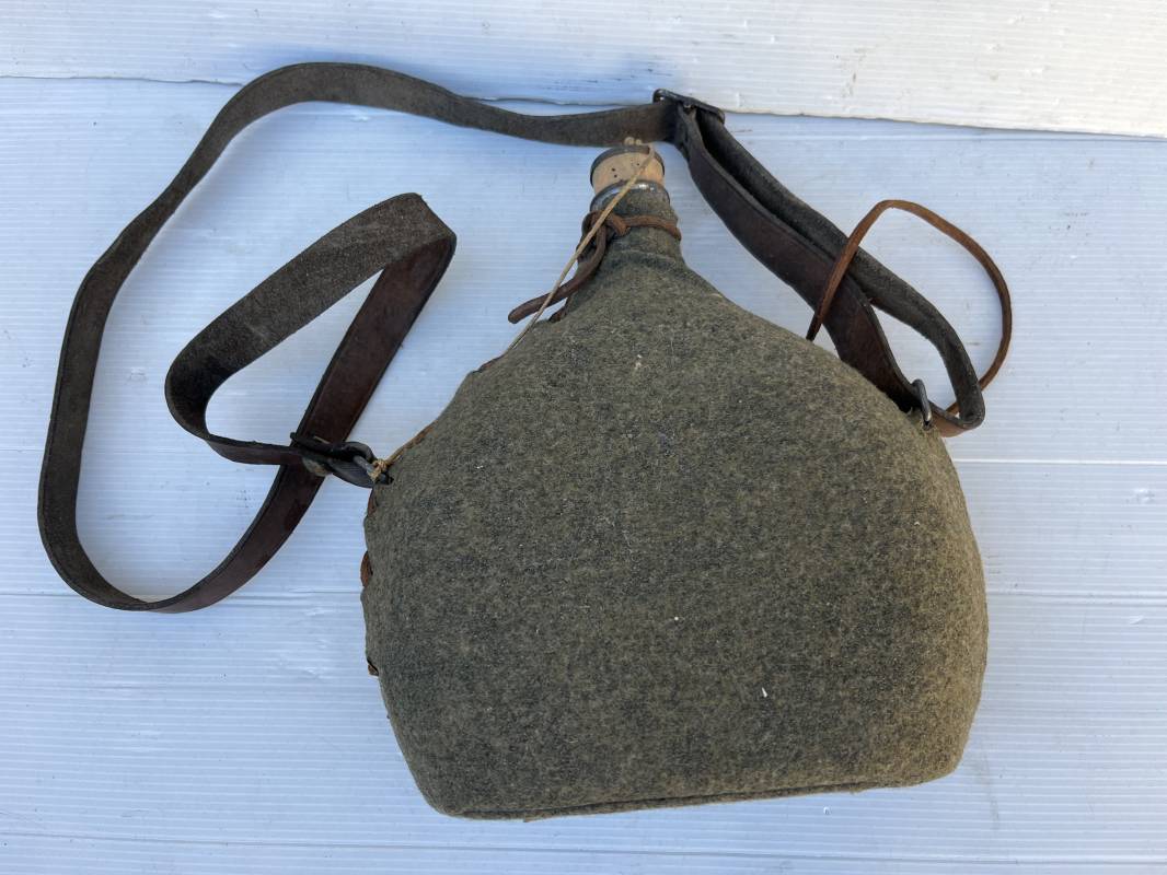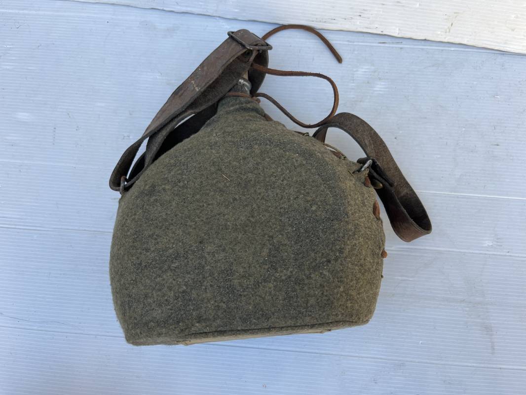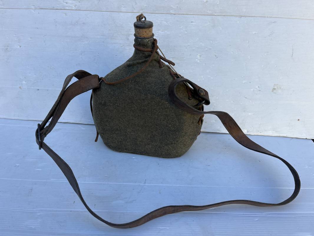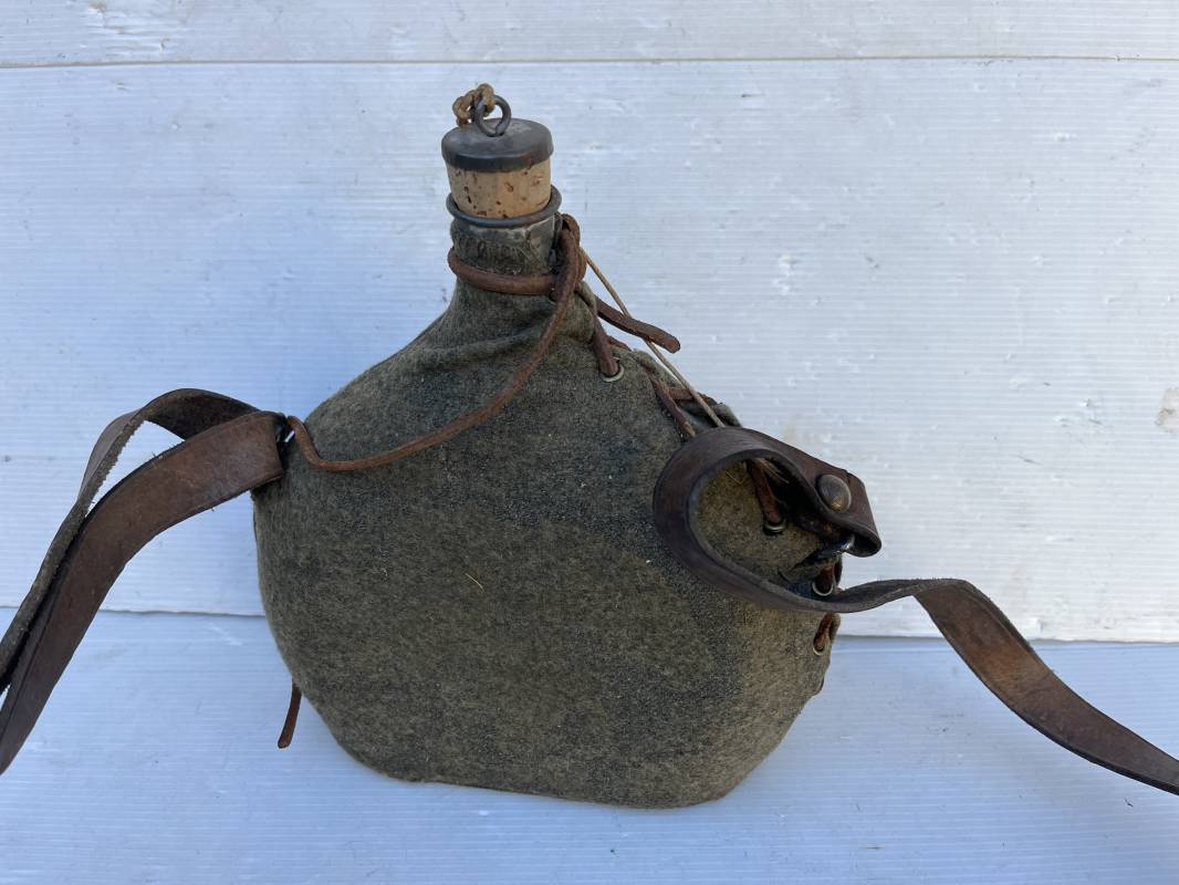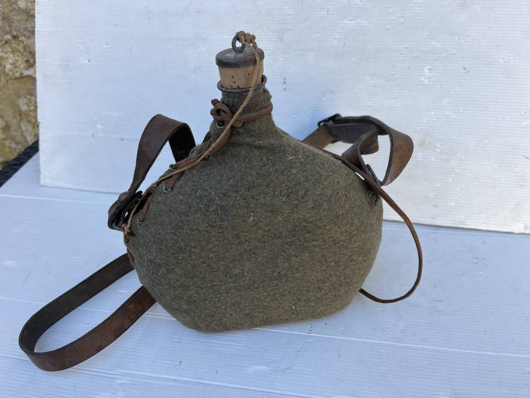 Belle gourde individuelle modèle 1935 avec sangle cuir . Gourde marquée des TC et datée 1945 . Bidon de deux litres avec bouchon et cordellette d'origine. Housse en drap kaki d'origine avec oeillets en laiton doré , lacet cuir .Nominette en coton kaki au cul du bidon marqué TC ( troupe coloniale ) daté 1945 Tampon rond du fabricant a St Cloud . Longue sangle en cuir marron avec boucle et rivet méatllique . Cuir souple . Légèrement portée . Dernière fabrication de la celebre gourde modele 1935 de l Armée francaise . Bel état Ref 21772