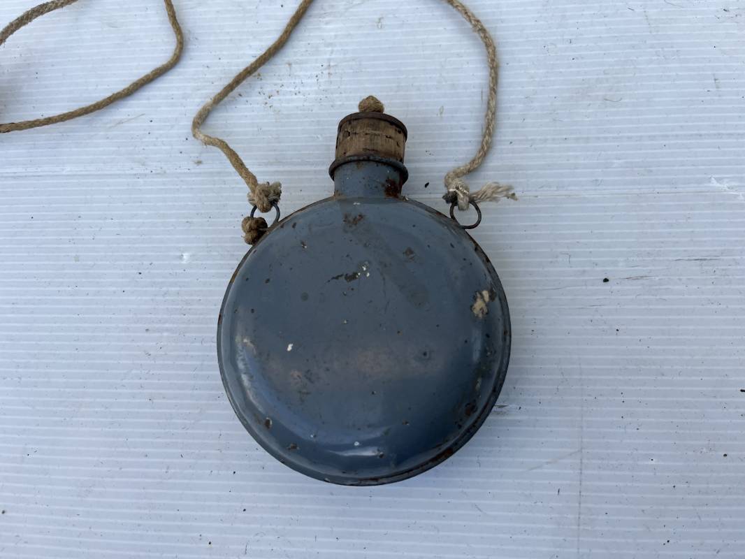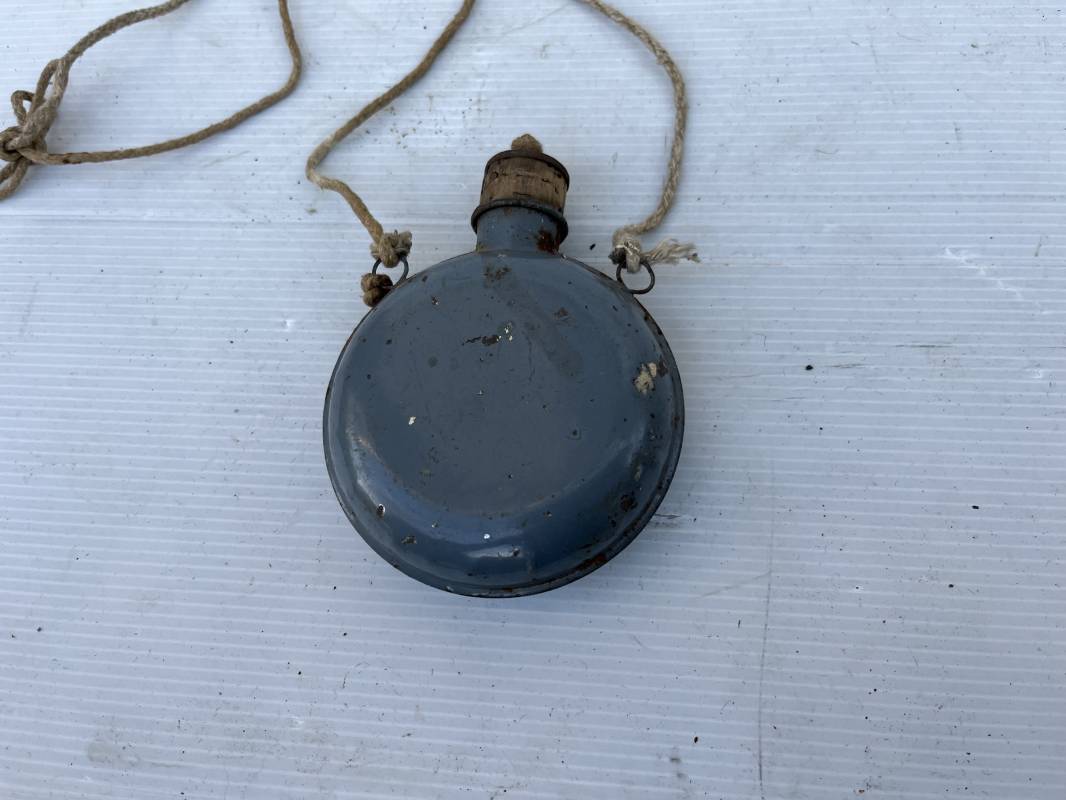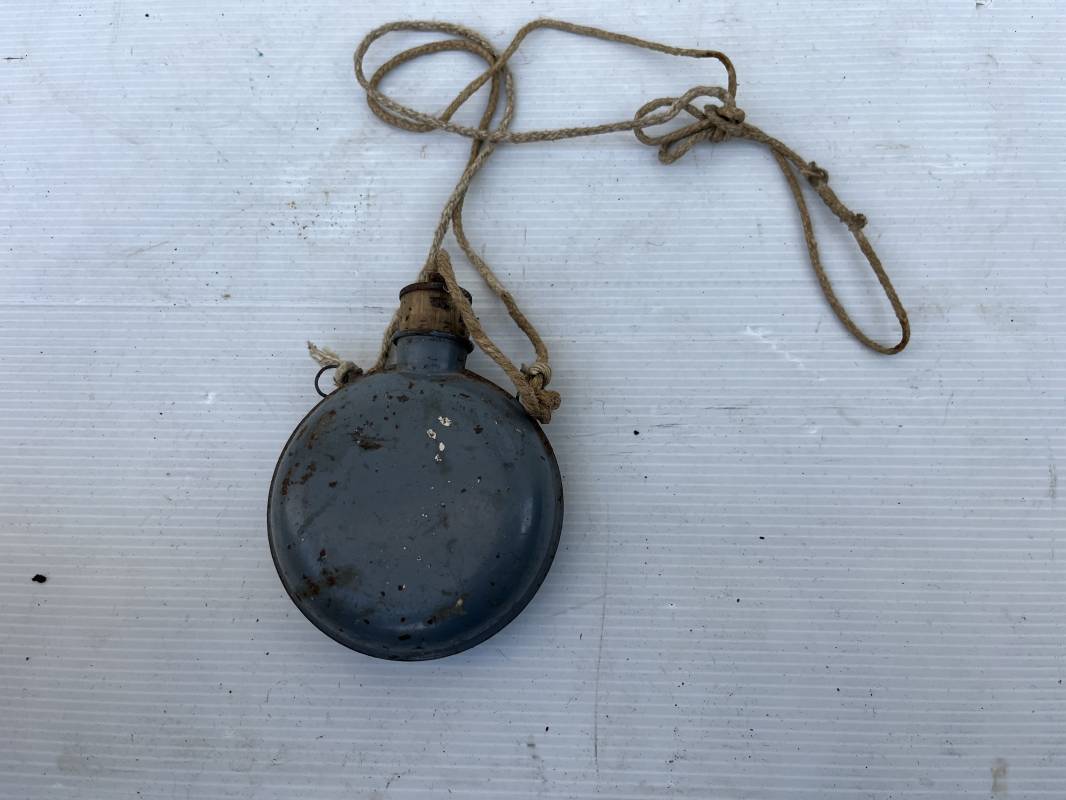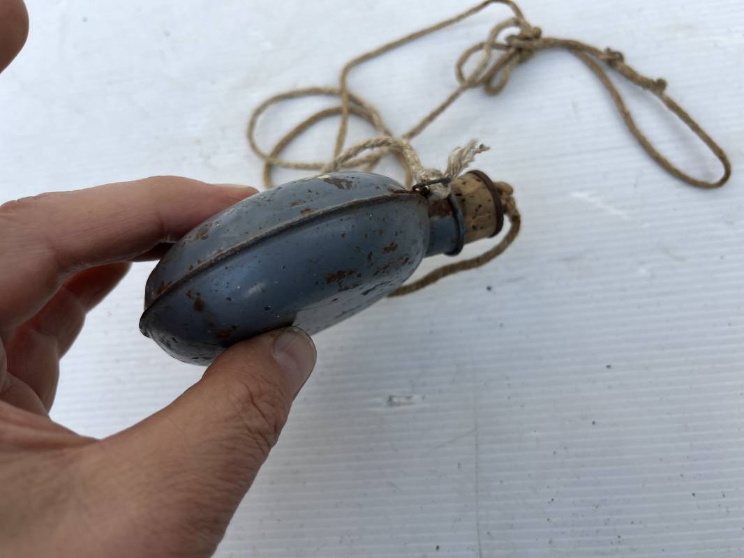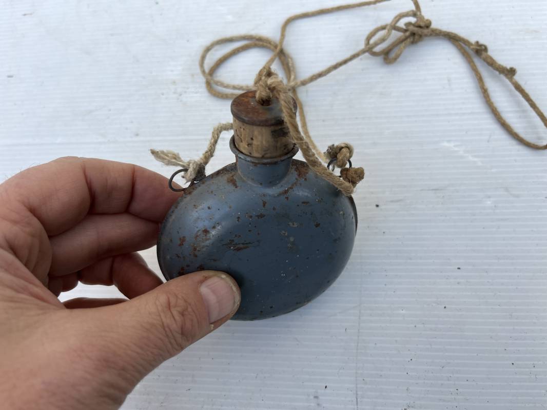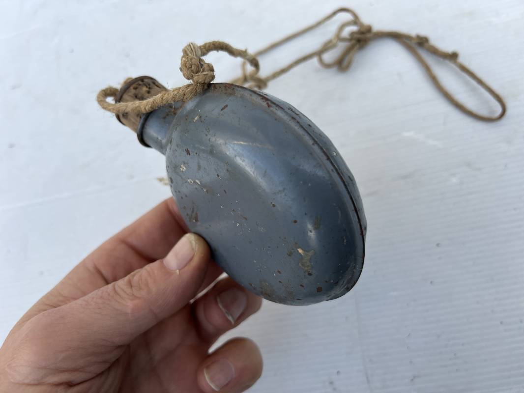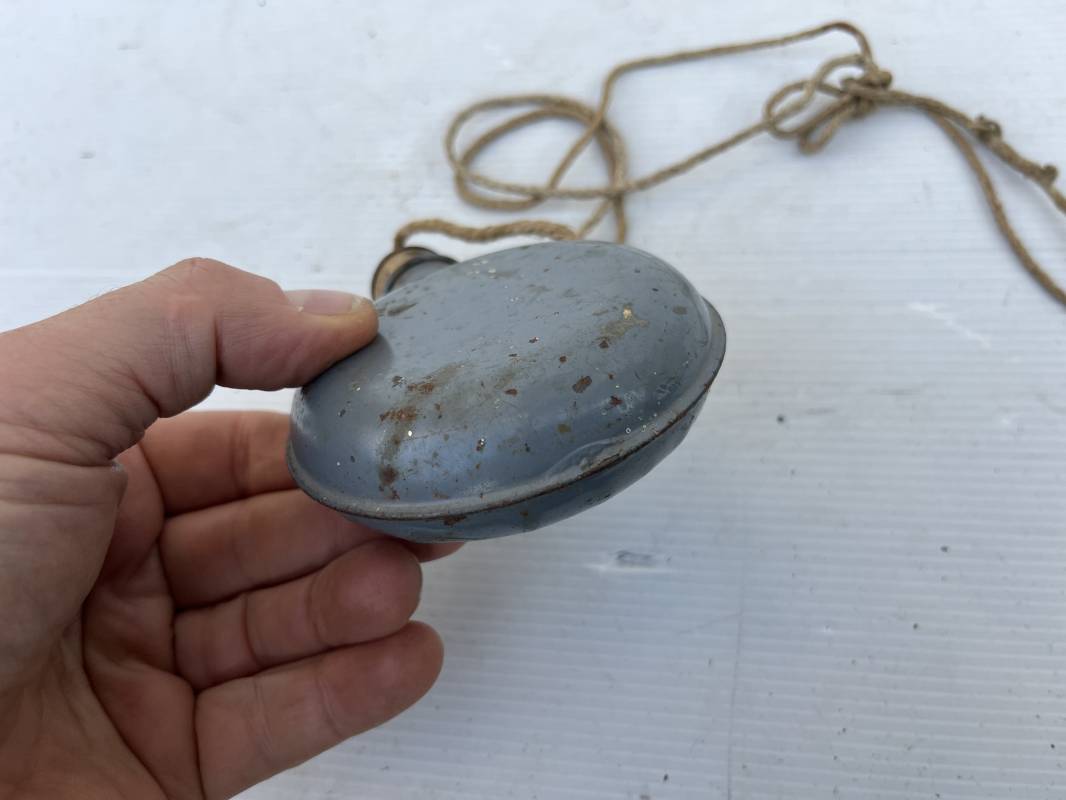 Petite gourde individuelle à alcool ( eau de vie , calvados , cognac .. ) Gourde non réglementaire vendue en foyer . Contenance 15 cl . Bidon metallique peint en gris bleu , diamétre 90 mm . Bouchon et cordelette d origines . Deux anneaux métallique et cordon pour le port en sautoir. 100 % dans son jus et totlement intouché . 1915/18 Ref 2414