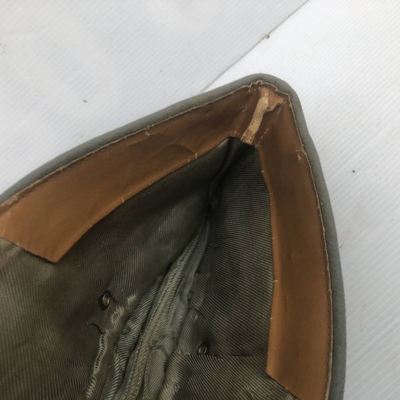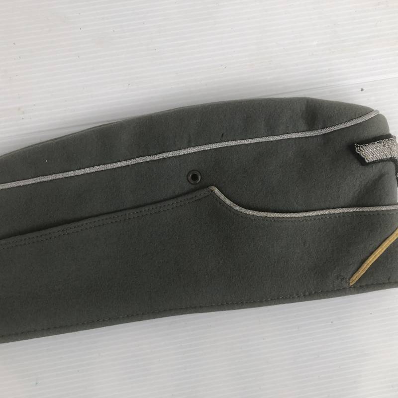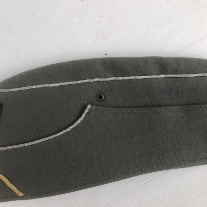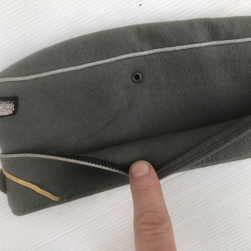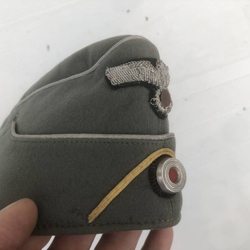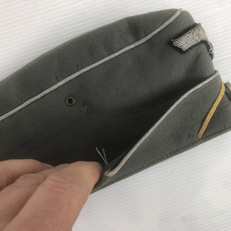 Trés beau calot modéle 1934 d'un officier des transmissions de la Heer . Calot en doeskin feldgrau . Belle fabrication soignée pour officir . Rabats en drap , aigle brodé cannetille argent , cocarde métallique . Soutache jaune citron montée d'origine de l'arme des transmission . Oeillets de ventilation . Intérieur doublé en satinette verte , bandeau frontal en carton cuir ( alkor) marron clair . Taille 59 . Calot 100 % dans son jus et intouché . Coiffure définitive en collection . Liseré peu courant Ref 19687