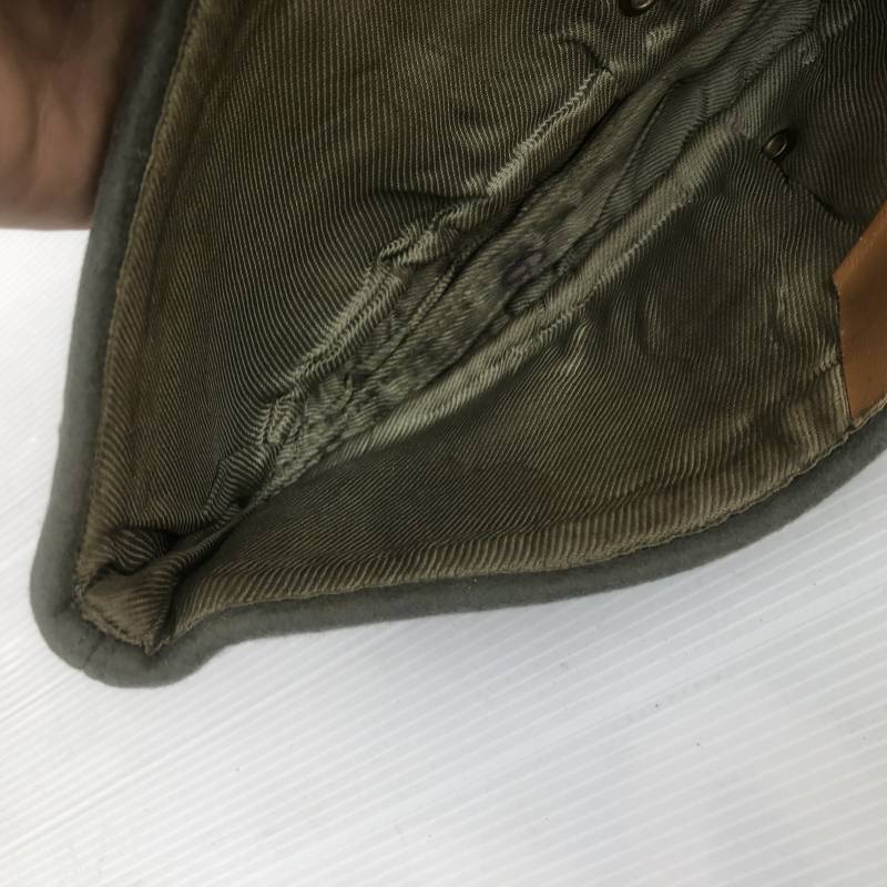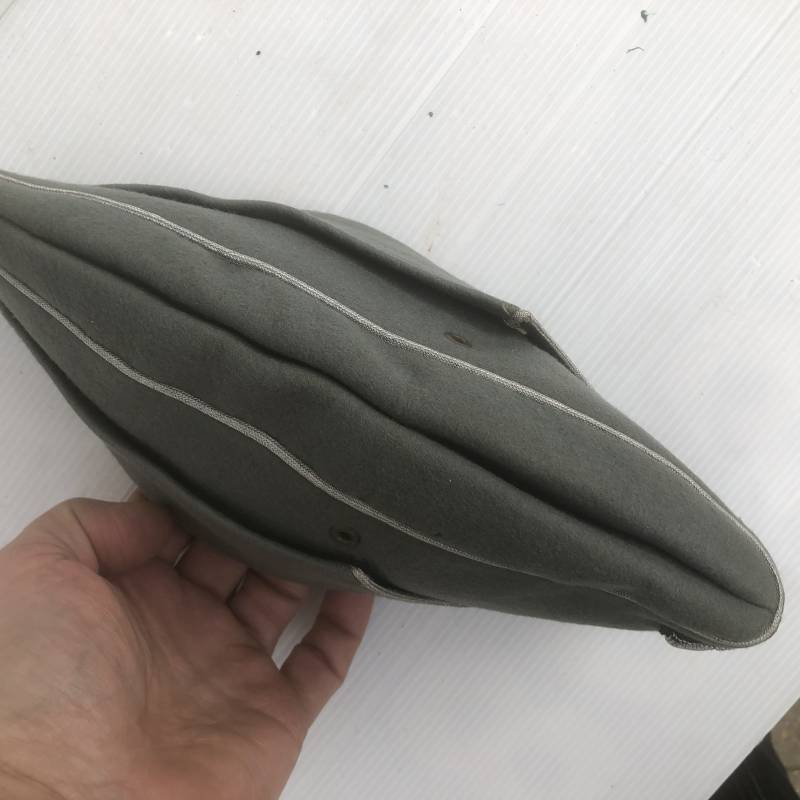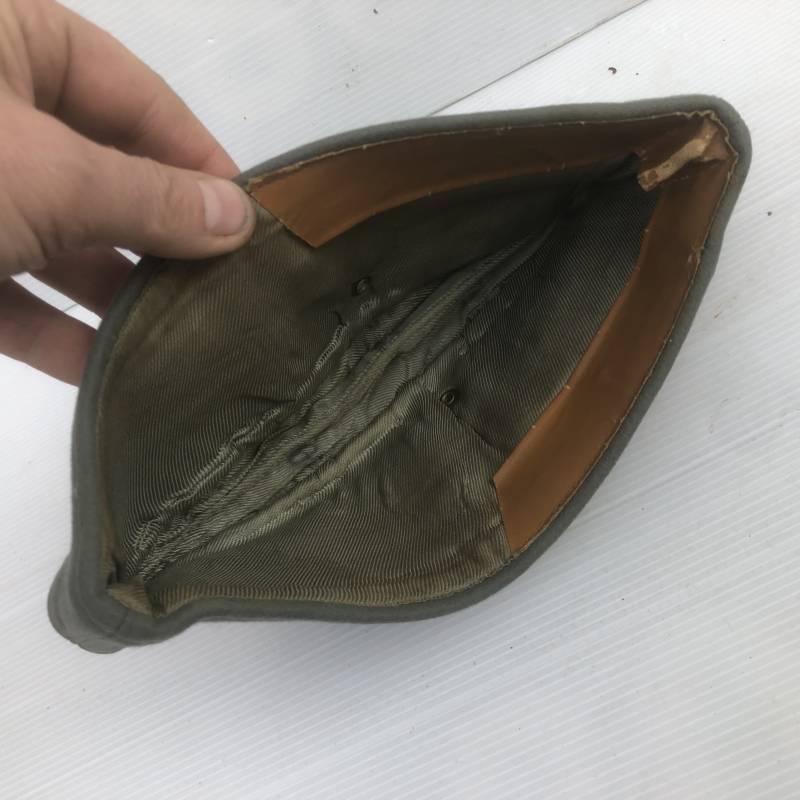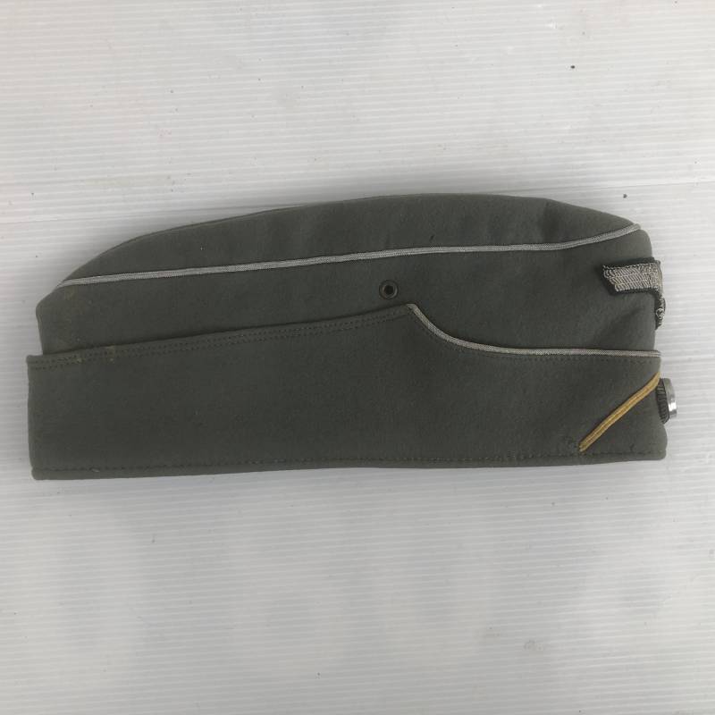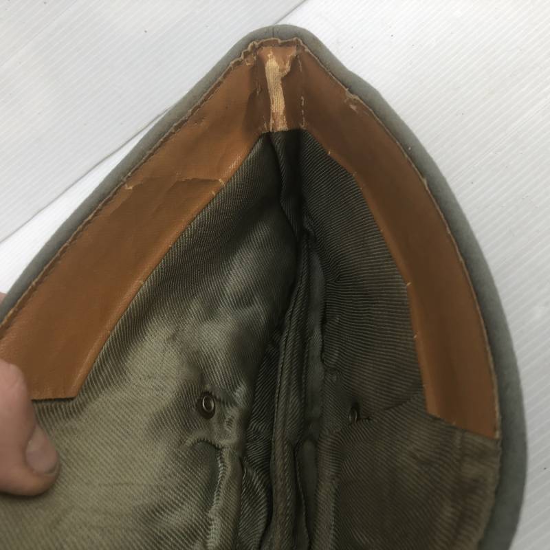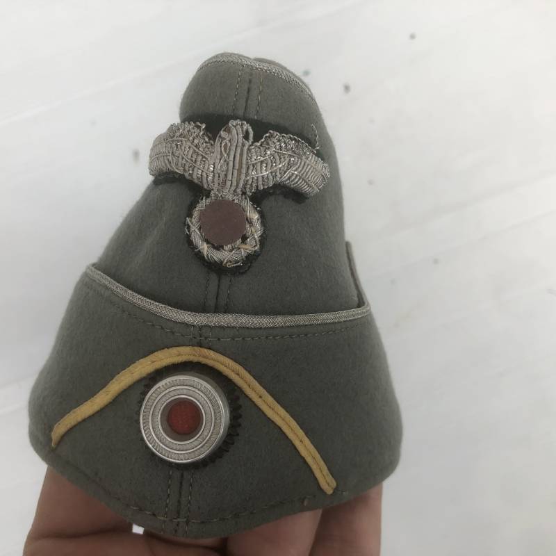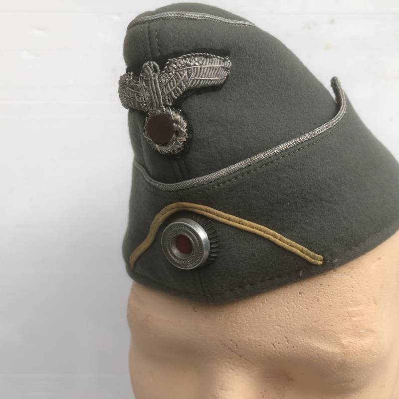 Trés beau calot modéle 1934 d'un officier des transmissions de la Heer . Calot en doeskin feldgrau . Belle fabrication soignée pour officir . Rabats en drap , aigle brodé cannetille argent , cocarde métallique . Soutache jaune citron montée d'origine de l'arme des transmission . Oeillets de ventilation . Intérieur doublé en satinette verte , bandeau frontal en carton cuir ( alkor) marron clair . Taille 59 . Calot 100 % dans son jus et intouché . Coiffure définitive en collection . Liseré peu courant Ref 19687